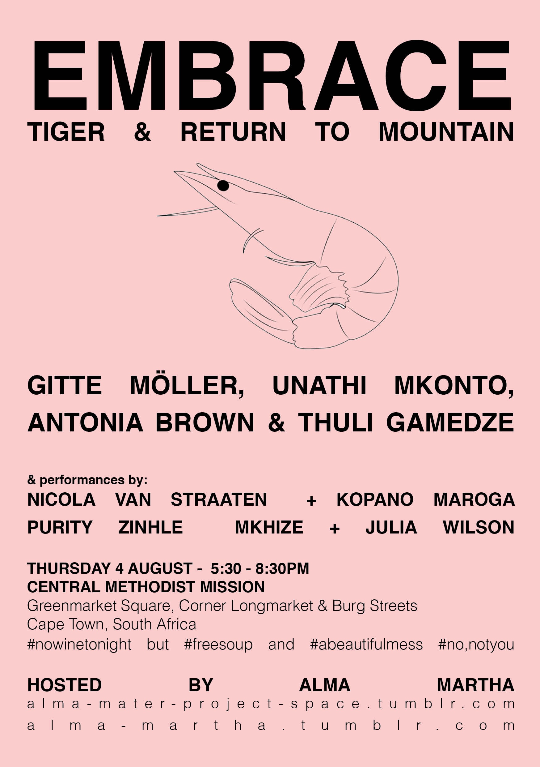 Poster: Embrace Tiger & Return to Mountain by Alma Martha, Central Methodist Mission, Cape Town, August 4, 2016. Image courtesy of Juliana Irene Smith.