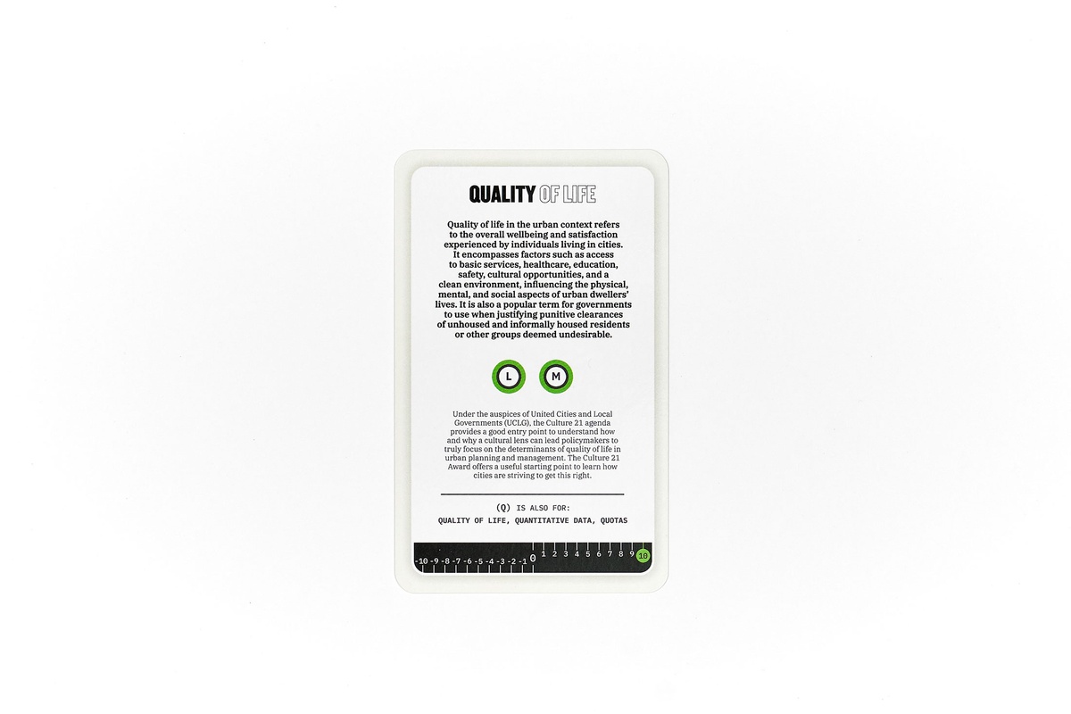 Card: Quality of Life (2024), Urban Canvas Deck Main, Shift Game Set Prototype. 8 x 13 cm. Image courtesy of A4 Arts Foundation.