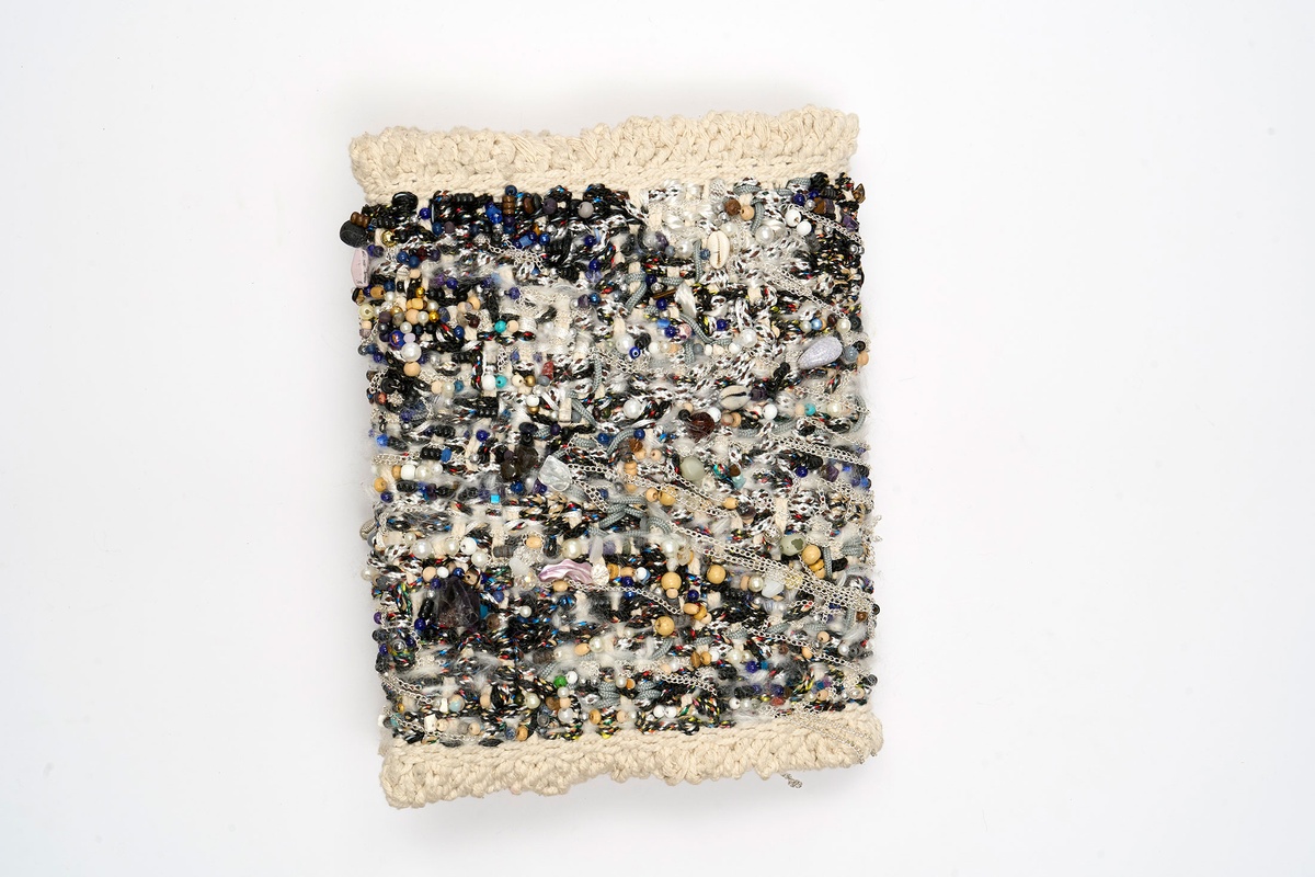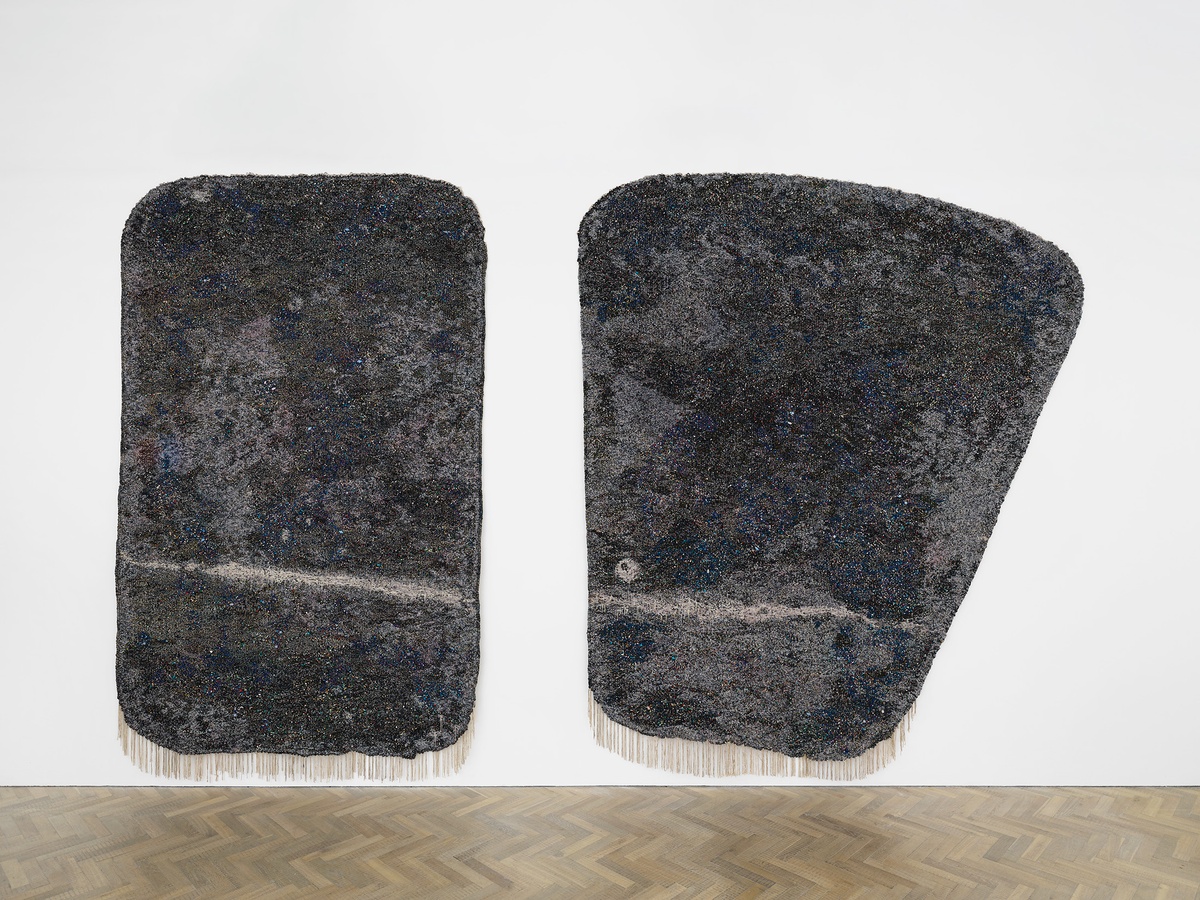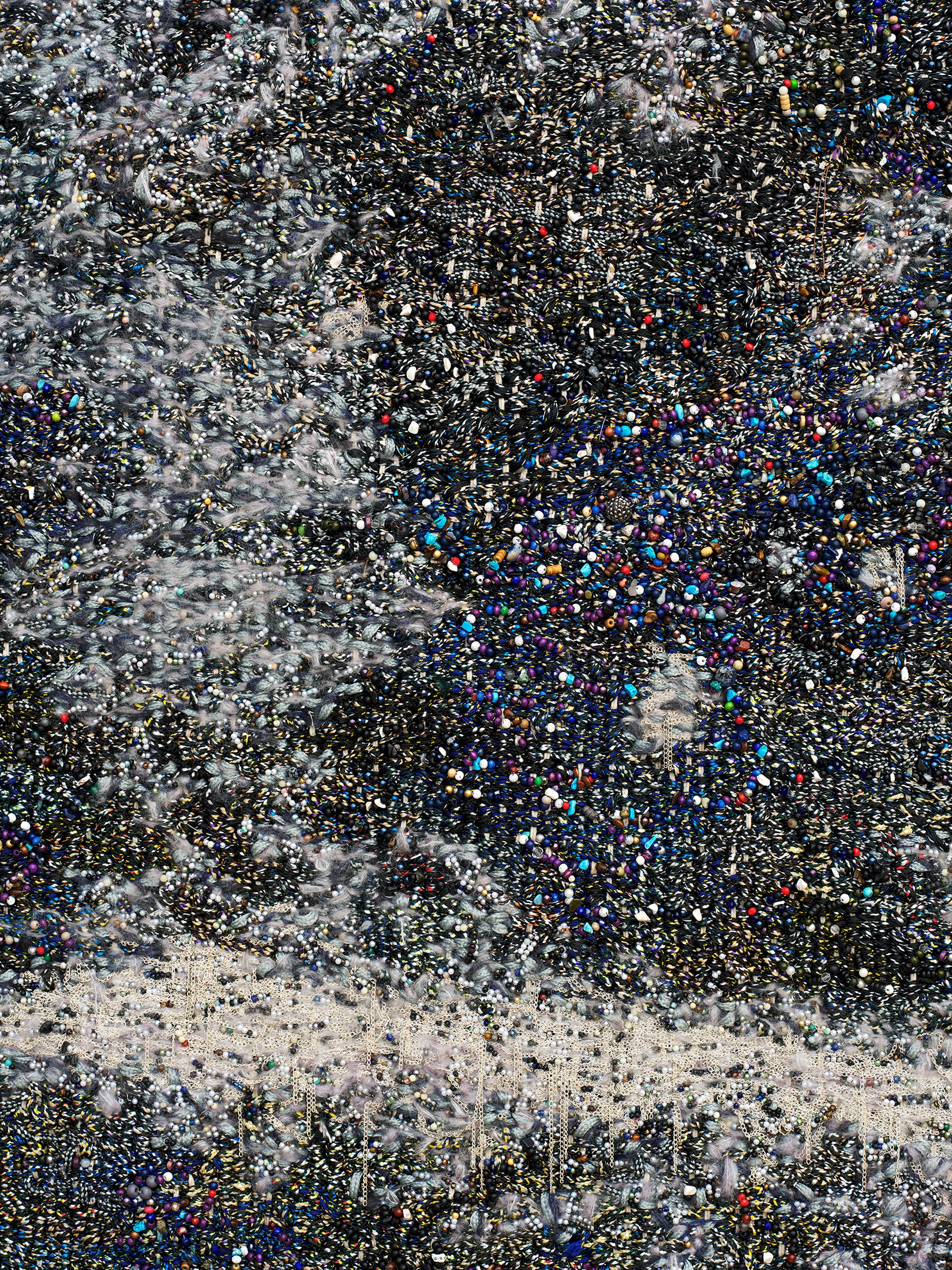 Artwork detail: Igshaan Adams, Sterverligte paadjie huis toe (2023). Cotton twine, polyester and nylon blend rope, mohair, plastic, glass, semi precious and wooden beads, tiger tail metal wire, silver link chain and fabric dyes. 360 x 567 cm. Courtesy and copyright of the artist and blank projects, Cape Town.