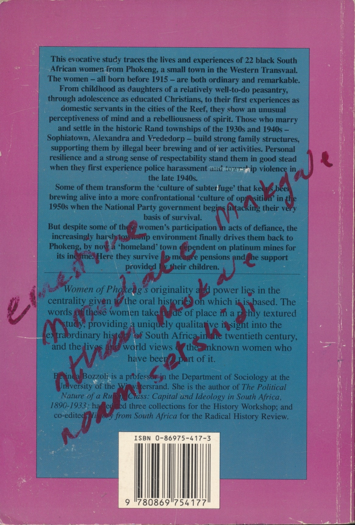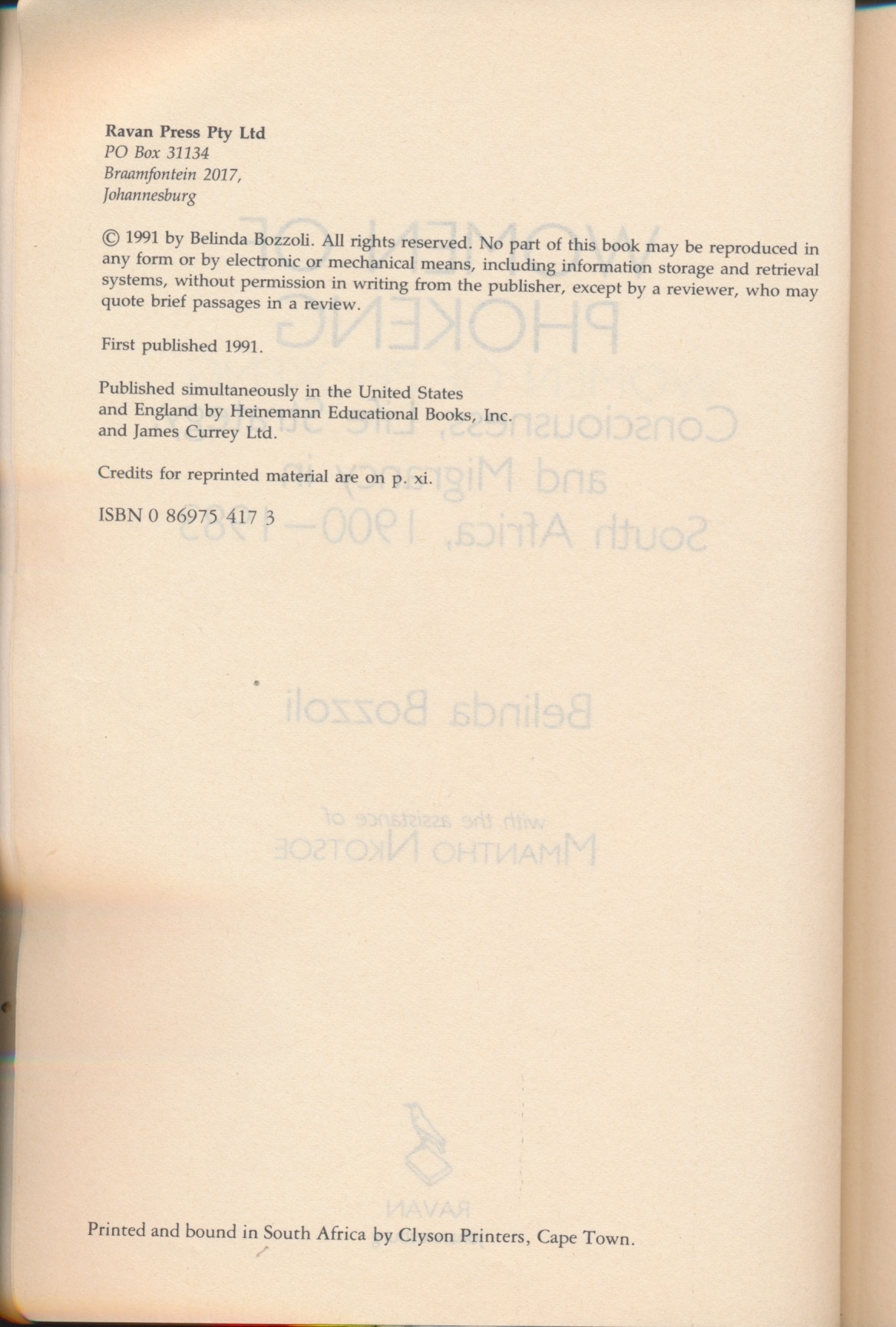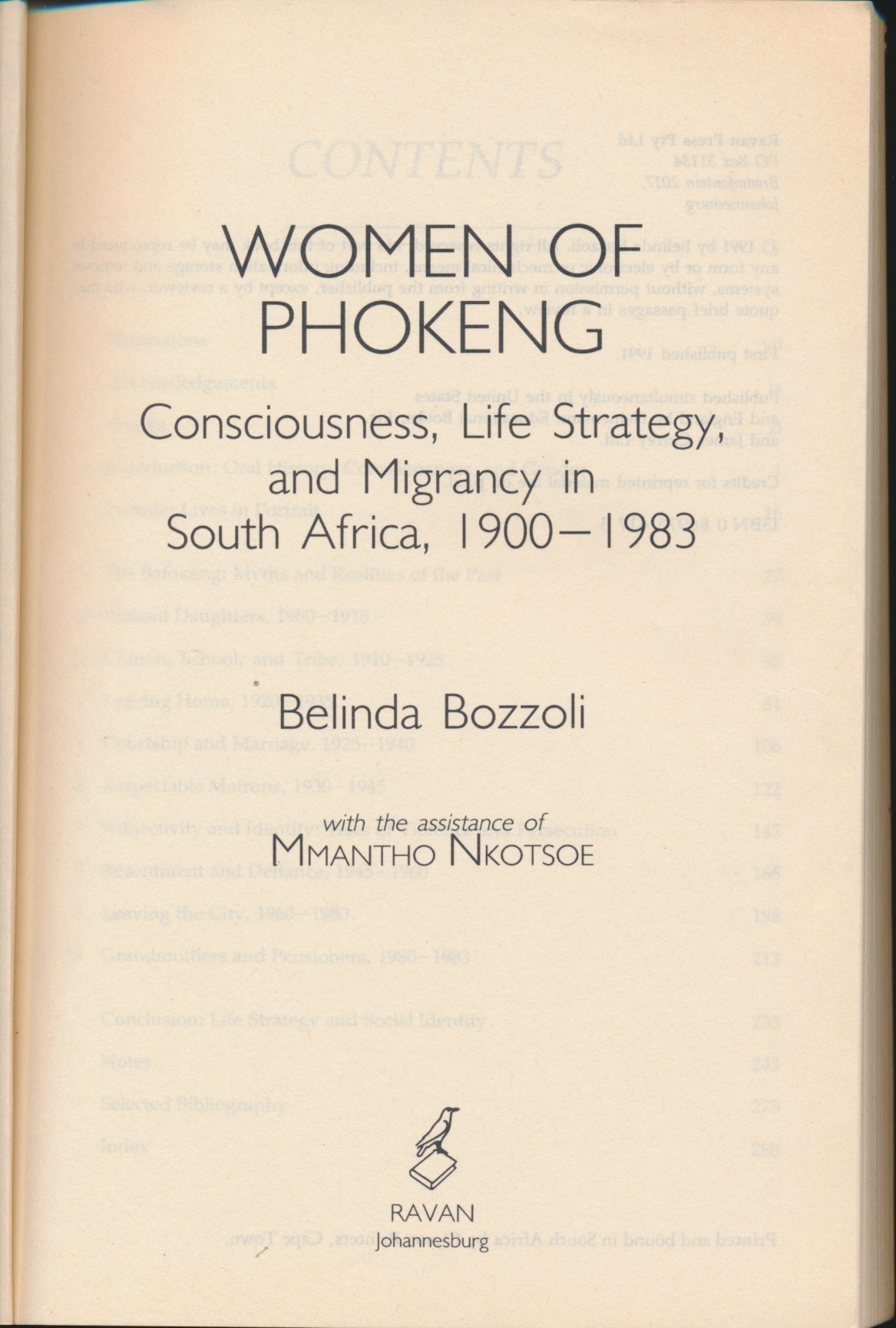 Bozzoli, B. and Nkotsoe, M. (1991) Women of Phokeng: Consciousness, life strategy, and migrancy in South Africa 1900-1983. Johannesburg: Ravan Press.