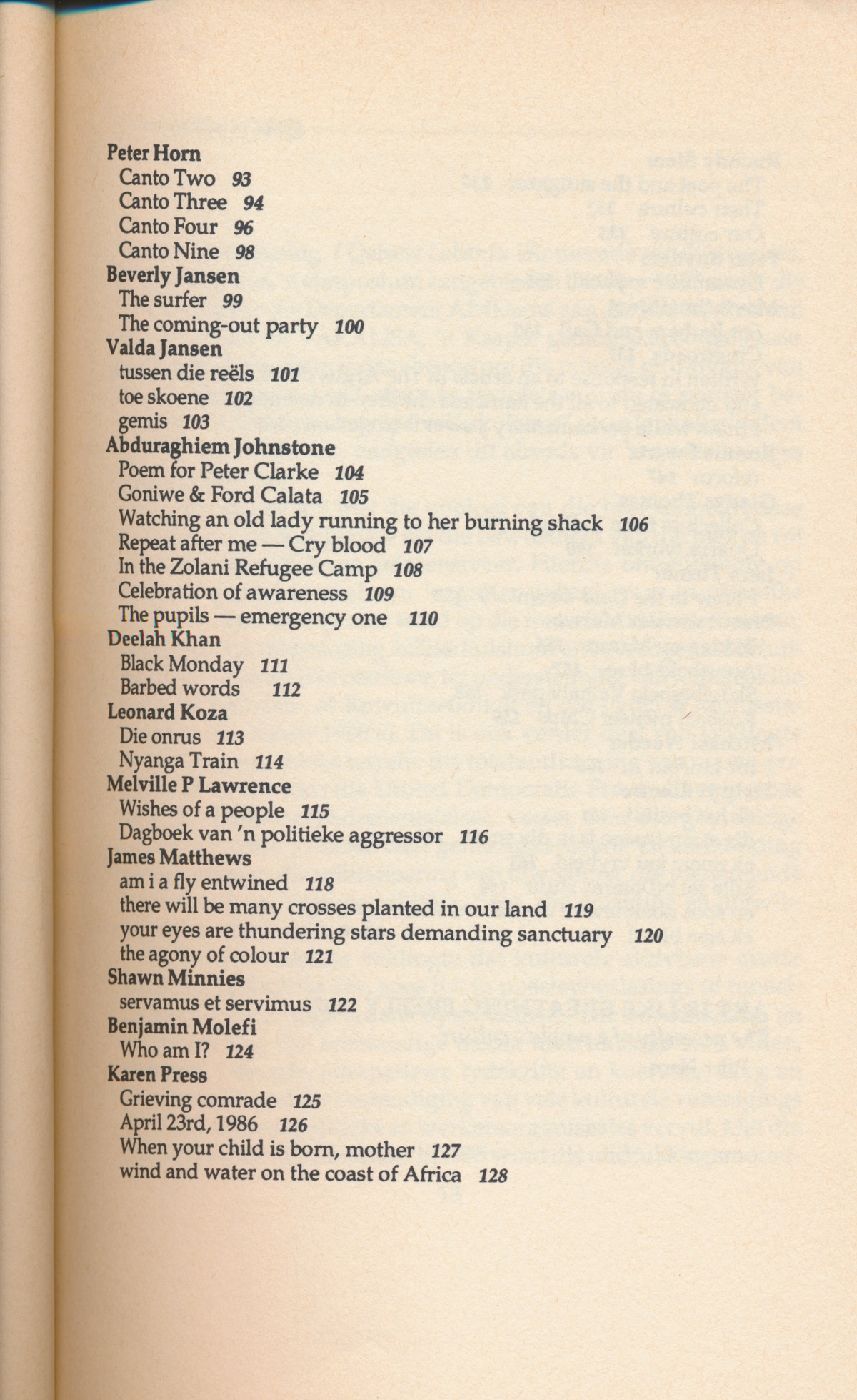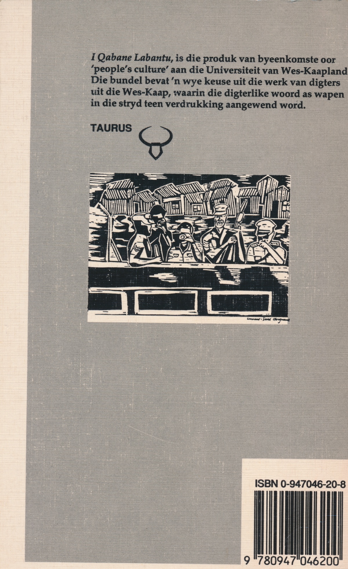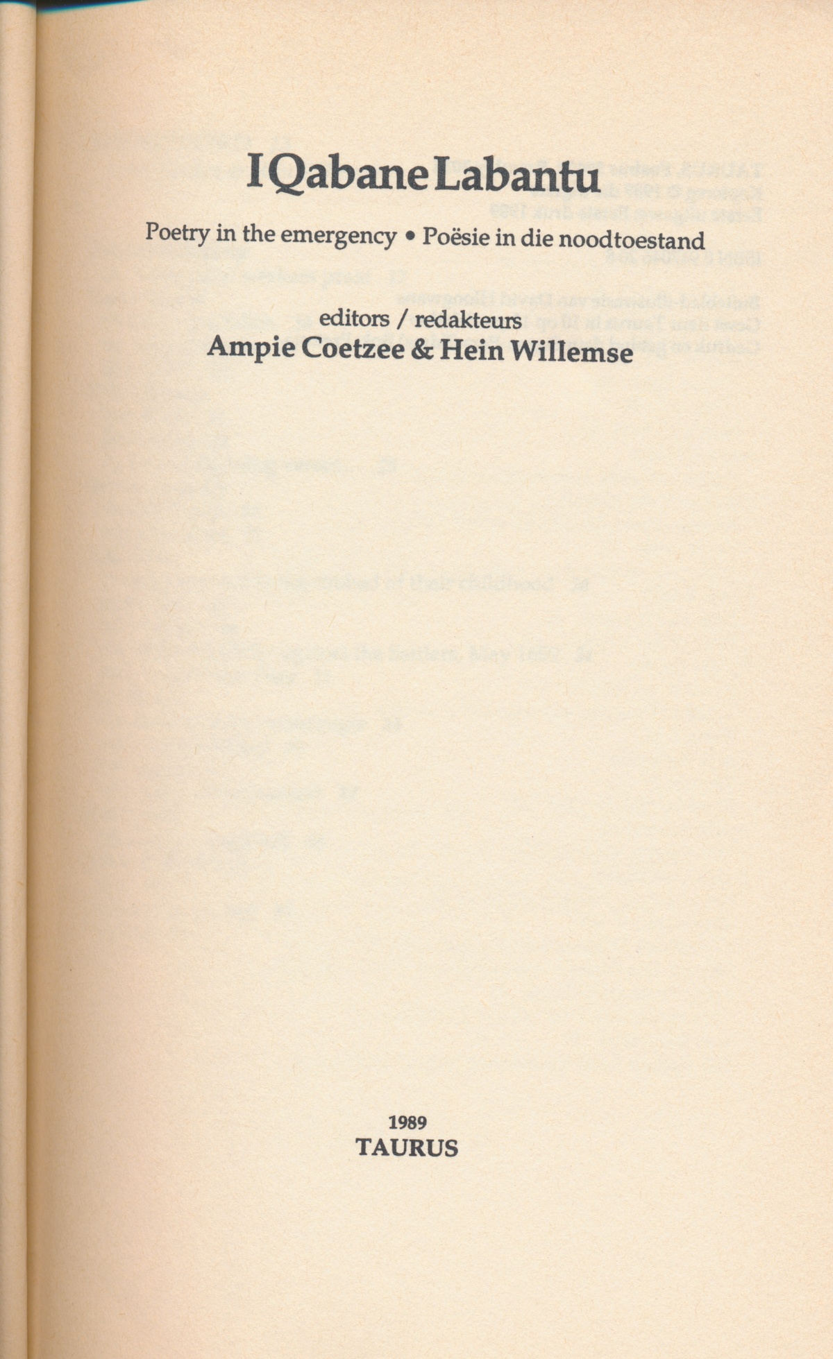 Coetzee, A. and Willemse, H. (eds.) (1989) I Qabane Labantu: Poetry in the Emergency. Johannesburg: Taurus Publishers.