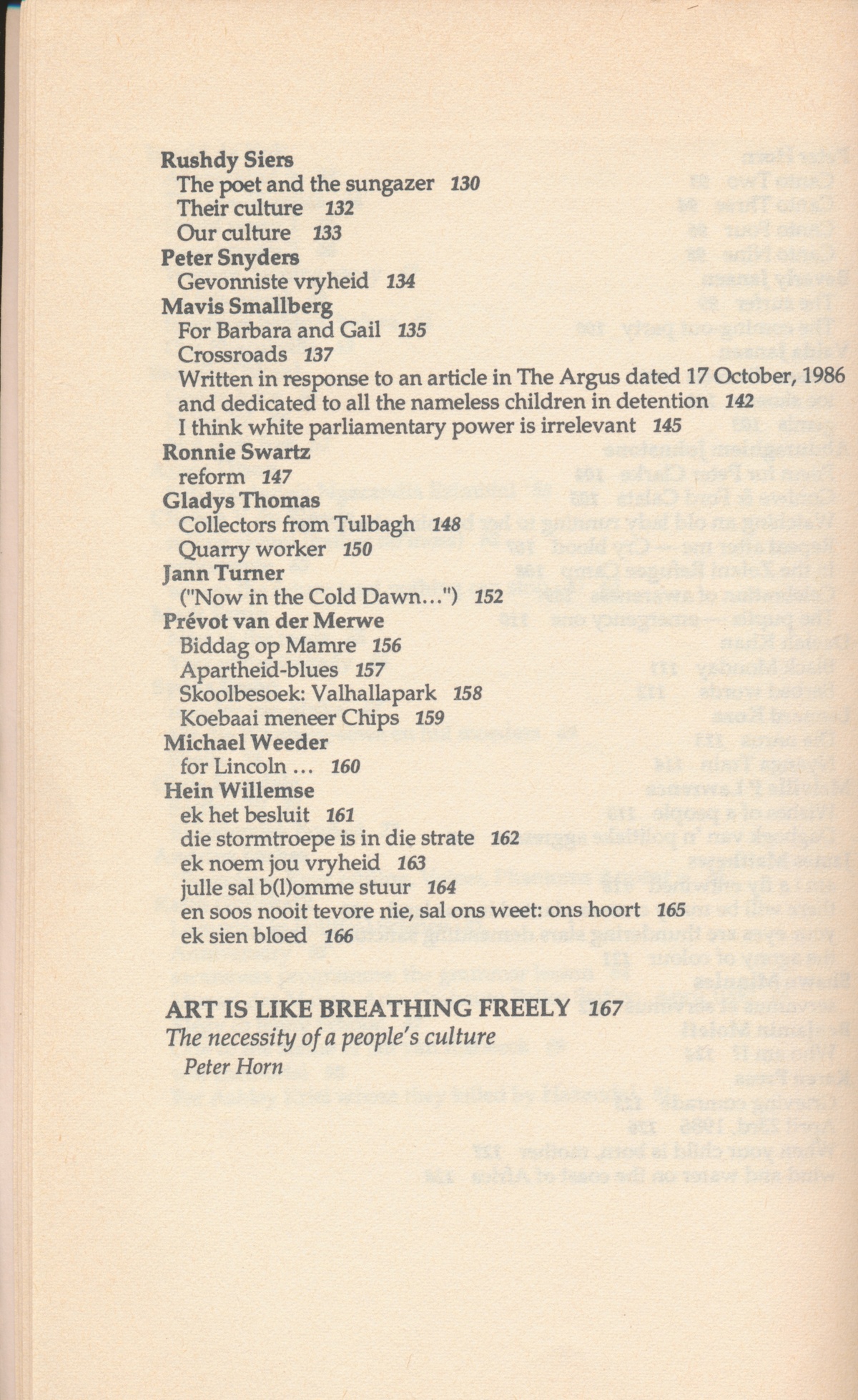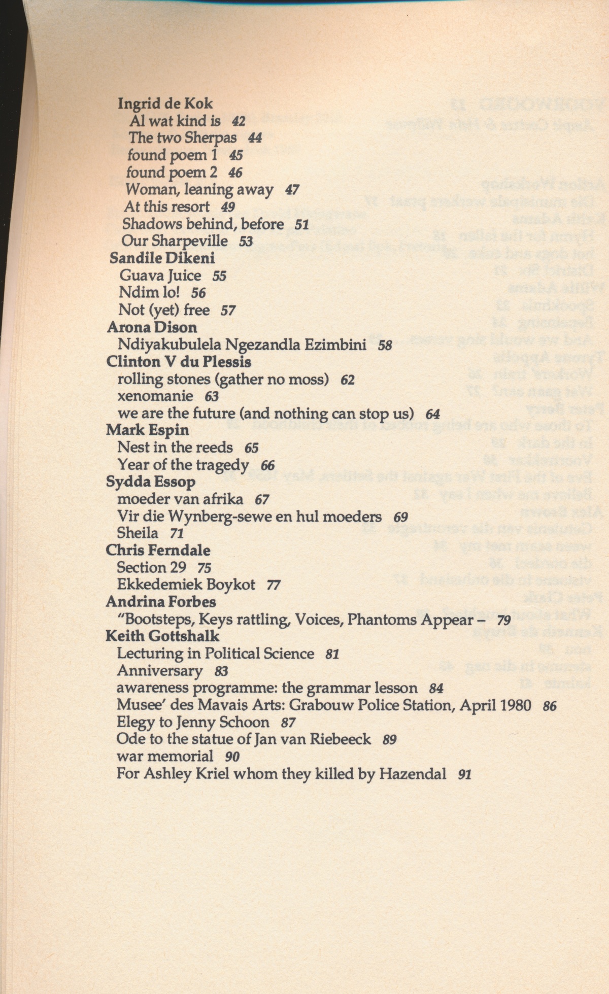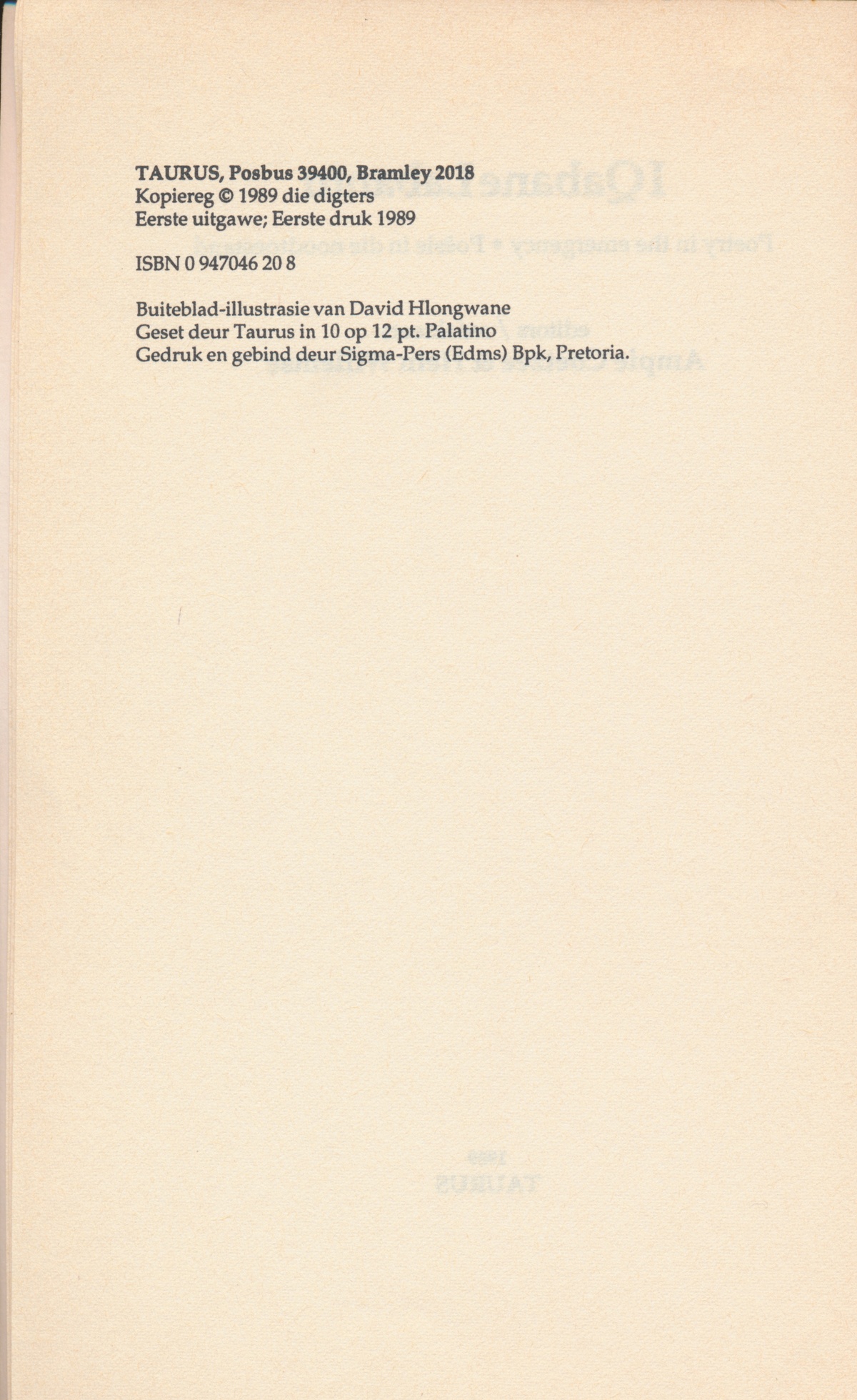 Coetzee, A. and Willemse, H. (eds.) (1989) I Qabane Labantu: Poetry in the Emergency. Johannesburg: Taurus Publishers.
