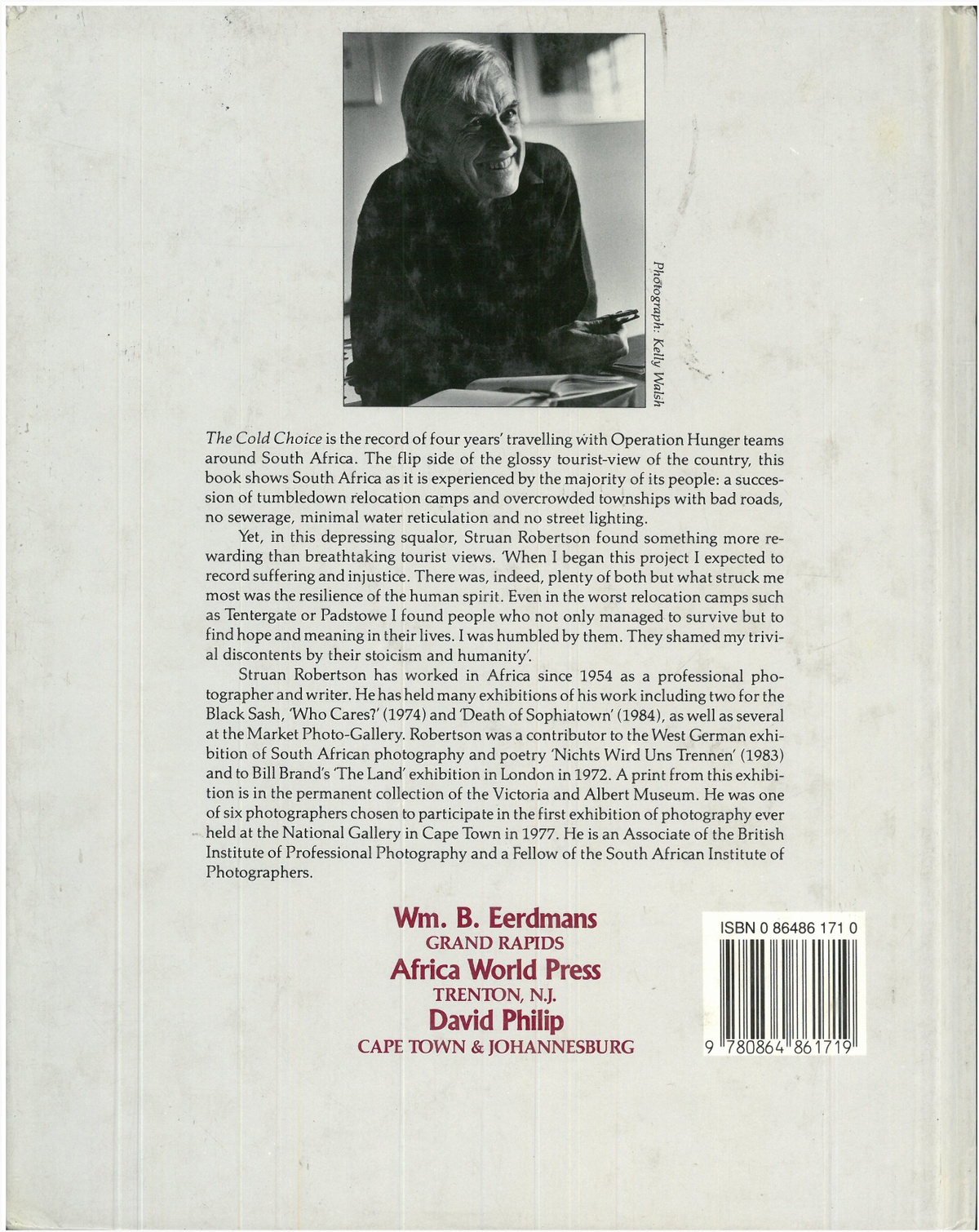 Robertson, S. (1991) The Cold Choice: Pictures of a South African reality. Cape Town and Johannesburg: David Philip (Pty) Ltd.