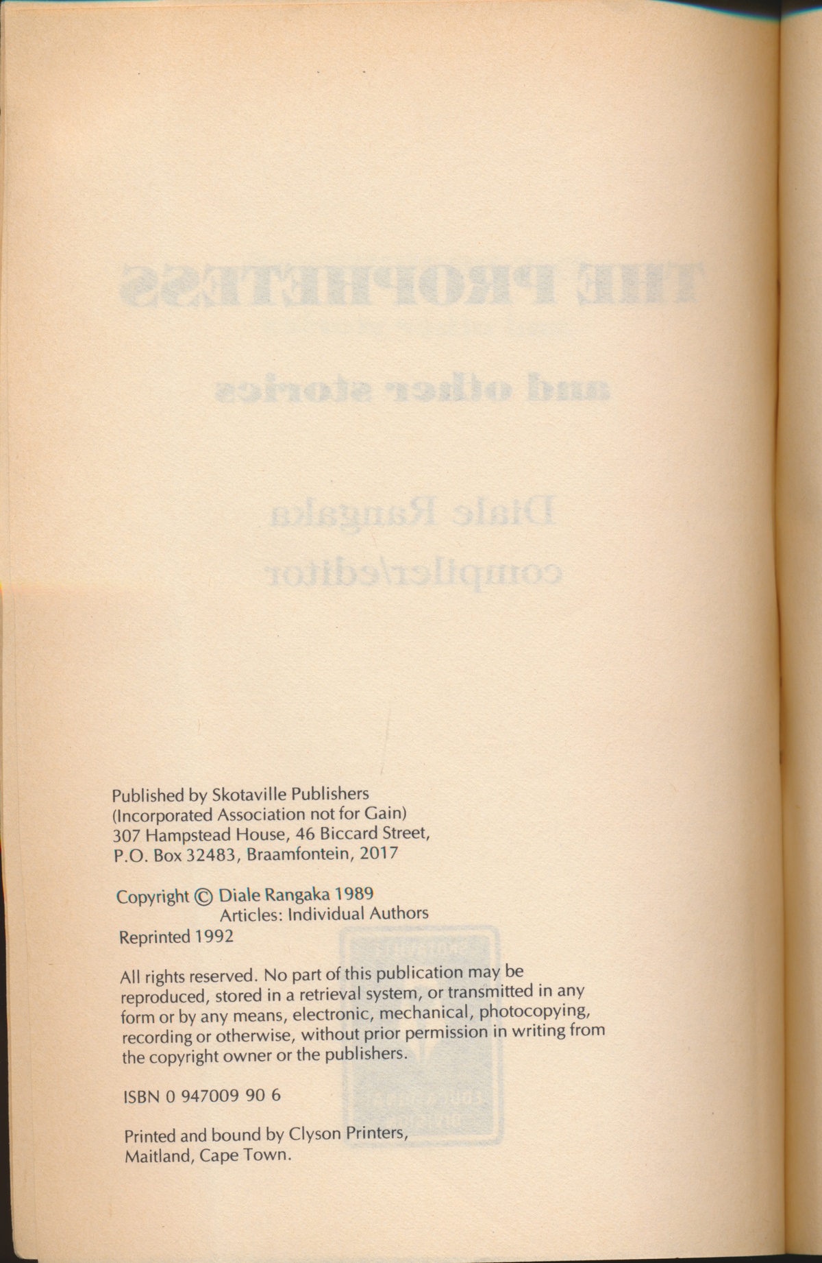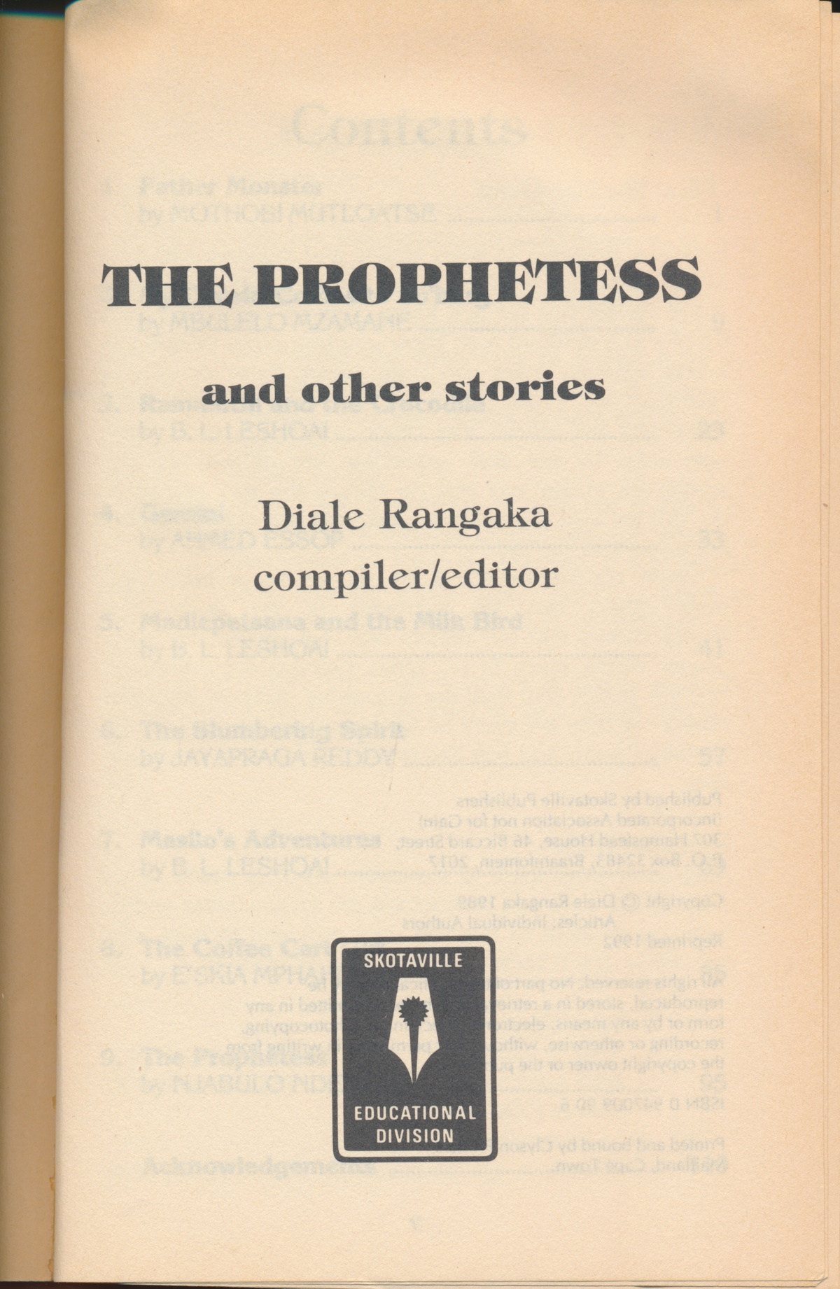 Rangaka, D. (eds.) (1992) The Prophetess: A Collection of Short Stories for Secondary Schools. Johannesburg: Skotaville Publishers.