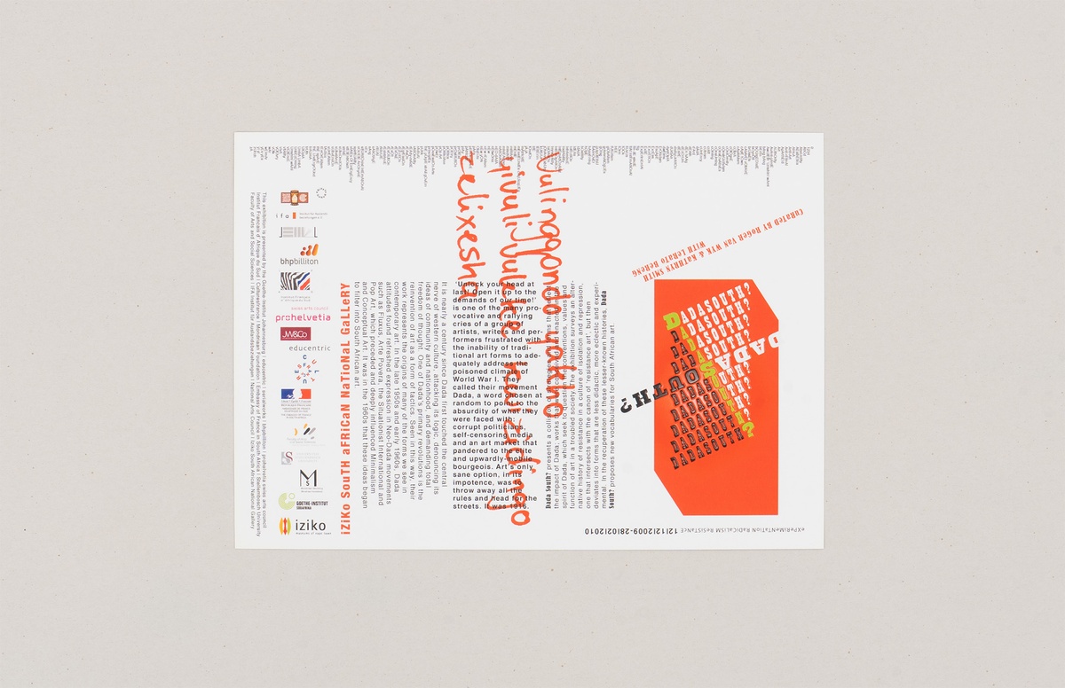 Flyer: Smith, K. & Van Wyk, R. (2009) Dada South? Exhibition invitation. Designed by Christian Nerf. 14.8 x 21 cm. Image courtesy of A4 Arts Foundation.