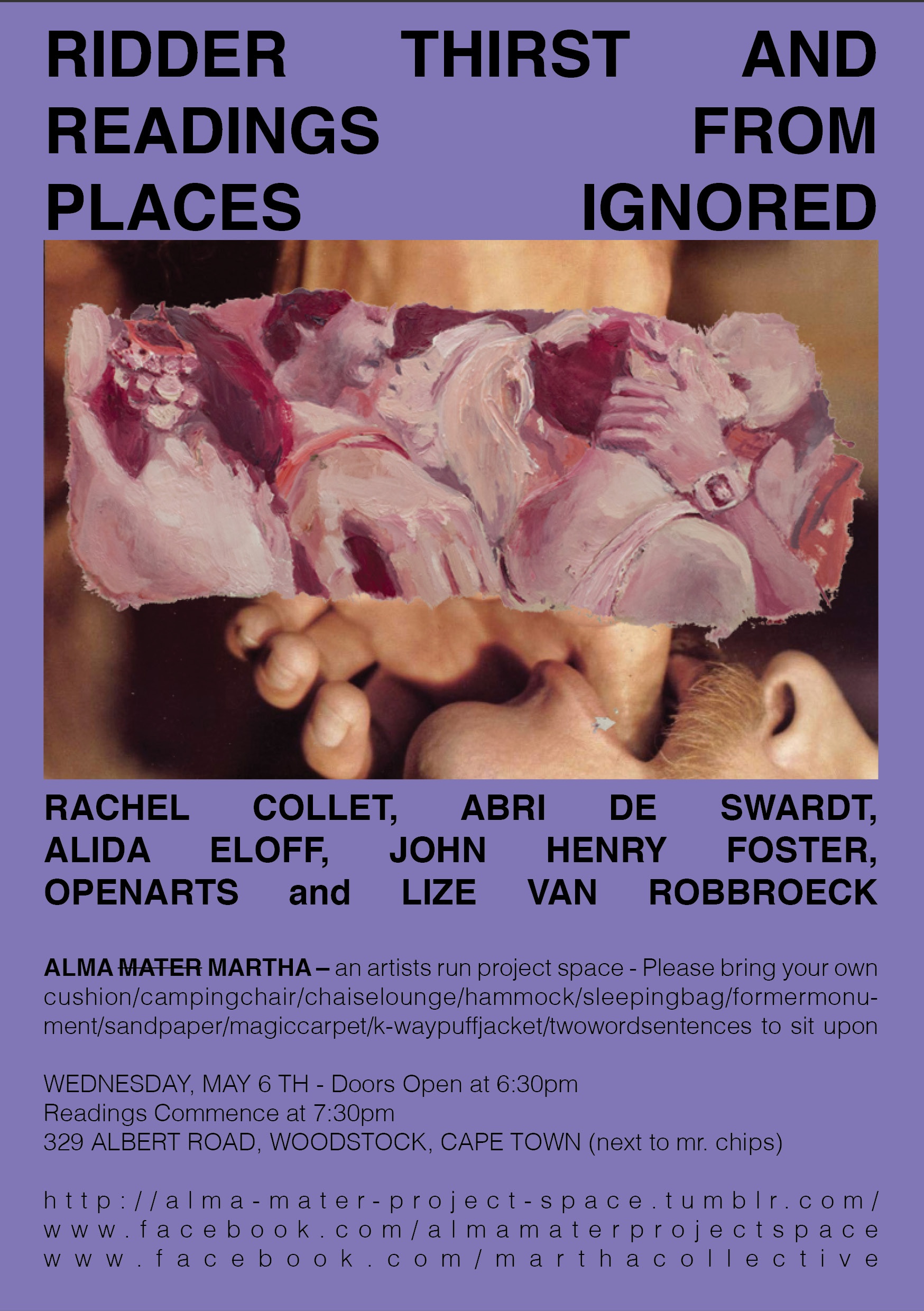 Poster: Ridder Thirst and Readings From Places Ignored by Alma Martha, Woodstock, Cape Town, February 11, 2015. Image courtesy of Juliana Irene Smith.