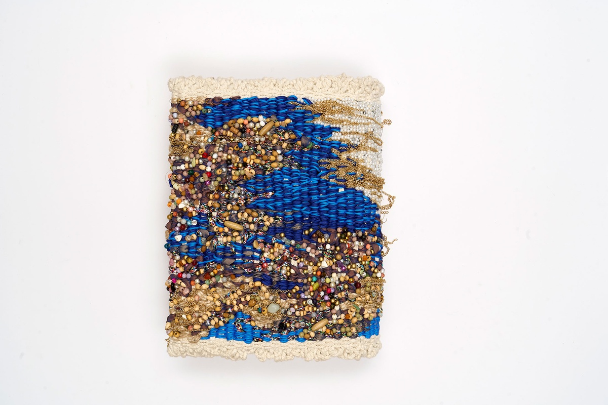 Cotton twine, polypropylene, polyester and braided rope, wooden, plastic, glass and stone beads, silk fabric, gold chain and tiger tail wire