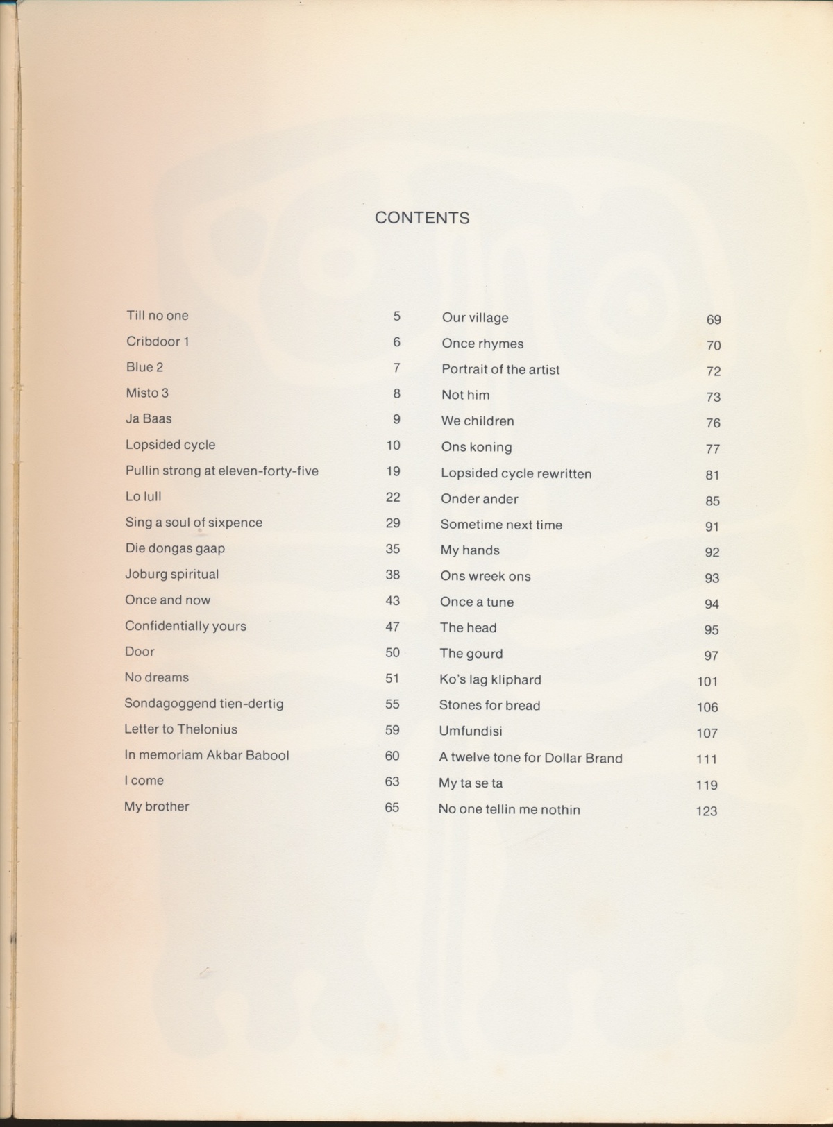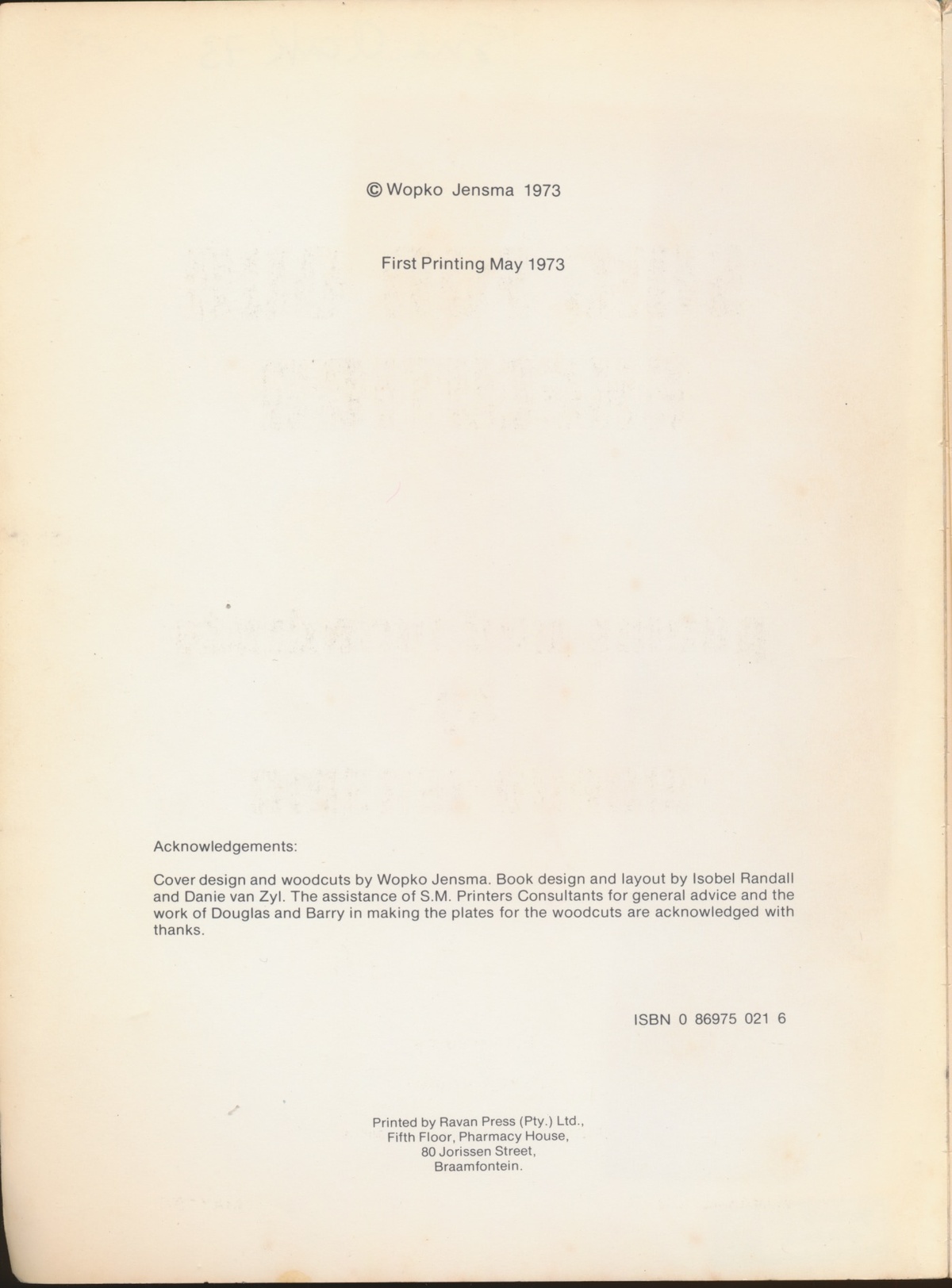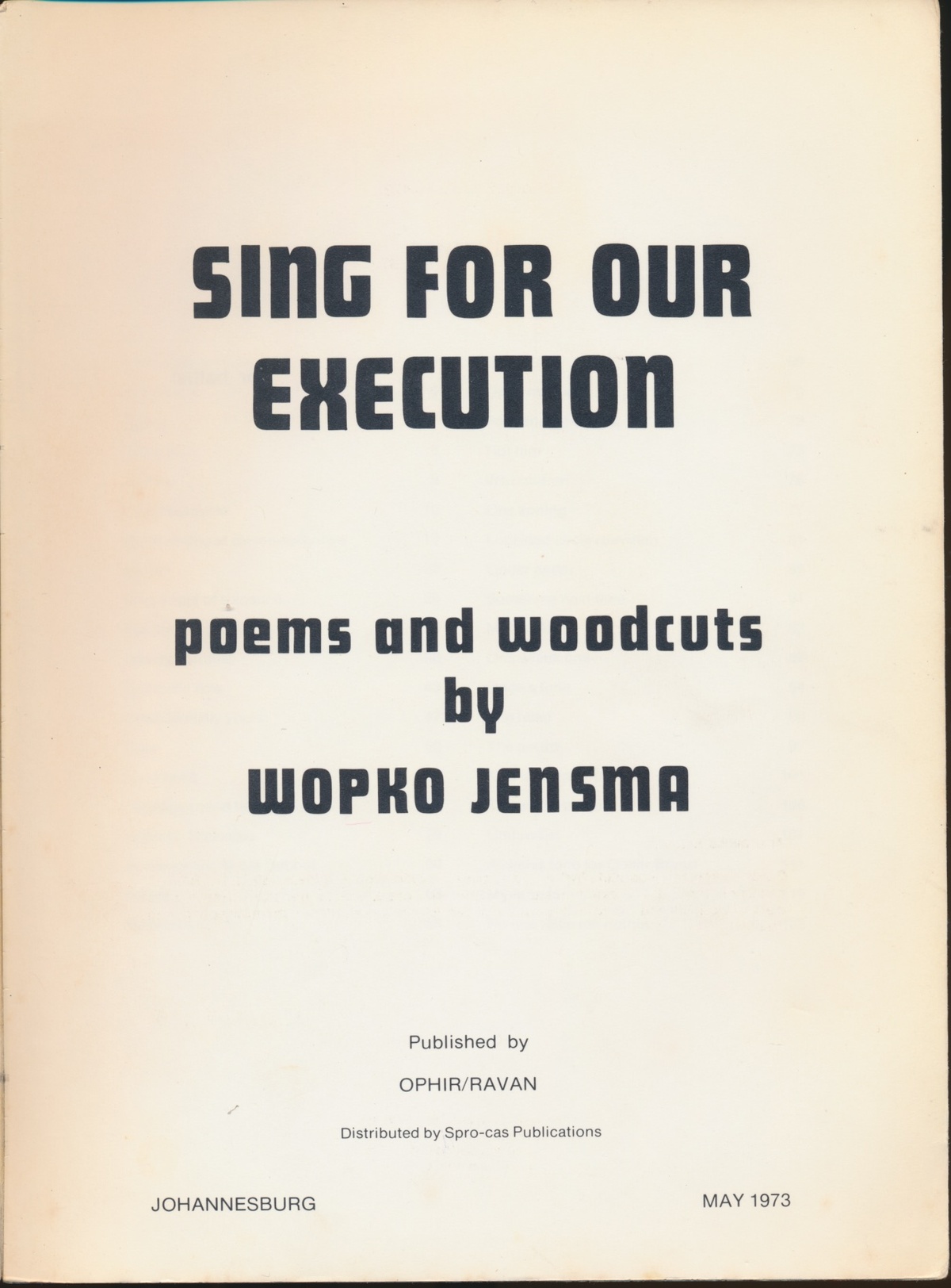 Jensma, W. (1973) Sing for Our Execution: Poems and woodcuts by Wopko Jensma. Johannesburg: Ravan Press.