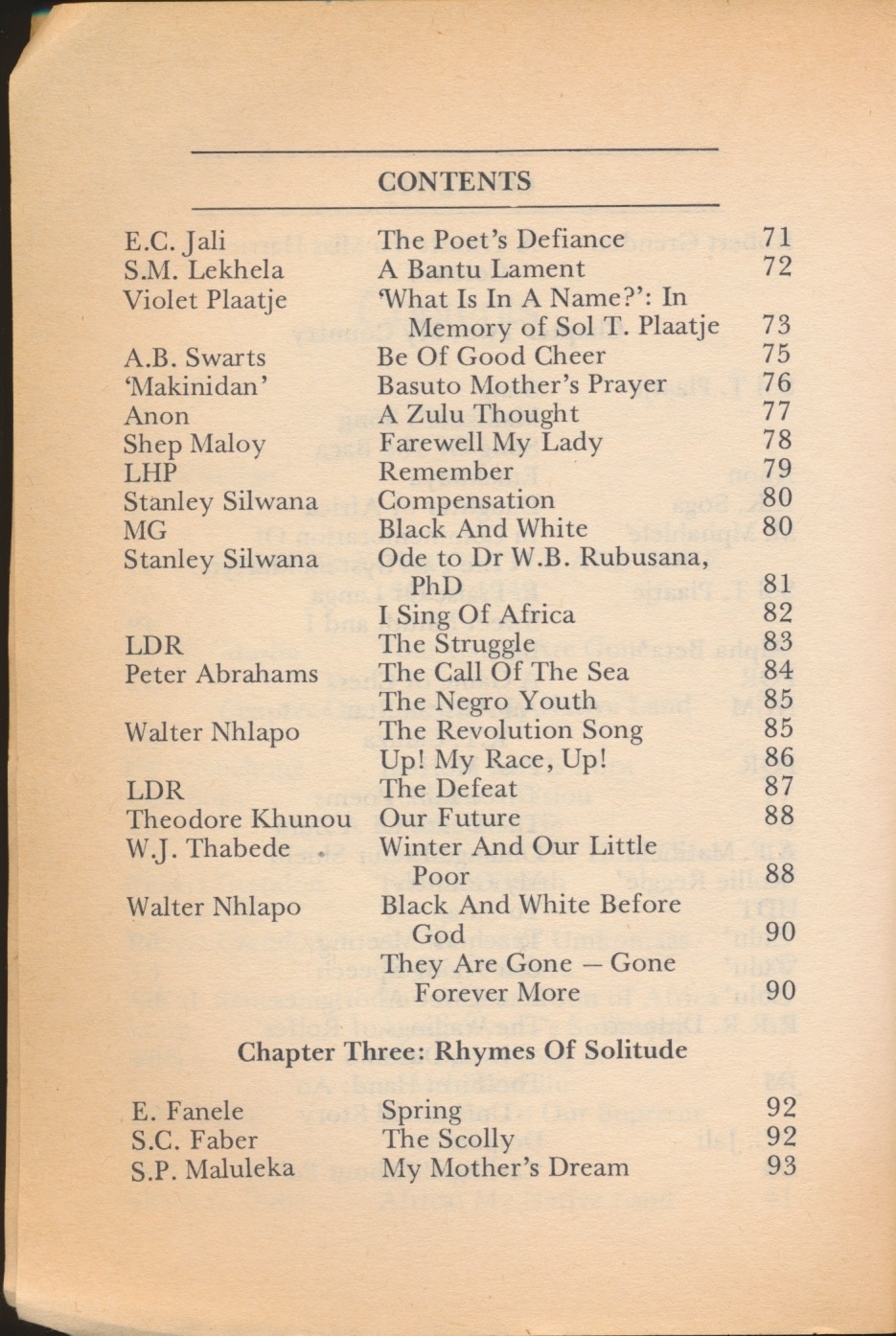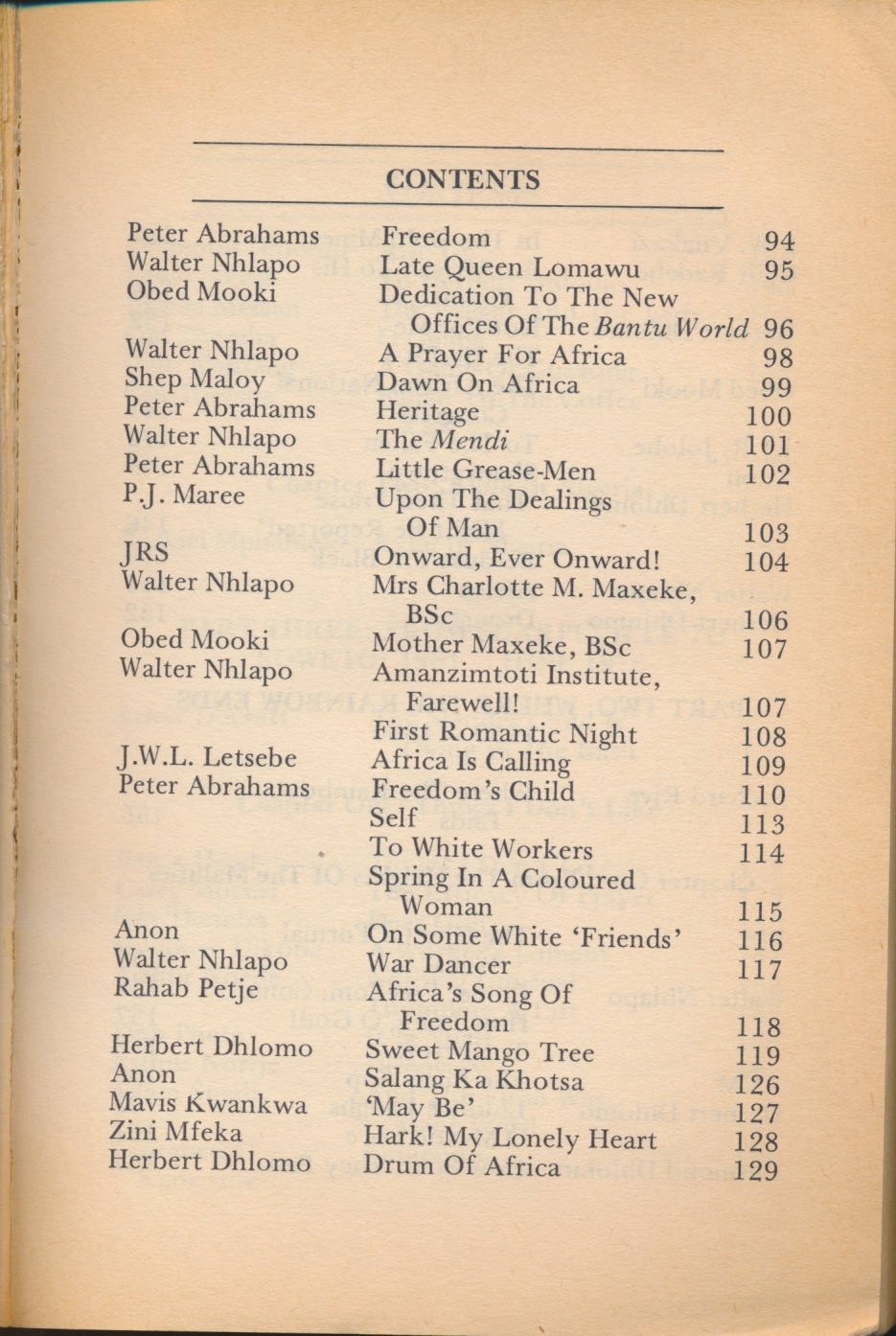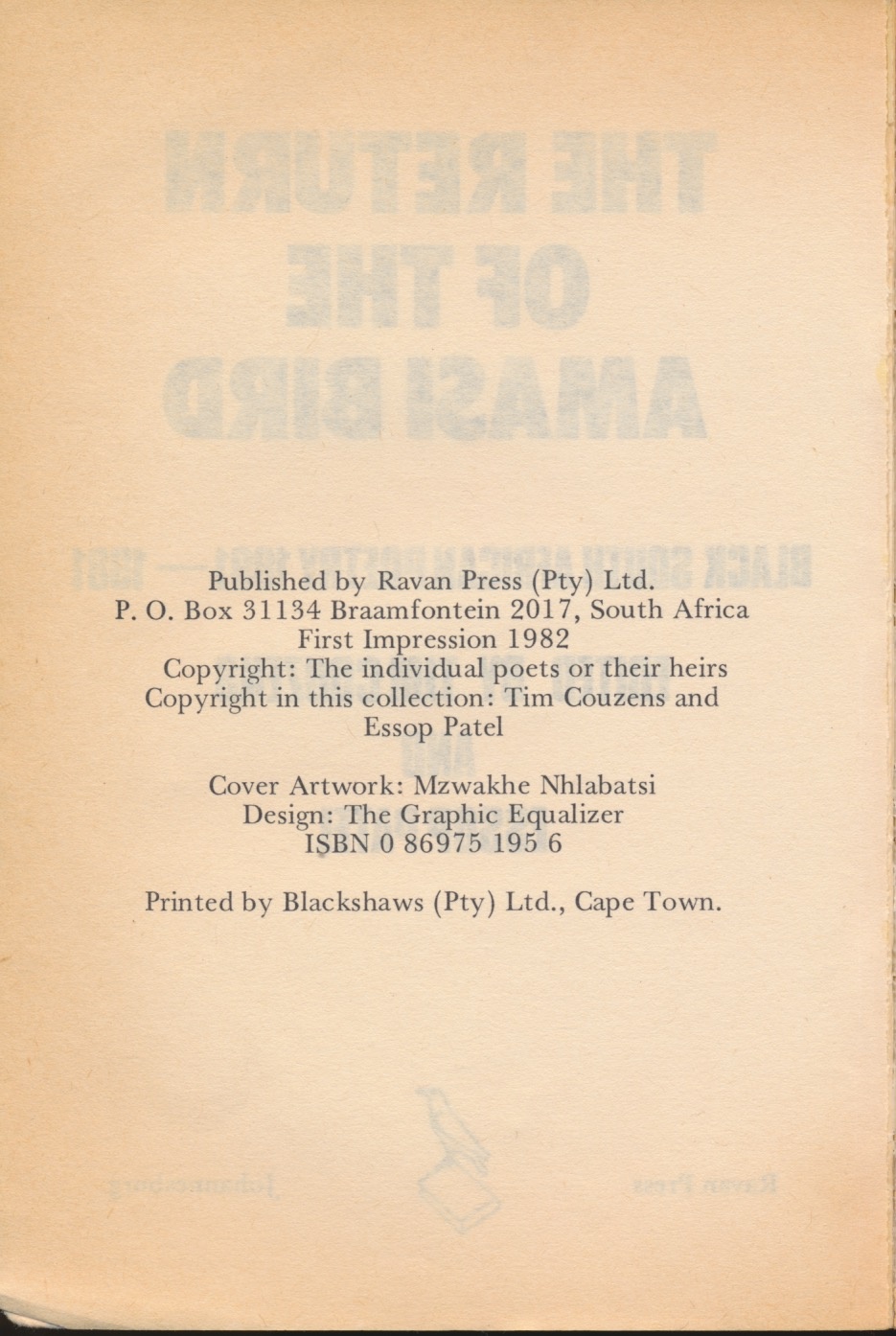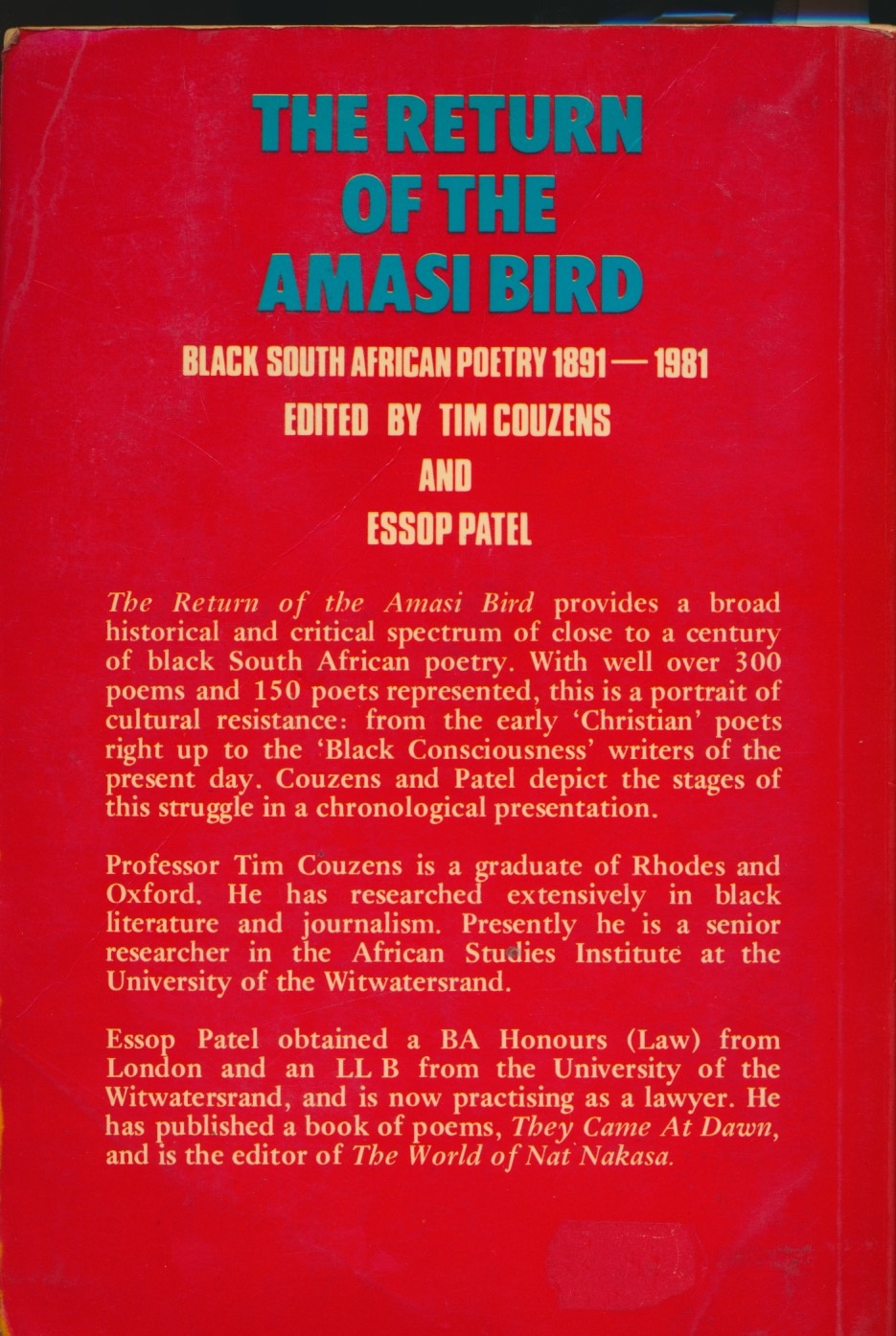 Couzens, T. and Patel, E. (1982) The Return of the Amasi Bird: Black South African Poetry 1891–1981. Johannesburg: Ravan Press.