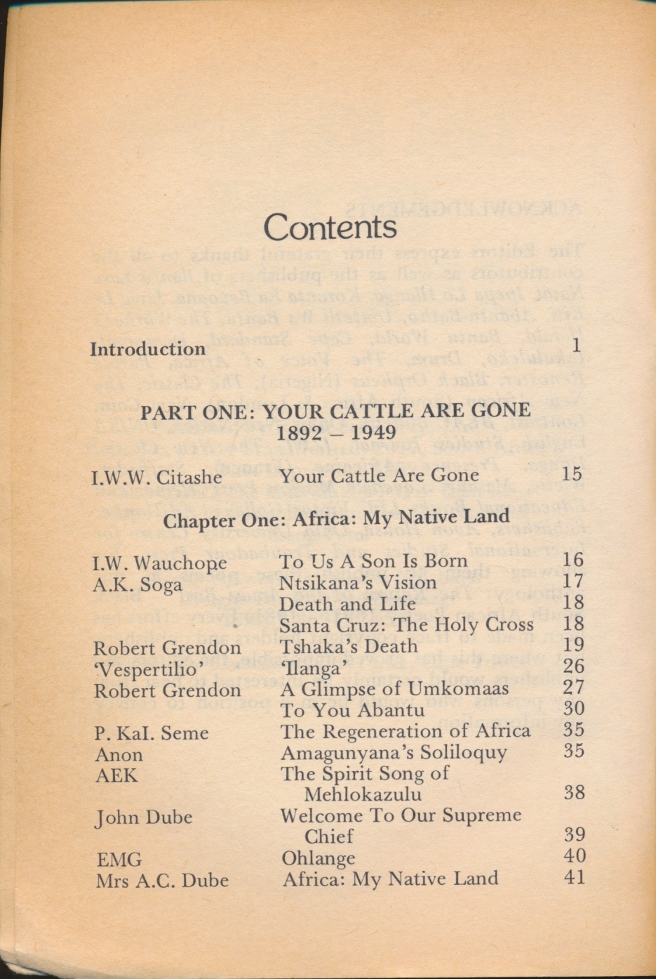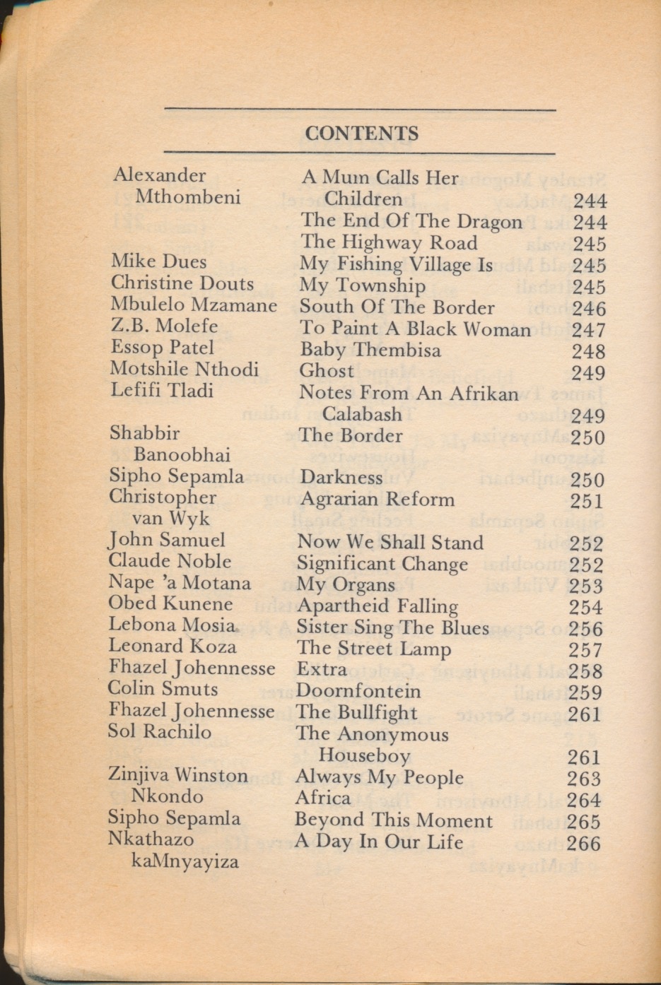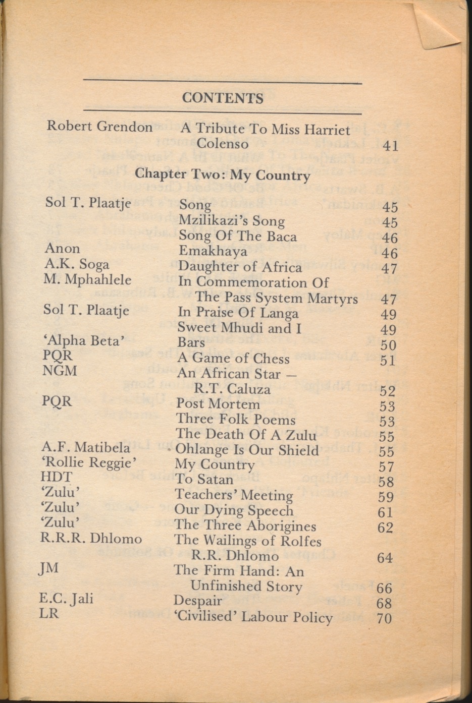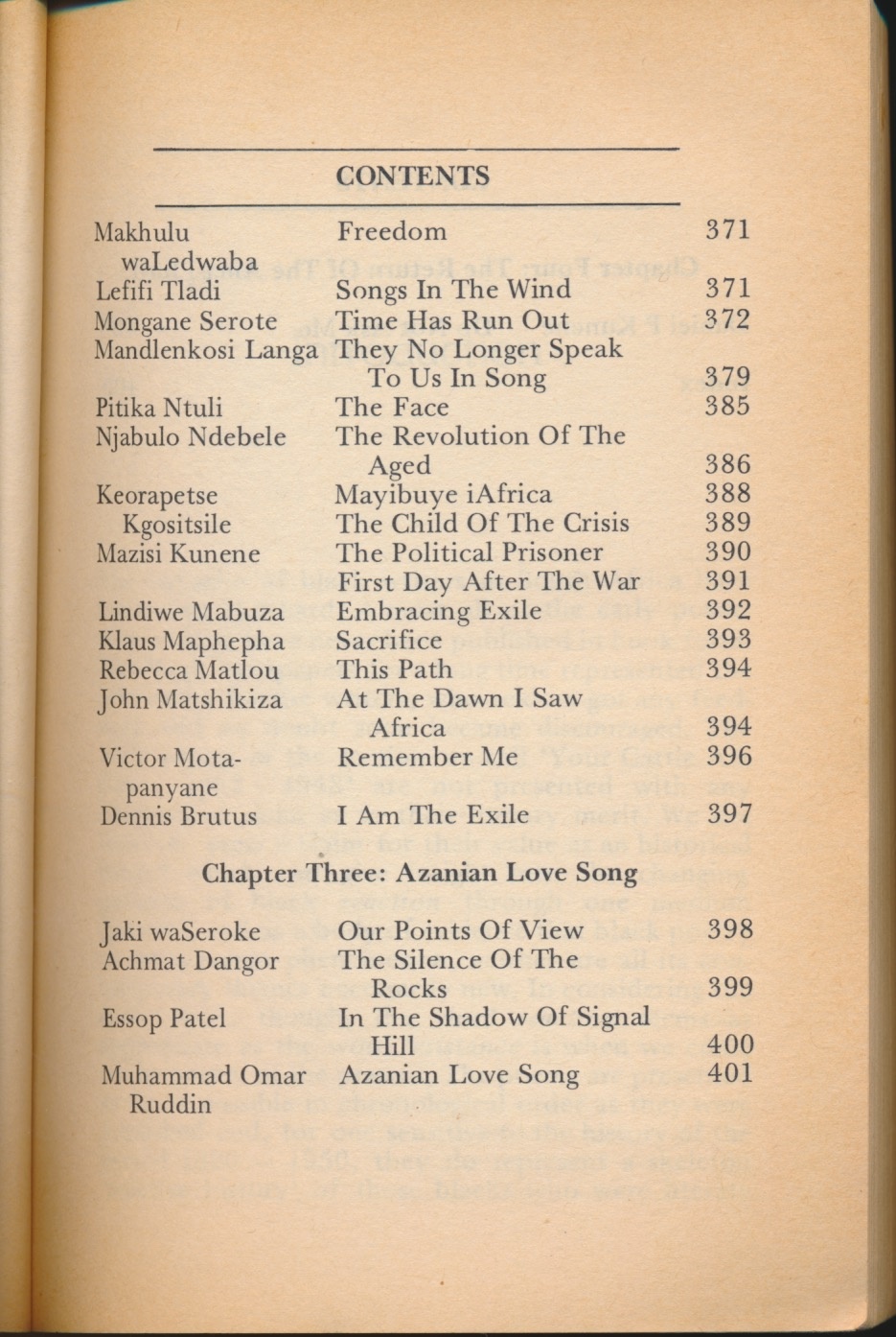 Couzens, T. and Patel, E. (1982) The Return of the Amasi Bird: Black South African Poetry 1891–1981. Johannesburg: Ravan Press.