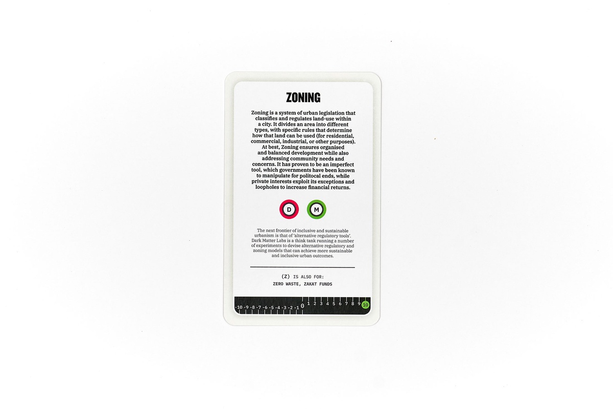 Card: Zoning (2024), Urban Canvas Deck Main, Shift Game Set Prototype. 8 x 13 cm. Image courtesy of A4 Arts Foundation.