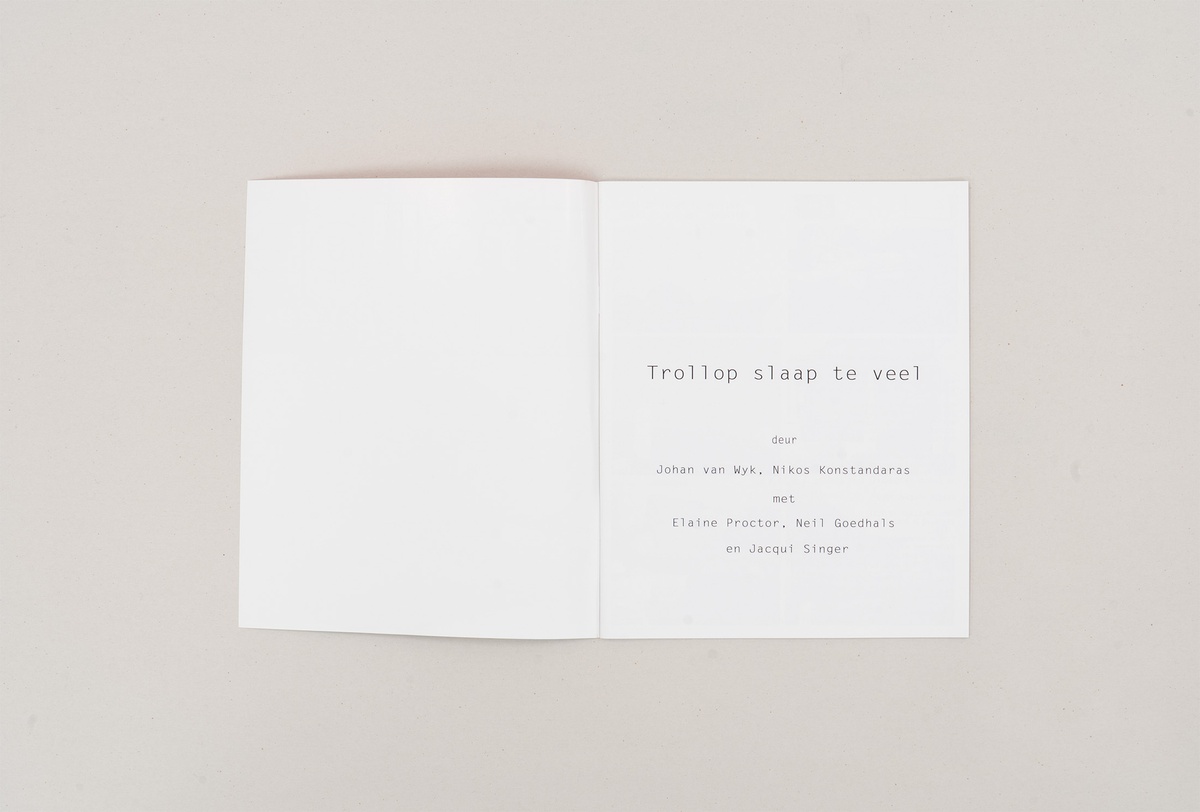 Publication: Konstandaras, N. & Van Wyk, J. et al. (1982/2009) Trollop slaap te veel. 21 x 17 cm. Johannesburg: Kabelkarnimf. Private collection. Image courtesy of A4 Arts Foundation.