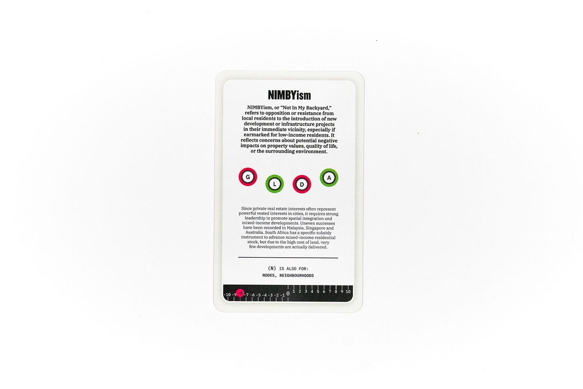 Card: NIMBYism (2024), Urban Canvas Deck Main, Shift Game Set Prototype. 8 x 13 cm. Image courtesy of A4 Arts Foundation.