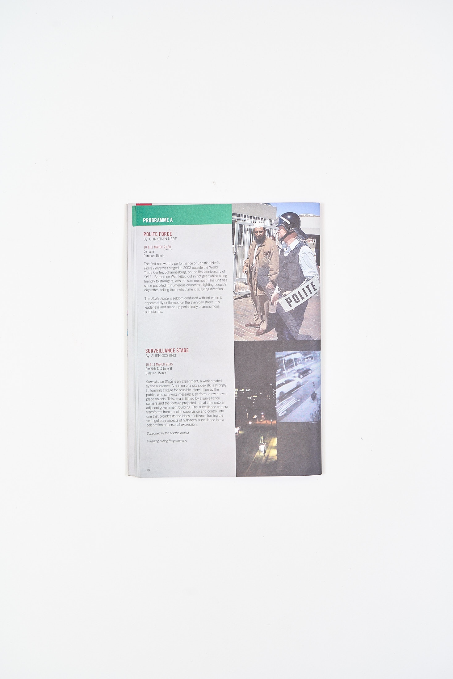 Programme of Infecting the City, 2014, at which a Polite Force performance took place. Participants were to ask rowdy audience members to quiet down and provide directions.