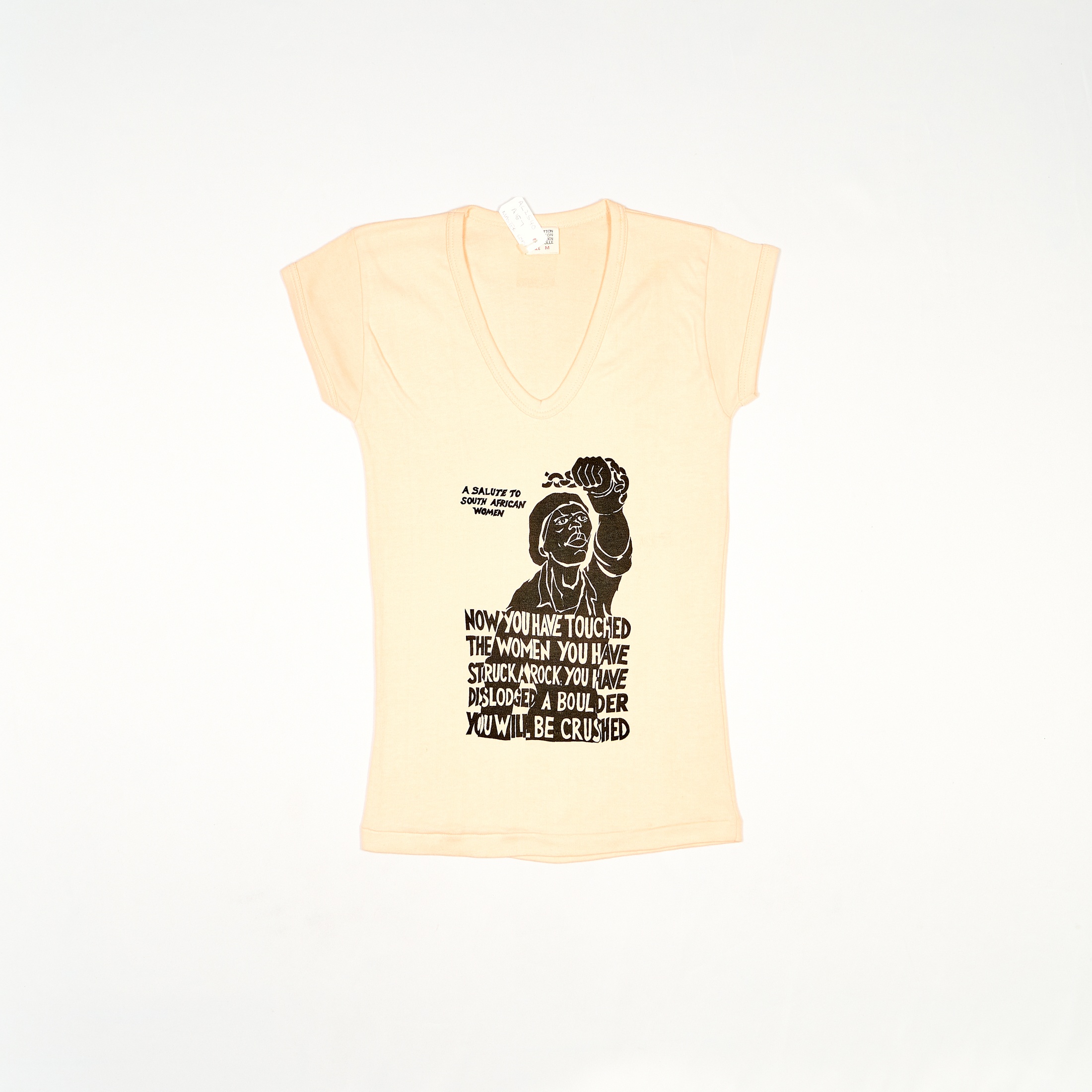 This T-shirt features a poster illustrated by Judy Seidman and Medu Art Ensemble's graphics unit to commemorate the 1956 Women's March in Pretoria. The poster features the English translation of a protest song sung at the march, Wathint abafazi wathint imbokodo.