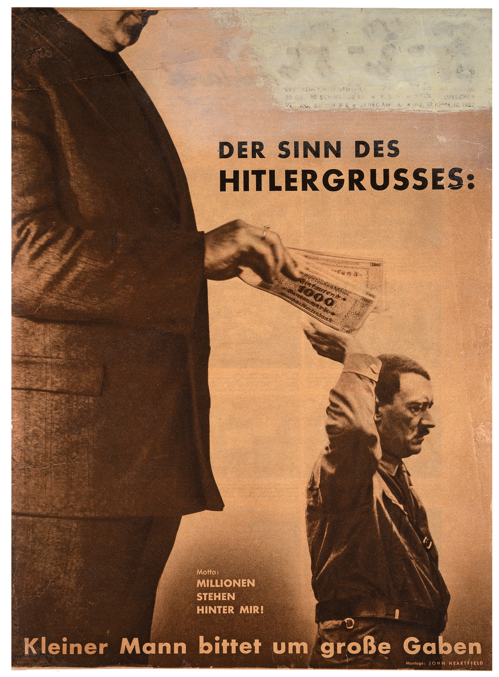 Poster: John Heartfield, Der Sinn des Hitlergrusses - “Millionen stehen hinter mir!” (October 16, 1932). Photomontage. Originally published in Arbeiter llustrierte Zeitung, Jg. 11, No. 42. 38 x 27 cm. Courtesy of Akademie der Kϋnste, Berlin, Kunstsammlung.