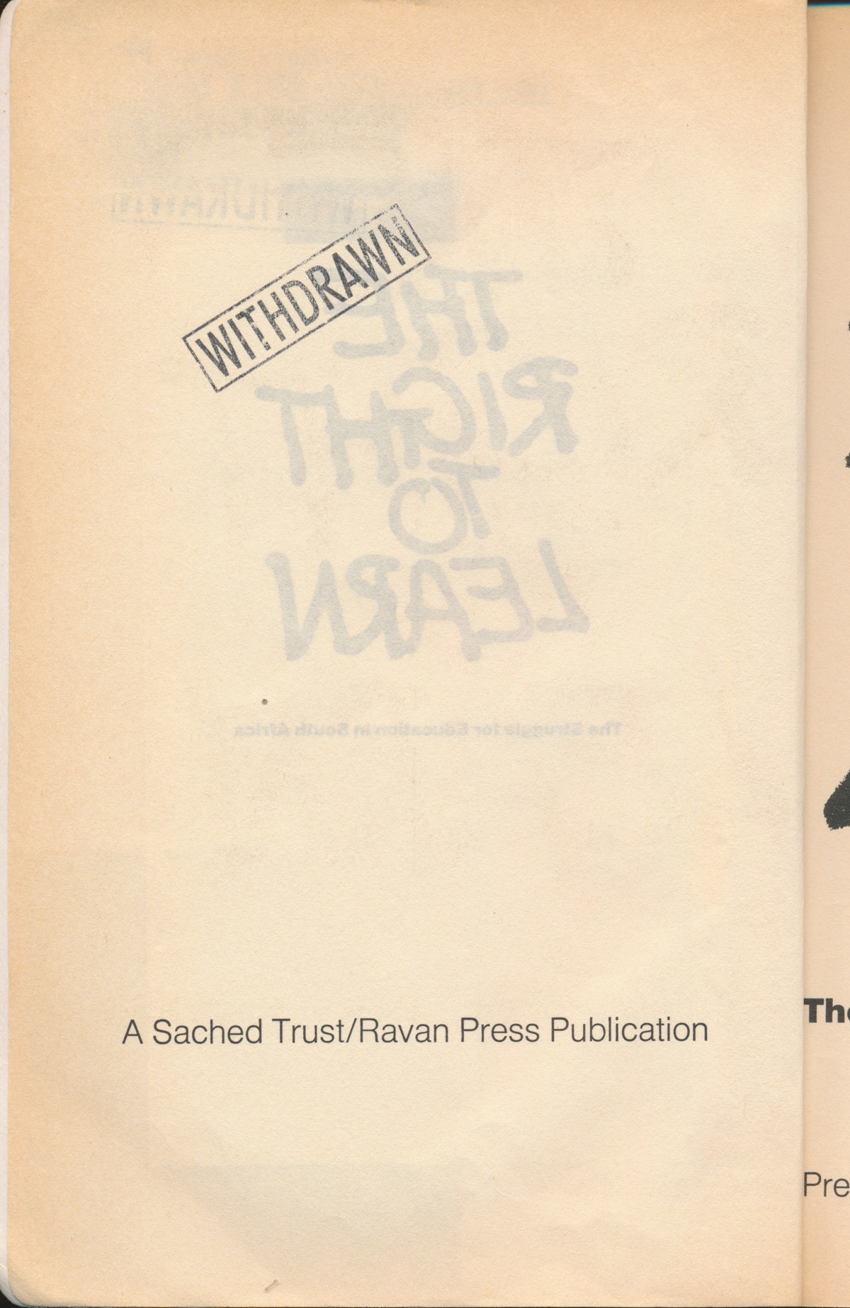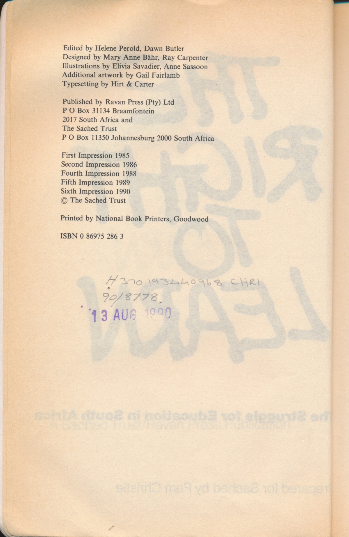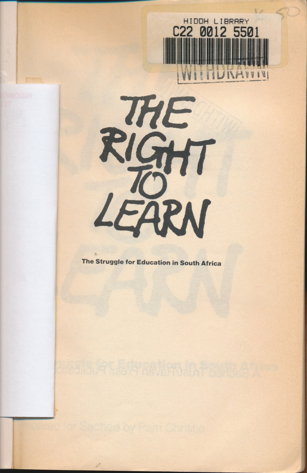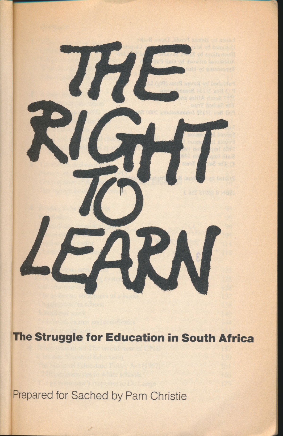 Butler, D. and Perold, H. (eds.) (1990) The Right to Learn: The Struggle for Education in South Africa. Johannesburg: Ravan Press.