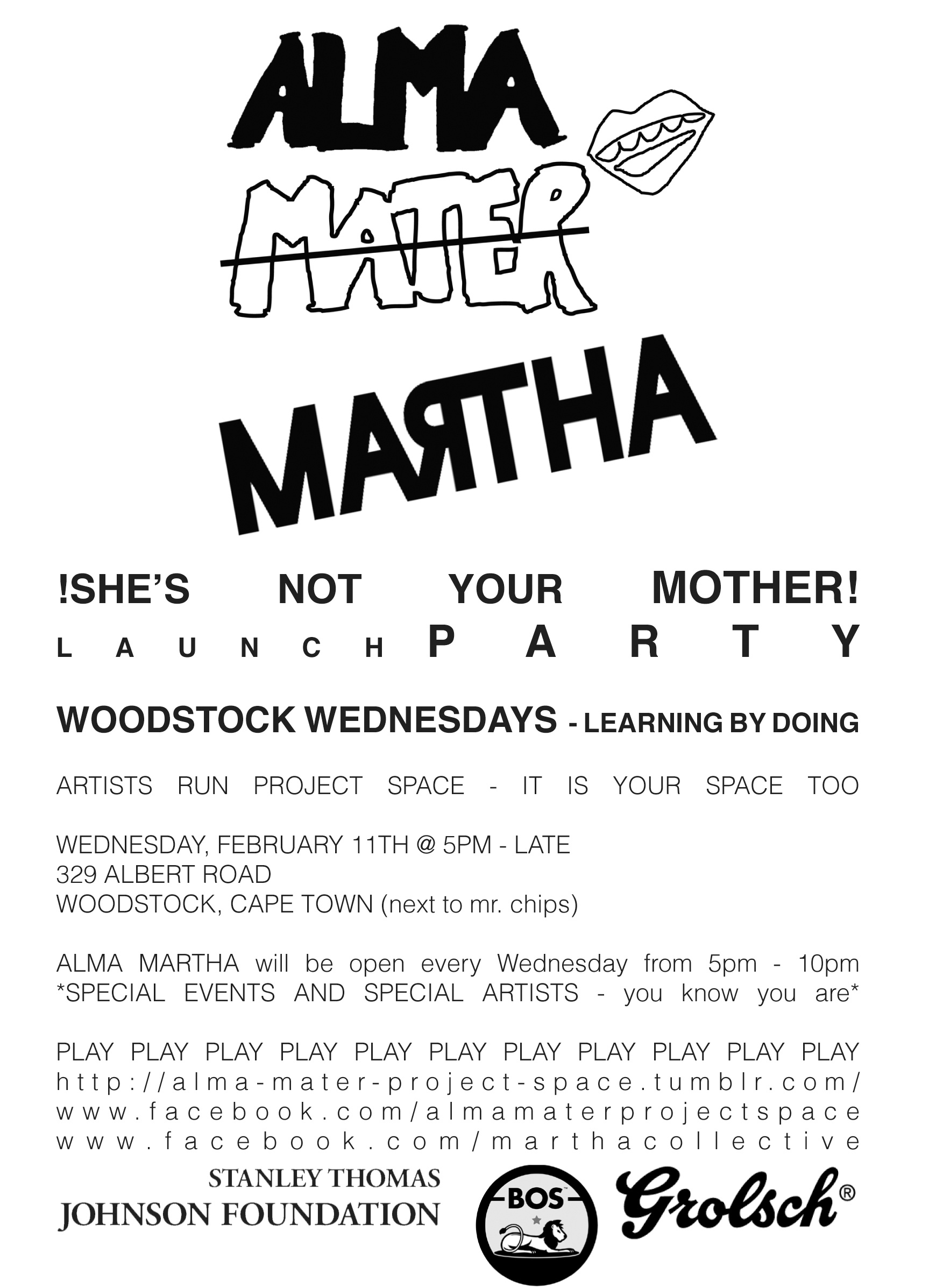 Poster: She’s Not Your Mother Launch Party by Alma Martha, Woodstock, Cape Town, February 11, 2015. Image courtesy of Juliana Irene Smith.