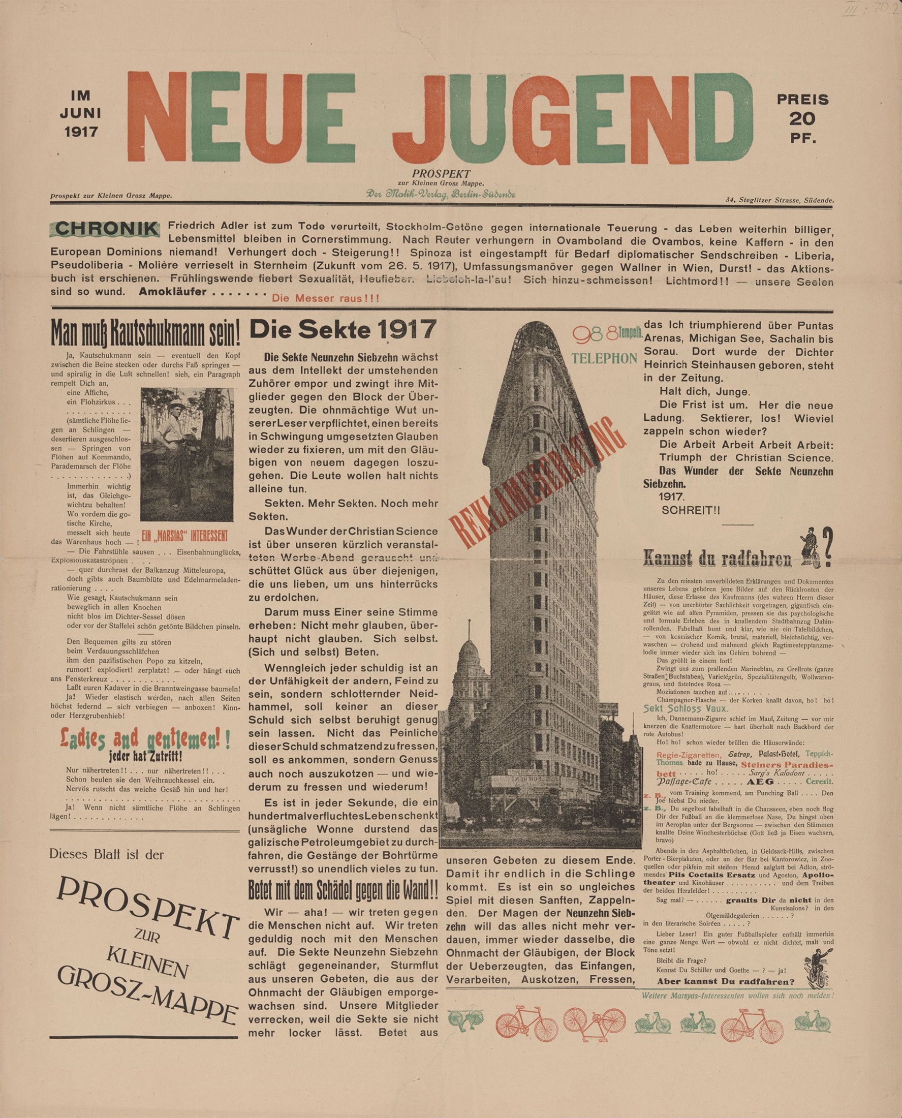 Poster (facsimile): Herzfelde, W. (ed.) (June 1917) Neue Jugend / New Youth: Prospekt zur kleinen Grosz-Mappe / Brochure to the Small Grosz-portfolio. 63.7 x 51.3 cm. Berlin: Malik-Verlag. Courtesy of Berlinische Galerie, Landesmuseum fϋr Moderne.