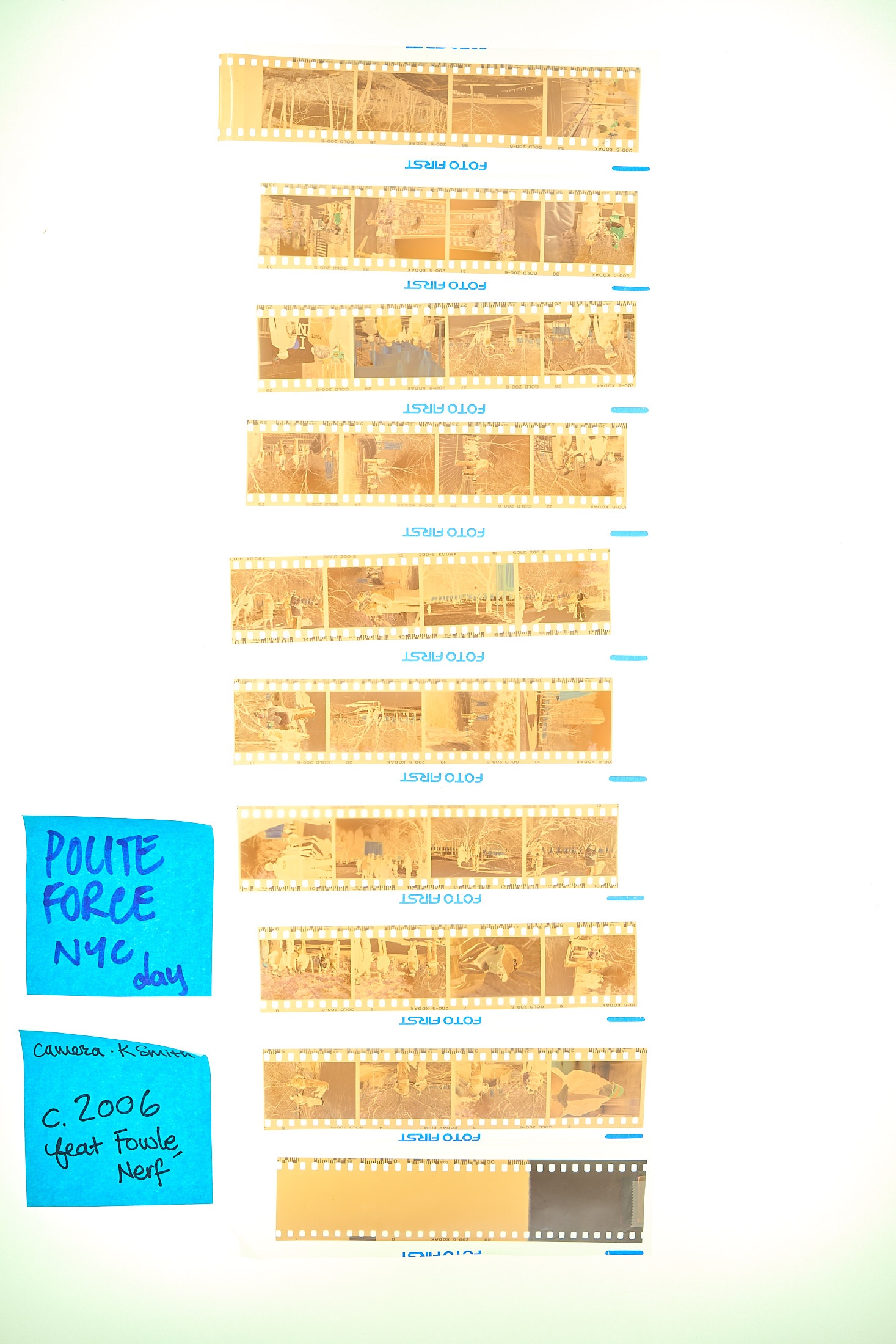 Photographic negatives of a Polite Force performance in New York City with Christian Nerf and Kate Fowle taken by Kathryn Smith.