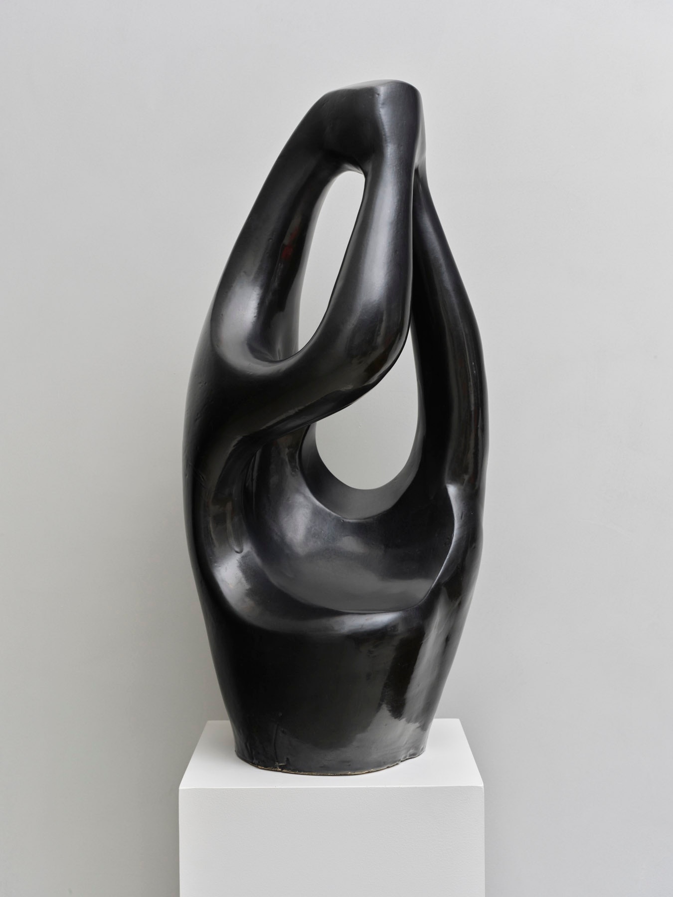 Finished in dark enamel, femme offers a striking silhouette with its enclosed spaces and circular motif. In title, the work evokes the body of a woman; in image, however, it remains purely abstract, feminine in only its curving sensuality and otherwise suffuse with the material masculinity of much modern sculpture. There is to its dark form a certain hardness, its structure more architectural than evocative of flesh. Smoothed to a polish, and with metallic glaze, the work appears made from tarnished bronze. Yet for all its apparent solidity, its medium has nothing of metal’s permanence, ceramics being brittle and breakable. To the viewer, the form’s fragility goes unseen beneath varnish, its mud-coloured truth hidden by a bronze façade. Tapping the enamelled surface, however, one hears the ringing not of metal but of baked earth.