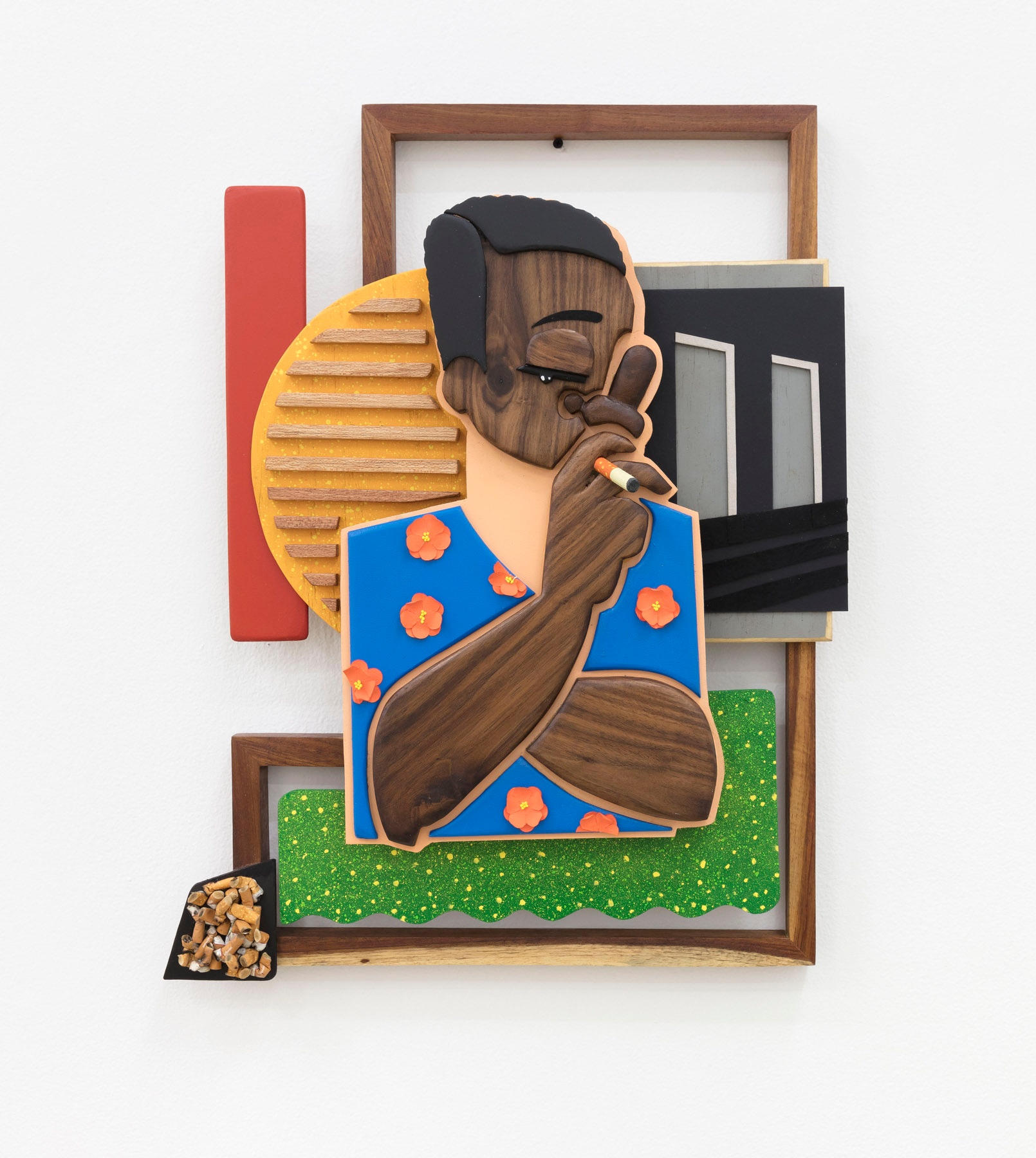 “The work I produce is about the black experience,” Dada Khanyisa says. “The weight of the content is based on the currency of memories. I enjoy focusing on what people neglect or take for granted.” The visual stories Khanyisa creates – in murals, sculpture and painting – more often depict scenes of intimacy and levity borrowed from everyday life. Following a self-styled attitude of nakanjani (by whatever means necessary), Khanyisa works across such various mediums as wood, rubber, acrylic paint, and found objects to compose their high-finish, graphic images. The artist’s distinct figuration echoes popular South African comic strips in style and form – indeed, many of Khanyisa’s sculpted paintings appear as comic book panels populated by their many characters. In this way, the artist suggests, they champion an accessible visual language, a street-wise aesthetic that riffs off black South African pop culture and the collective voyeurism social media inspires.