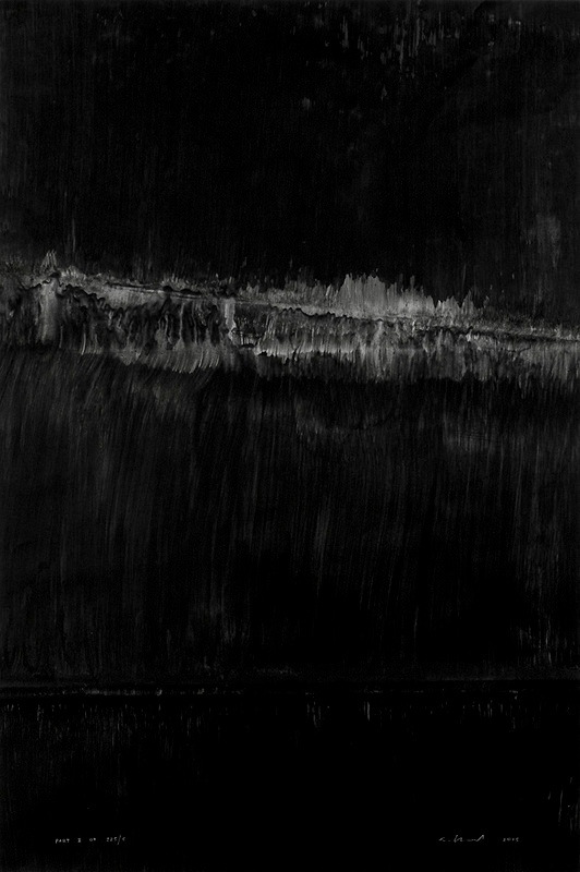 Morland's work is a rubbing made of the unseen facets of a steel sculpture; a notation of what is otherwise invisible. The seam that runs across the darkness describes the intersections of different planes.