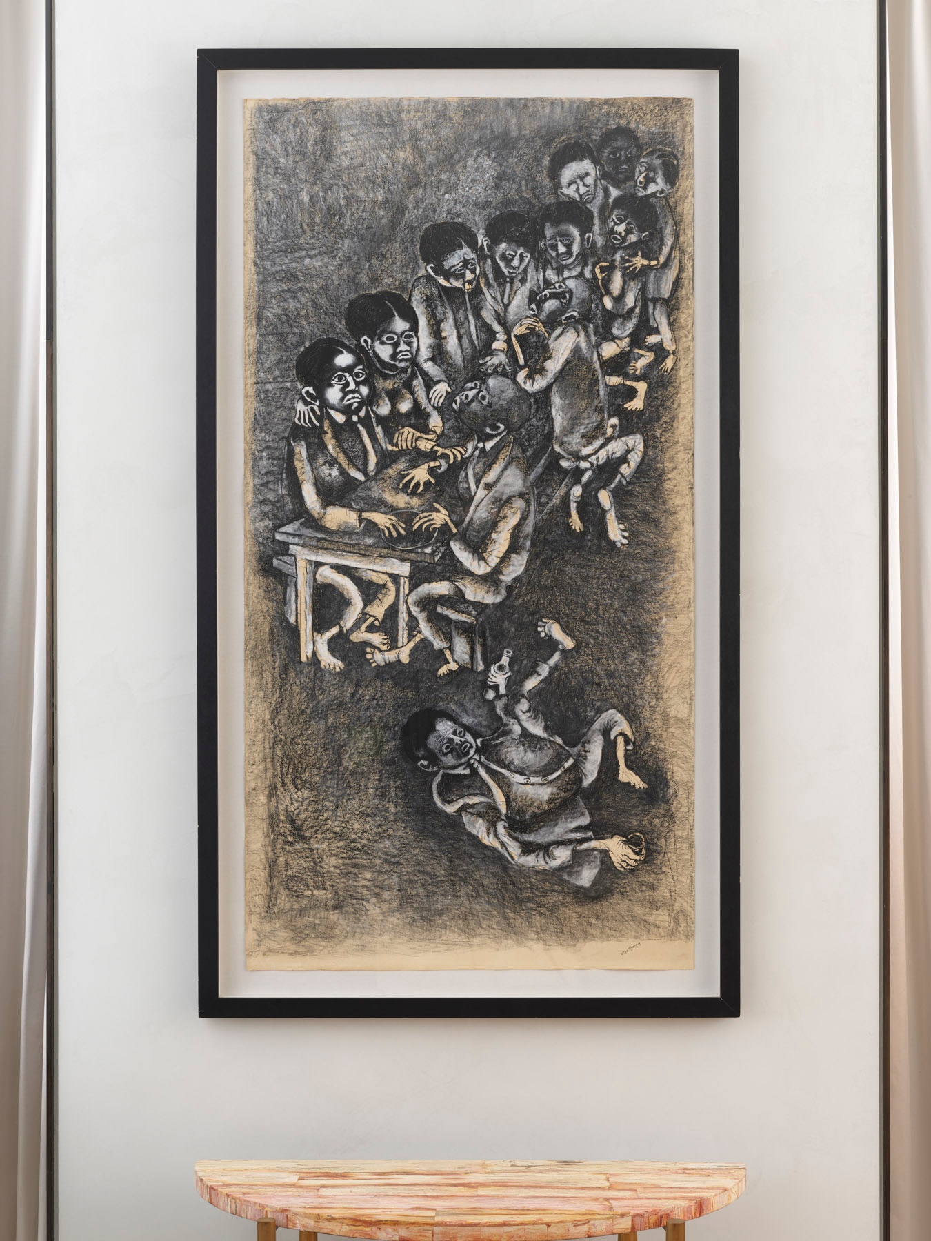 The late Dumile Feni’s drawings, prints and sculptures are dark reflections of impoverished life under apartheid rule. Given the ambiguous epithet of ‘Goya of the townships,’ Feni's images spoke not only to the suffering particular to South African informal settlements but to a more universal theme of human failings and cruelty. His work, however, is not uniformly bleak – there are moments of pleasure, though quiet; moments of filial love and erotic lust. Recalling the urgent poignancy of his work, the artist and activist Bill Ainslie wrote: “Feni took the raw material of his life in Soweto…and translated it into work in a manner which revealed a capacity to face unflinchingly the most frightening extremities of human desperation and cruelty without spilling over into sentimentality or overblown expressionism… I have not found anybody equal the ferocity and compassion of his work."