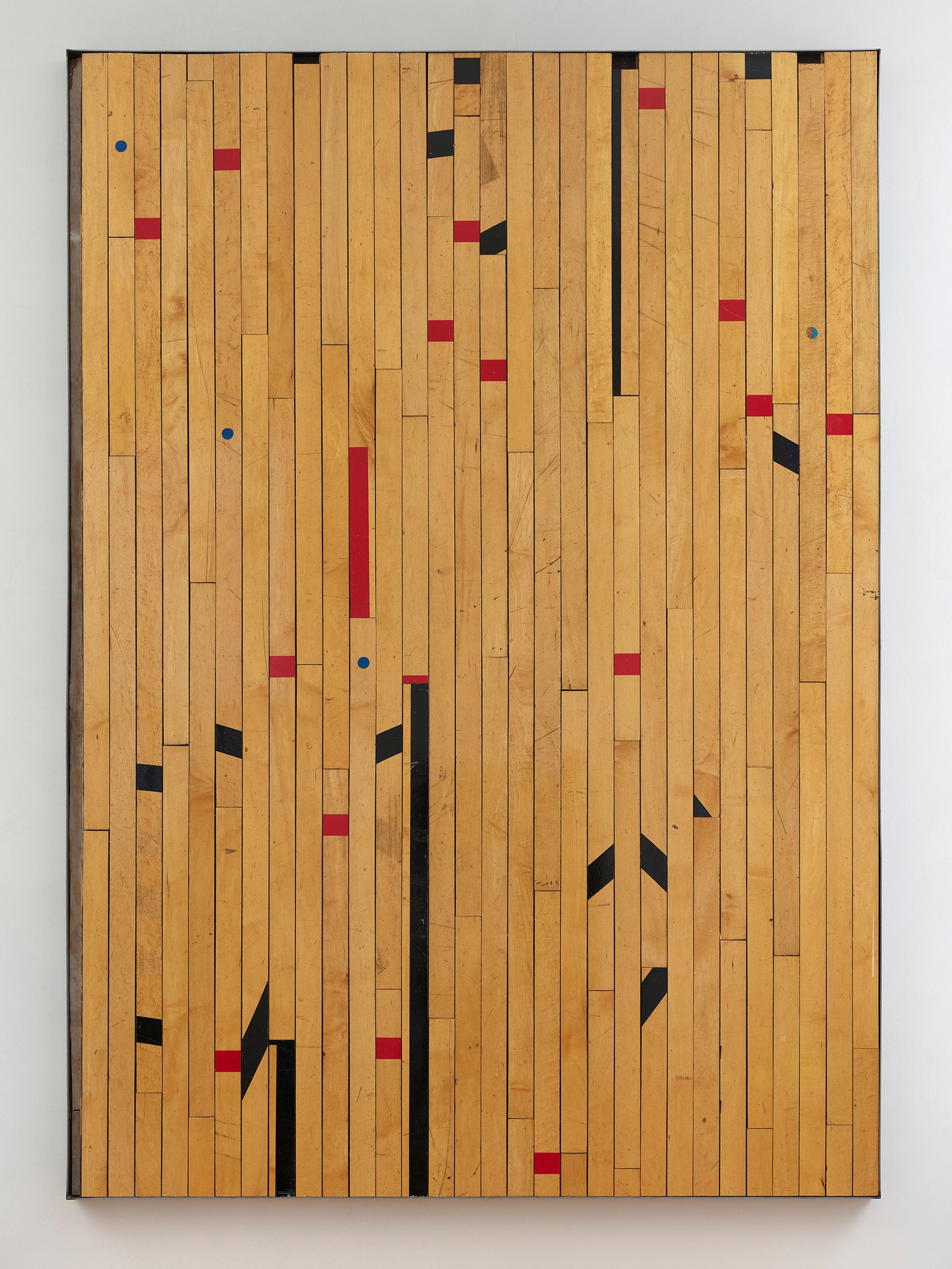 For his Ground Rules series, Gates repurposes gymnasium floorboards from decommissioned schools across the city of Chicago. Reassembled into minimalist compositions, the works at first appear as large abstract paintings. Only the seemingly random lines and shapes of colours – made from the floor tape that once mapped the courts – gesture to the wooden boards’ previous existence. The ground rules are no longer legible, the floors having served their purpose. While visually compelling, the works also offer a critique of the continued underfunding of the city’s disenfranchised communities. Among the indents and scratches that mark the wood is a distinct sense of loss – of demolition and disregard, and of opportunities denied.