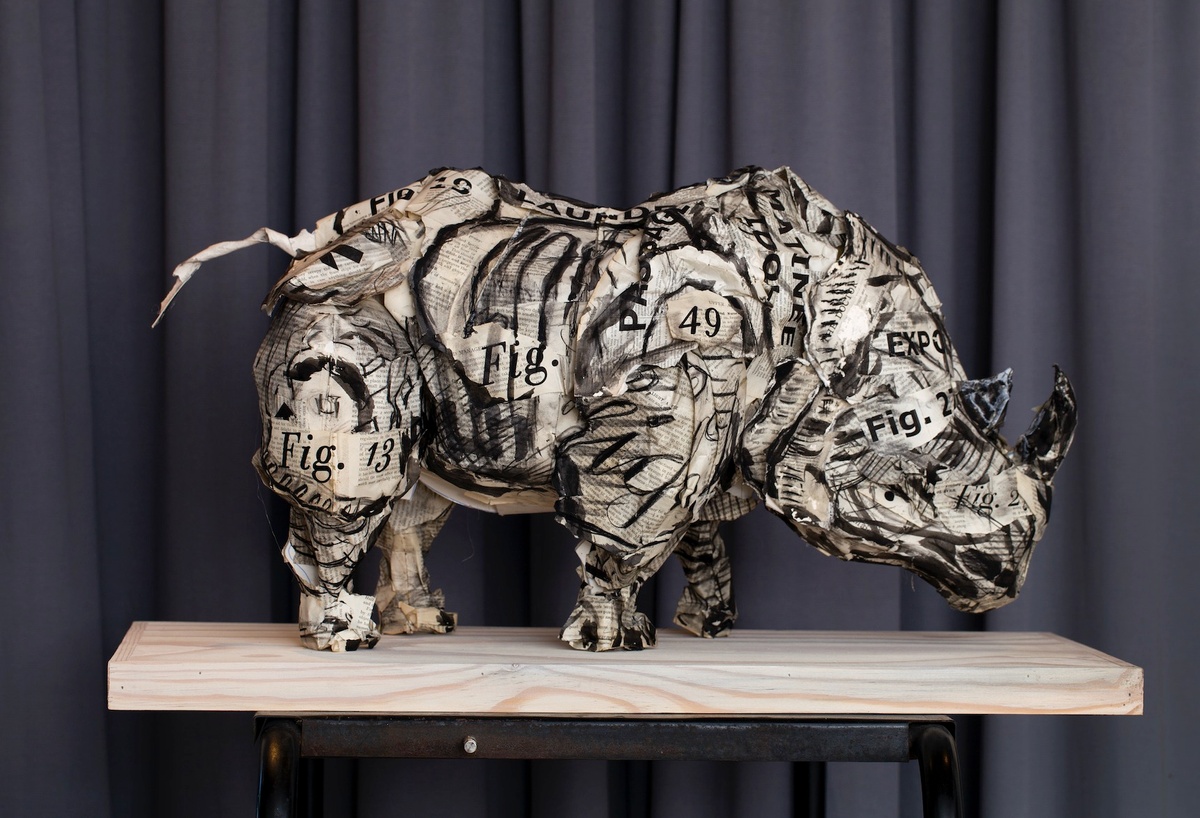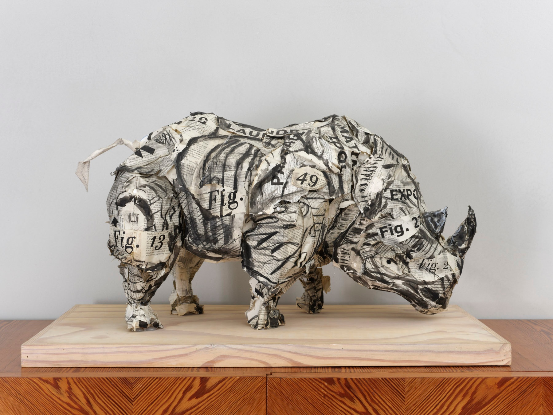 Throughout Kentridge’s work, from the animated film Mine (1991) to his production of Mozart’s The Magic Flute (2005), the rhinoceros appears as a wild beast reduced to circus animal. However reminiscent of Dürer’s armoured creature, Kentridge's rhinoceros dances and performs, defying its weight and heft. It performs on command, bends to the will of its captives. The animal's neutered nature evokes a history of exploitation and colonial expansion, as signalled most clearly in the archival footage that plays in Kentridge’s Black Box (2005). Here, a rhinoceros hunted and killed becomes a symbolic parallel for the massacre of the Namibian Herero people in the name of Empire. Made from collaged paper and card, this sculpture’s very medium undermines the animal’s implied mass, belies the seeming solidity of its form. Kentridge’s rhinoceros is a thing easily crushed.
