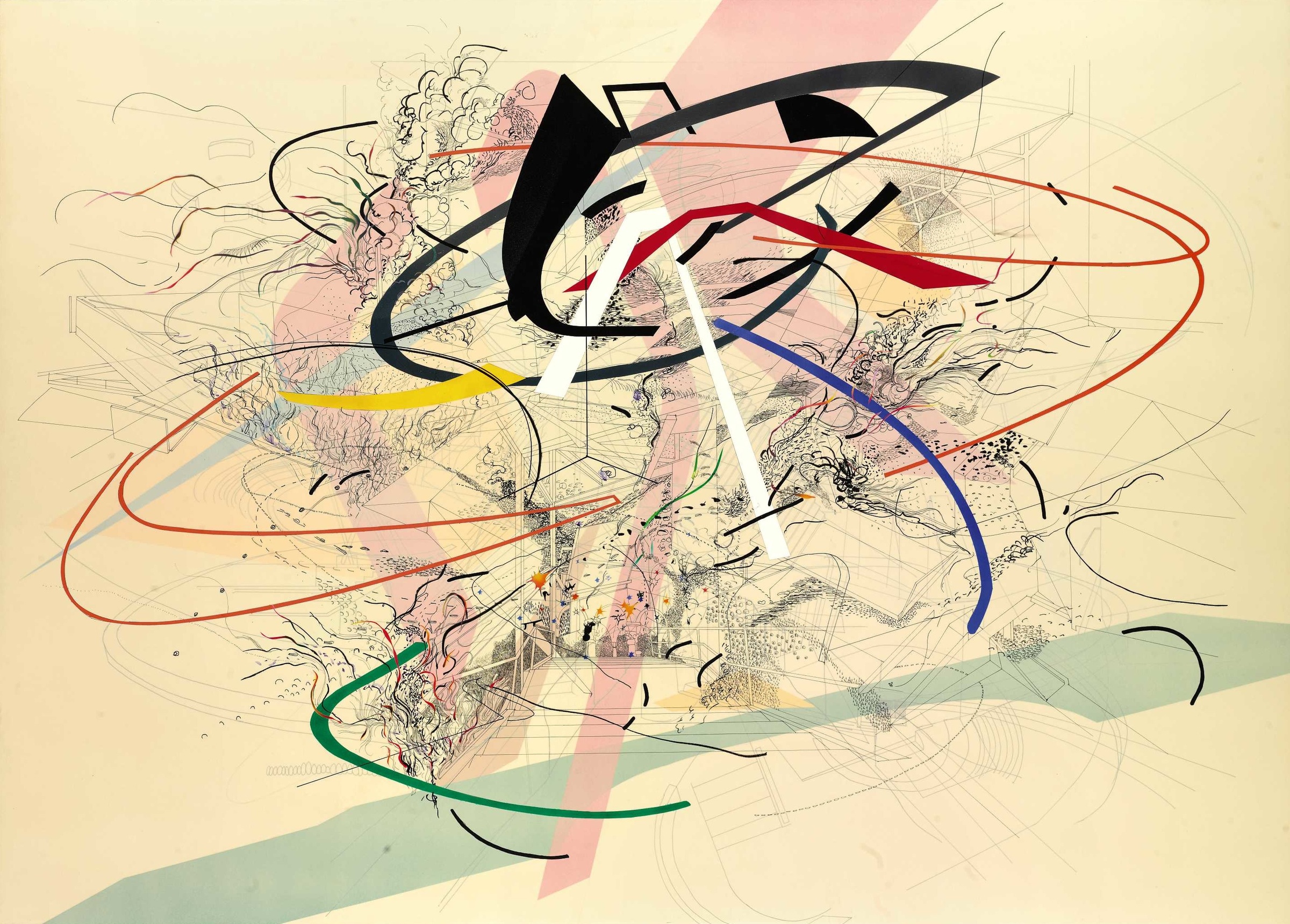 Part history painting, part psychogeographical study, Mehretu’s Untitled 1 proposes a novel encounter with place and space. There is no guiding perspective to its images, no organising system with which to see them. Instead, the artist offers a dynamic pictorial articulation of the urban experience. “On one side is consolidation, on the other is disintegration,” critic Christopher Knight writes of Mehretu’s compositional chaos. “Collapse is underway, coalescence strains. Schism and synthesis spar.” Visual cohesion is fleeting; here, where architectural schema conflates multiple points of view – aerial, cross-section, and isometric. Within these constellations of diagrams, abstract incidents appear as flat geometric forms and calligraphic swirls. Together, the representational and non-objective coincide in a confusion of topography, built environment, and colour.