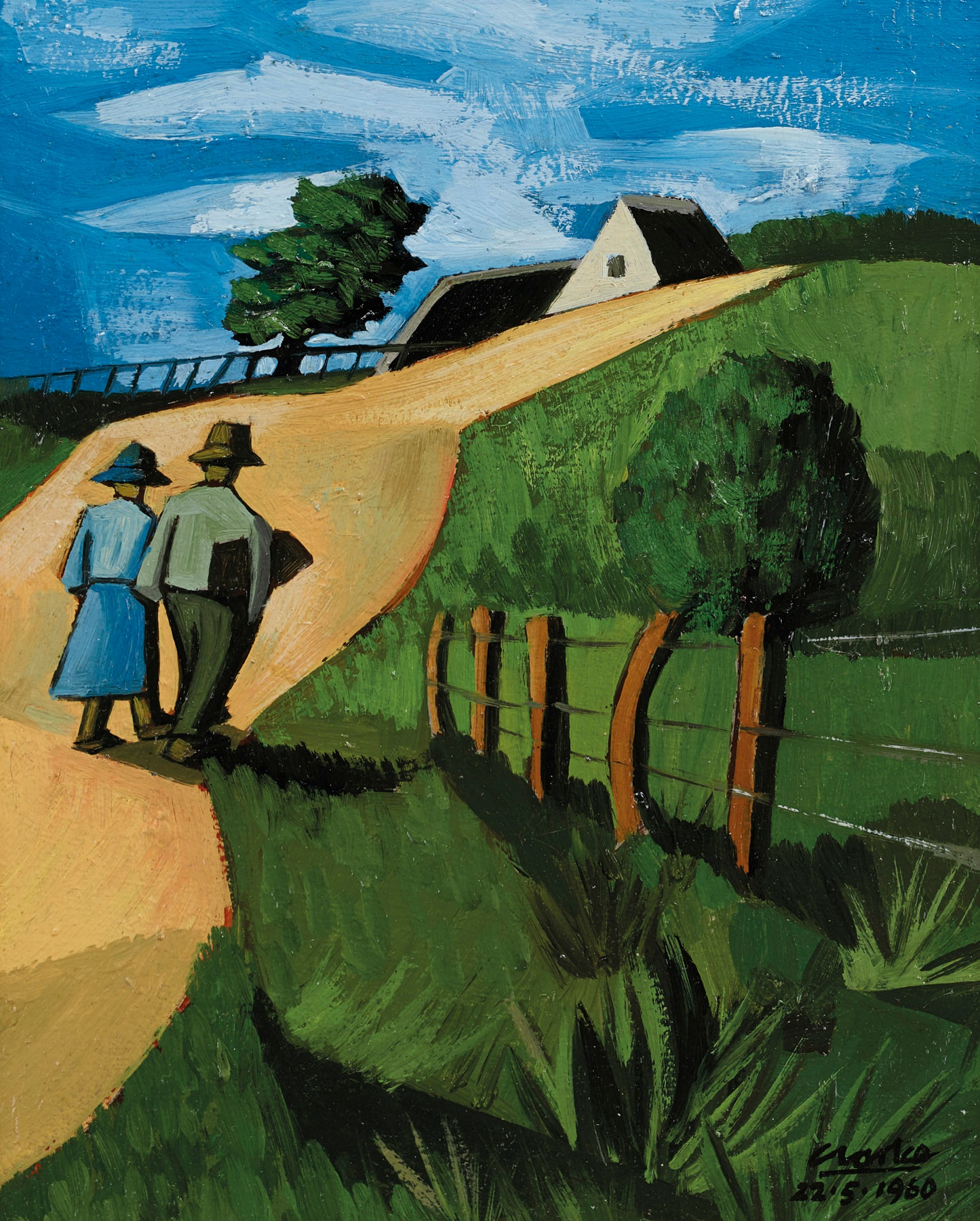 Figures on a path dates from Clarke’s early Tesselaarsdal period, named for a black-owned farm near Caledon, which remained largely autonomous under the apartheid regime. A relative Eden, the farm allowed Clarke a momentary respite from the shadow of oppression. While his later paintings would come to reflect the increasing hardships of apartheid life, the Tesselaarsdal works offer a vision of bucolic calm. Of the farm, Clarke wrote, “my heart is in this place and I love it. That is so true and so definite.” While the painting was most likely made en plein air, it is less a study of the landscape than an invocation of peace; a pictorial metaphor of belonging.