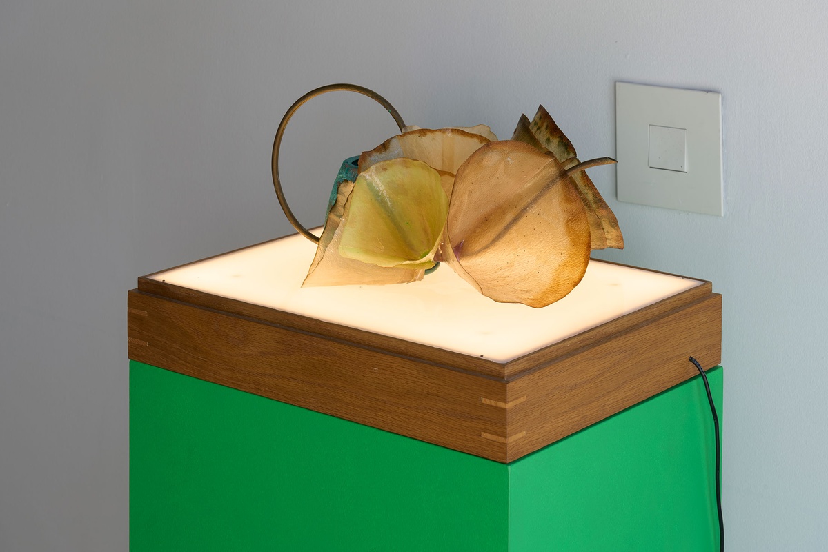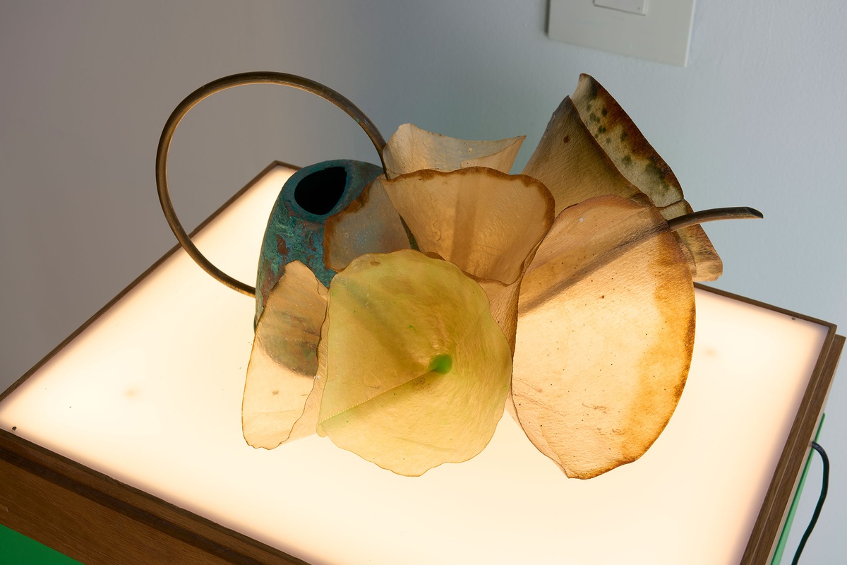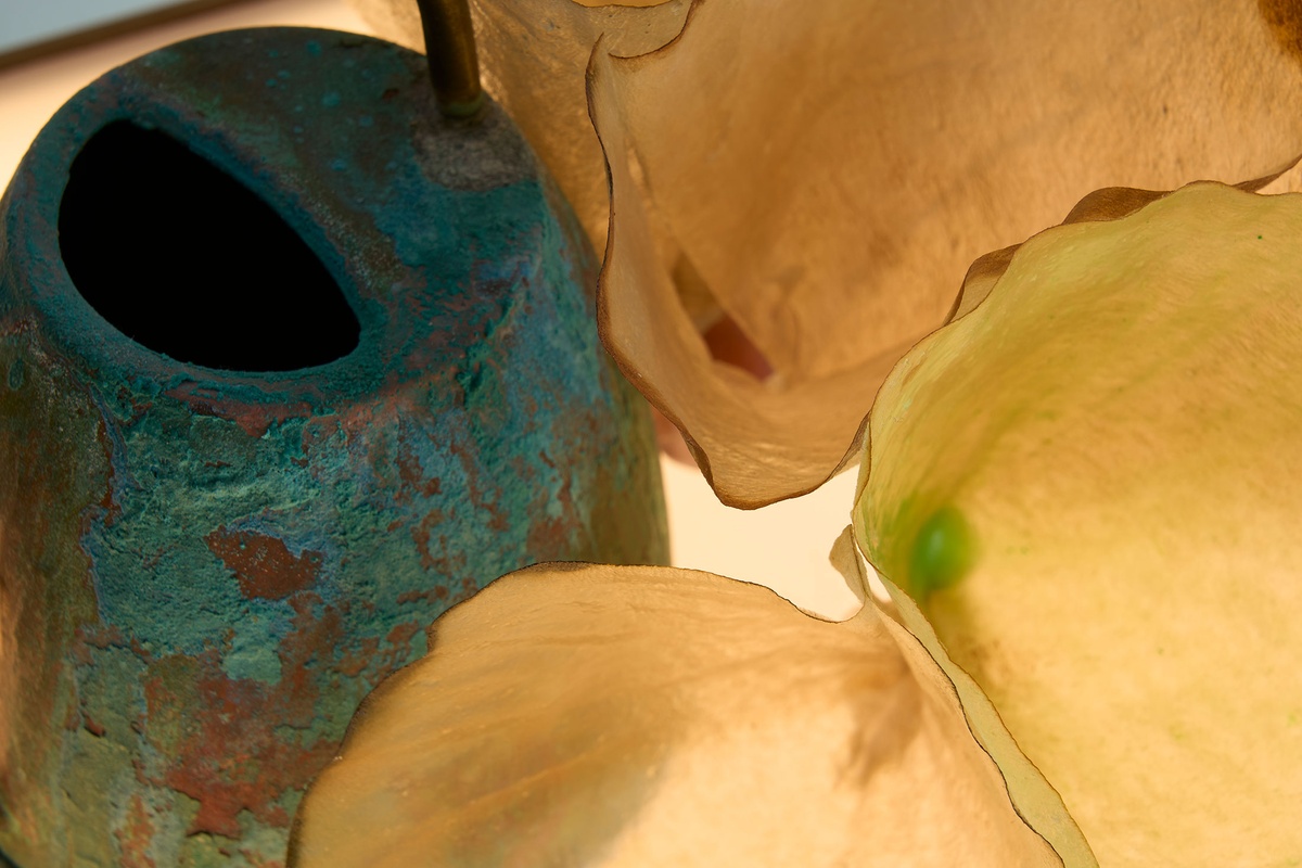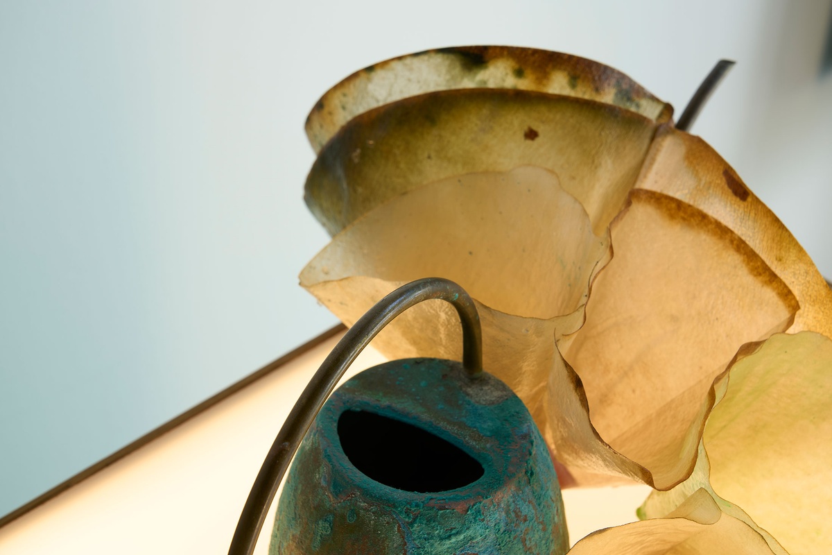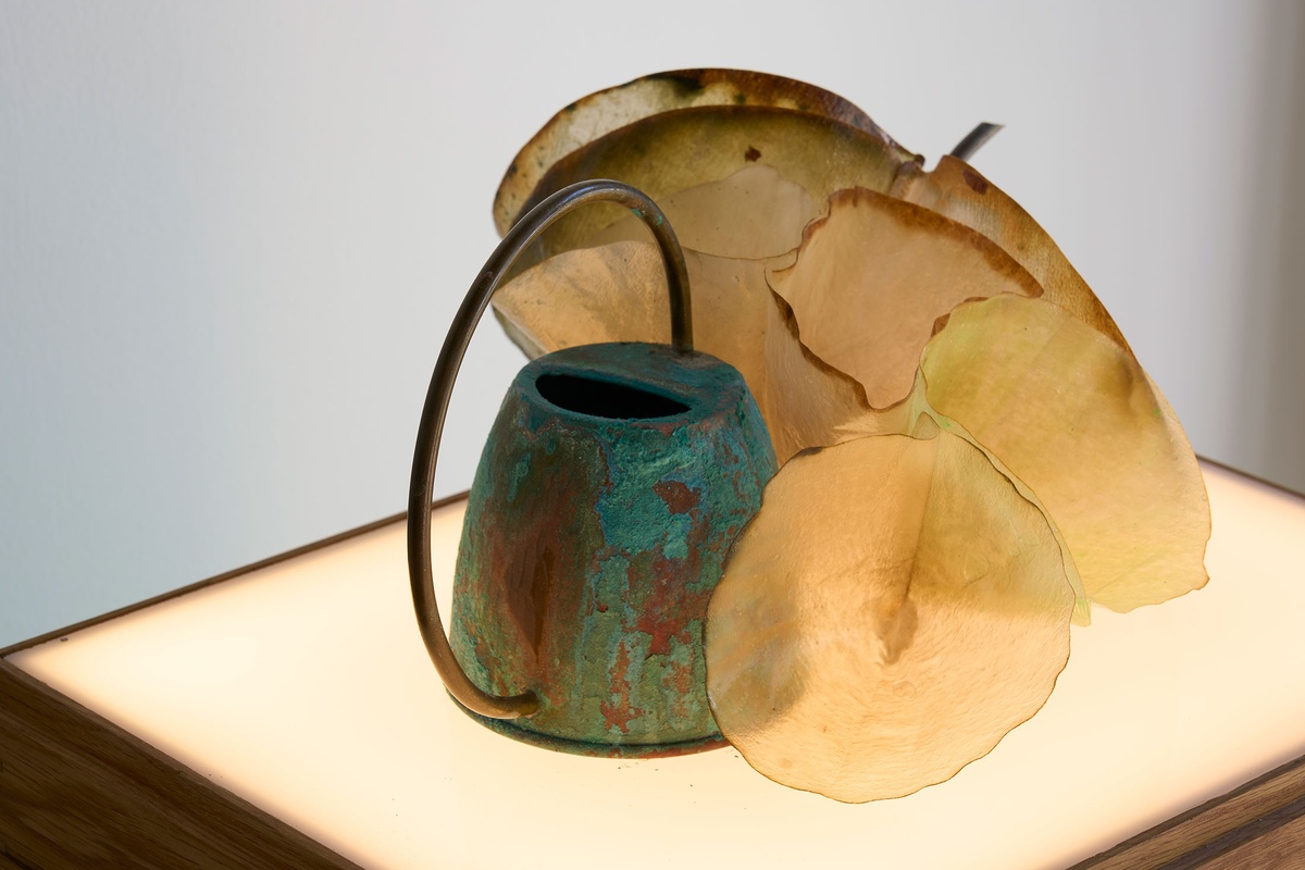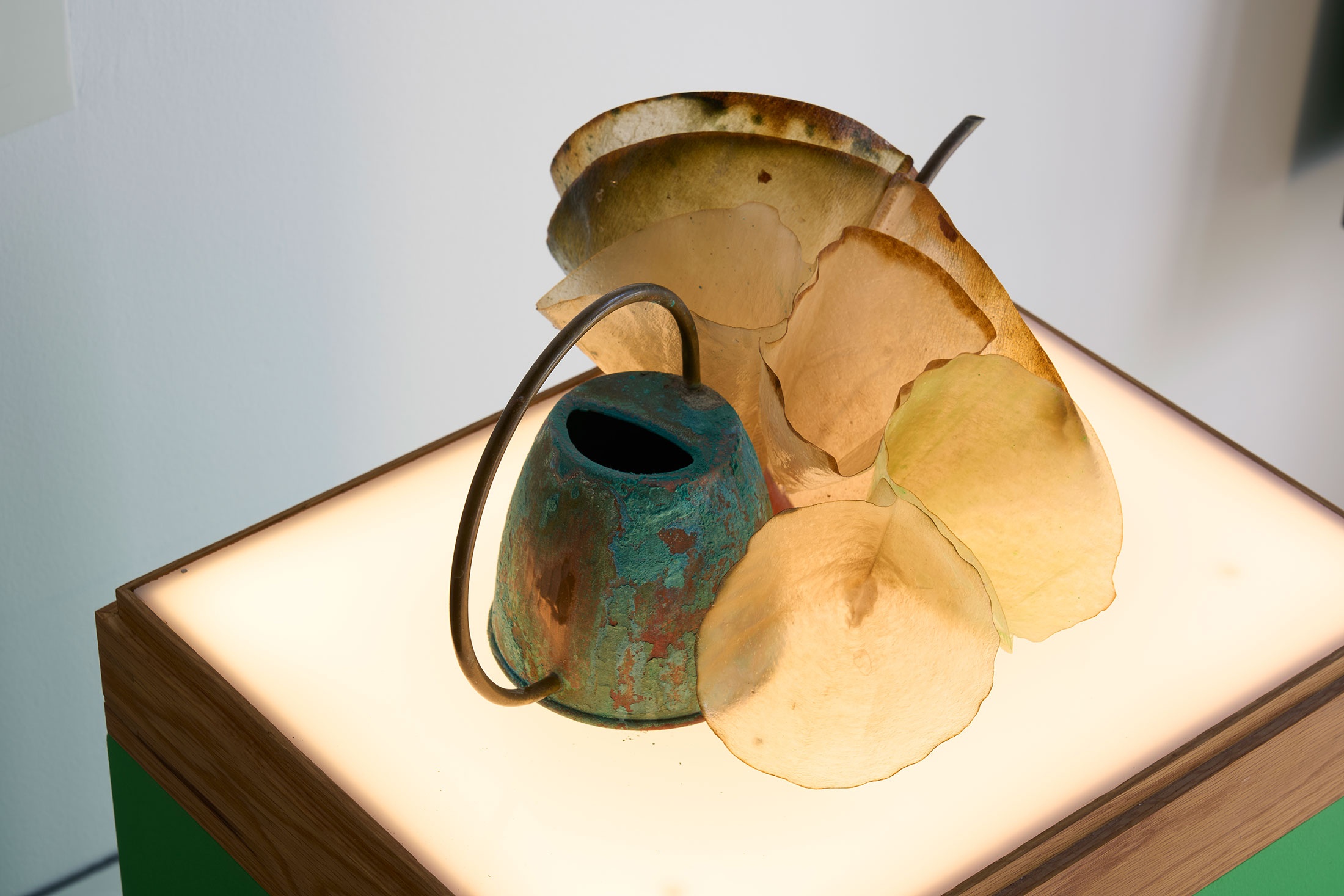 A work-in-progress that serves as both an artwork and a source of art-making materials, this object holds a pivotal place in Munnik’s sculptural practice. In what she terms an ‘alchemical’ process, an antique copper watering can is continually filled with seawater, accelerating the oxidation process. While the patina provides her with pigment, the object itself becomes ‘overgrown’ with resin sculptural elements that recall the shape of mushrooms.