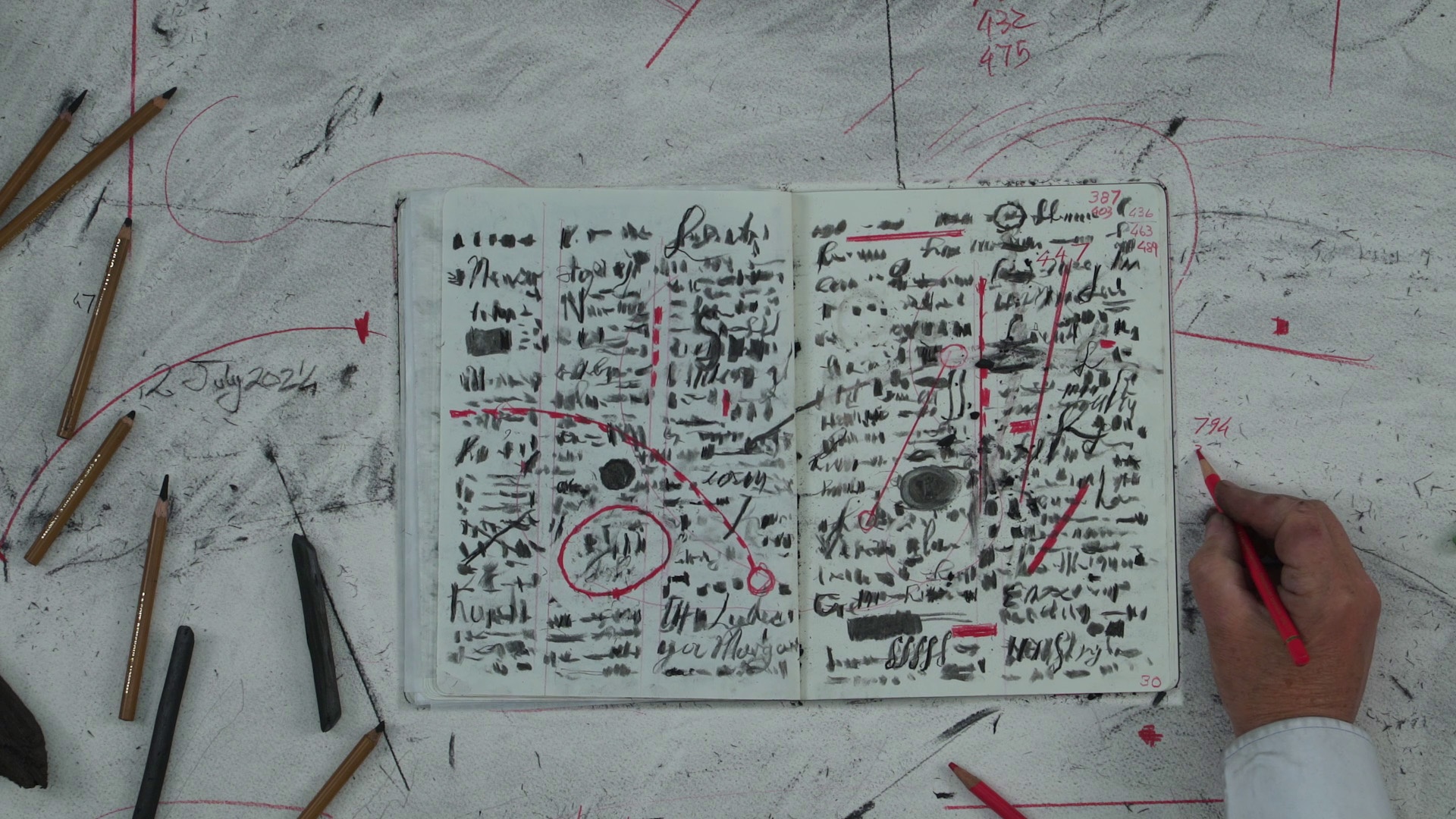 In the opening sequence, the artist’s hands page through a working notebook, with its to-do lists, timelines, ‘obligations’ (among them ‘drawing for A4’), and sketches towards sculptures. This overture sets the scene for an elliptical, non-narrative engagement with the book as an aide memoire that extends beyond the purely practical, a site where ‘fugitive’ words and images – free-floating, unbidden – find chance proximity between its covers. Seemingly unrelated phrases appear; impressions of a tree recur; portraits of the artist and others come and go; a wandering line journeys across the pages; marks feint towards, but seldom resolve into, writing. Even the artist’s drawing tools assume the role of characters, participants in the oblique logic of the notebook, around which eraser filings and charcoal dust notate a series of accumulations and erasures.