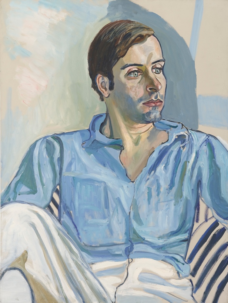 Neel’s son Hartley often sat for his mother. The youngest of her four children, Hartley grew up in an unhappy home, with Neel struggling to make ends meet and his father given to violent tempers. In her portraits of Hartley, their shared histories play across the canvas – all their hurt and hope notated in the artist’s hand. These paintings are intimate studies of kinship, disarming in their frankness and poignant in the depth of their emotion. Again and again, Hartley appears in Neel’s paintings, always resigned, always lost in thought. In Hartley, the artist’s adult son looks away from his mother with unfocused eyes. The scene is suffused with blue, casting the figure in a sombre tone.