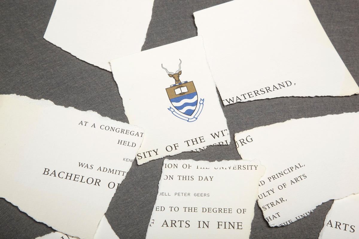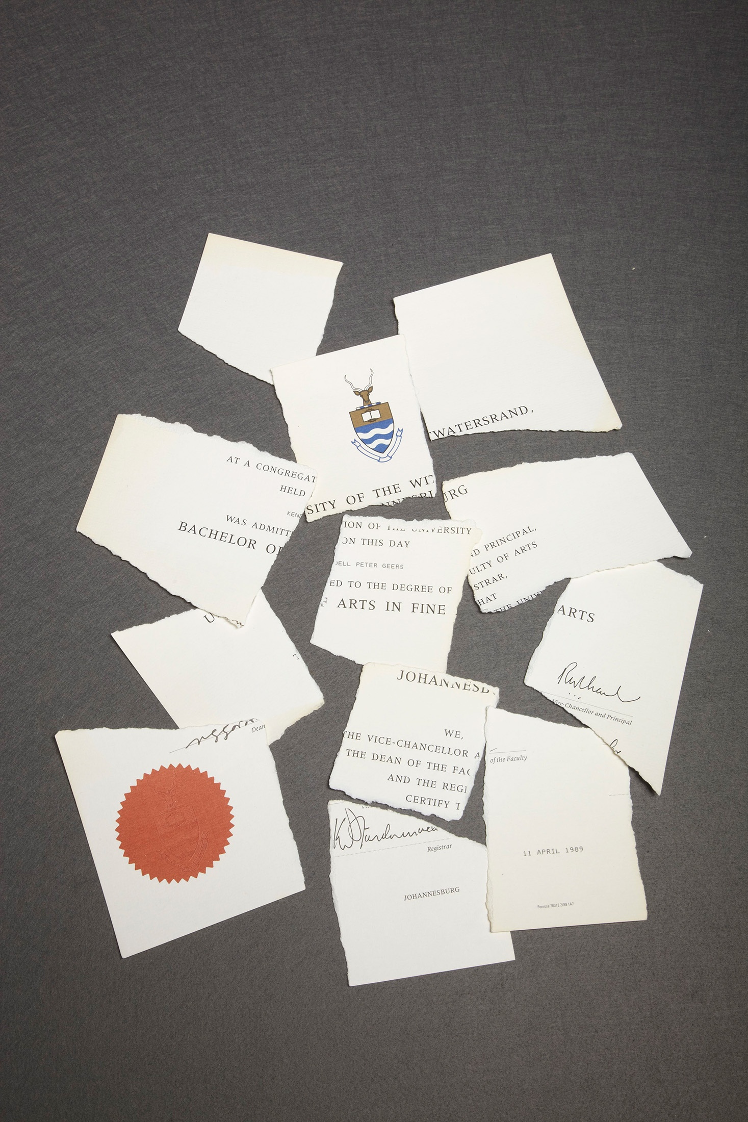 Artist Kendell Geers Title Title Withheld (Bachelor of Arts in Fine Arts) Date 1985–1988 Materials Torn diploma in 12 pieces Dimensions Dimensions variable Edition Signed verso and stamped Credit Courtesy of the artist