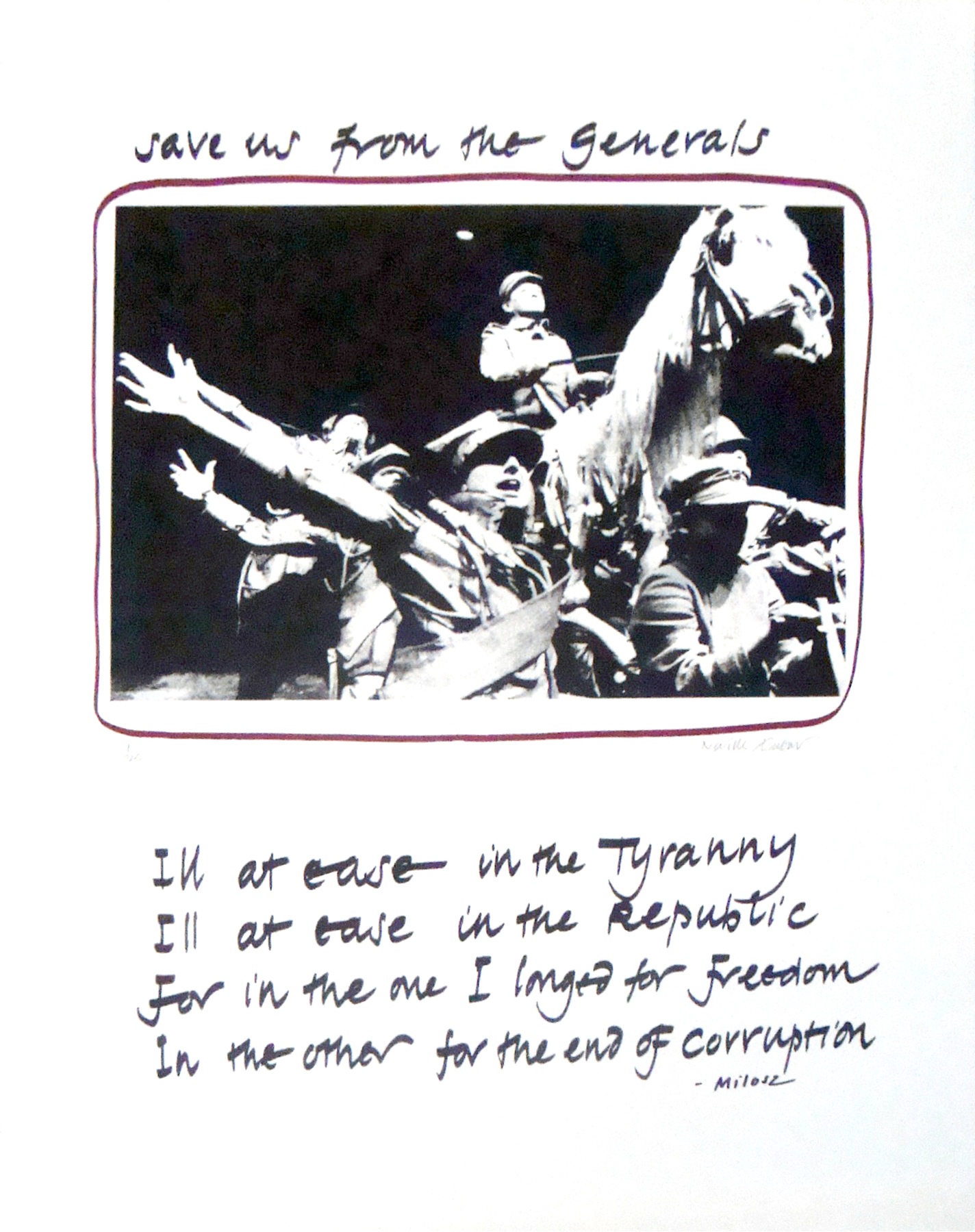 Artwork: Neville Dubow, Save Us from the Generals (1986). Offset photo-lithograph. 19.8 x 17.5 cm. Artwork courtesy of Iziko South African National Gallery.