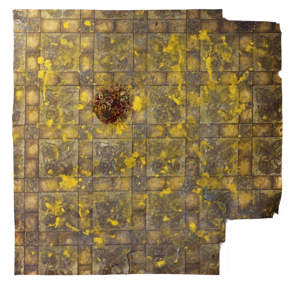 Boeta Joe se voordeur tapyt (2010) marks a moment of transition in Adams’ practice, the artist alighting on the subject around which his practice has since turned – linoleum flooring lifted from homes in the communities in which he was raised. In this early engagement with habit, ritual and commitment as abraded onto vinyl, the artist excerpts a portion of ‘tapyt’ for close looking, refiguring it as a framed abstraction. It was not the first time Adams had considered what lay underfoot – previously, he had worked with prayer mats – but here, his attention turned away from religious devotion to a more secular invocation of repetition. The vinyl fragment, taken from the space just inside a neighbour’s front door, is coloured by marks accumulated over time, repairs made, tears left unmended, stains, tracked dirt. To these, the artist adds his own interventions – paint and fabric offcuts – engaging in an understated dialogue with the indexical record, asking after the worn surface of the vinyl flooring as utility and testament. The title, which recalls the particulars of the place and the person who inhabited it, establishes the specificity central to the artist’s reflections – to this, Adams’ works more often note the resident’s name, the room in their house from which the vinyl was quoted, or the street address. Adams later began translating such flooring in woven compositions, introducing distance between the reference and the beaded object after its likeness. His preoccupations have since extended beyond the domestic to include the improvised paths across empty lots and fields in Bonteheuwel and the neighbouring township, as in Langa (2021), an aerial view of such dusty tracks. More recently, however, he has returned to interior spaces – and even to his first works. In Mapping Yvonne’s Kitchen (2021), for example, he reappraises the flooring first included in Hennie se kamer tapyt (2010), contemporaneous with Boeta Joe se voordeur tapyt. Yvonne and Hennie were spouses; he paraplegic, she is primary caregiver; his bedroom their kitchen. The room is the same room seen twice, only differently framed; the first an augmented document, the second a lyrical impression of care and sacrifice.