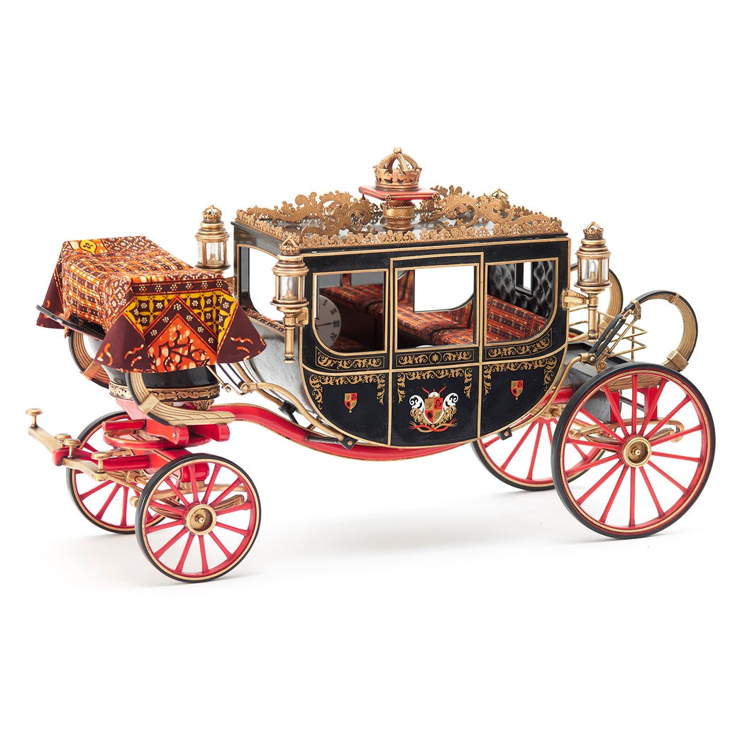 In this work, the phrase ‘carriage clock’ – denoting a travelling timepiece smaller than a grandfather clock and larger than a wristwatch (which it precedes chronologically) – is reimagined in a more literal form. Here, a model carriage, fashioned after the British monarchy’s Irish State Coach, serves dual purpose as decorative object and clock. It is a piece characteristically Shonibare – an icon of colonial power reimagined, reduced and reupholstered in batik. The arms of the titular clock move backwards, the hours marked in reverse; its time read correctly only in the reflection offered by an interior mirror. The work’s form and finish extend reflections on the vestiges of empire and the fraught interrelations between Europe and the territories Europe colonised. The story of British imperialism, Shonibare suggests, is not one of narrative linearity.