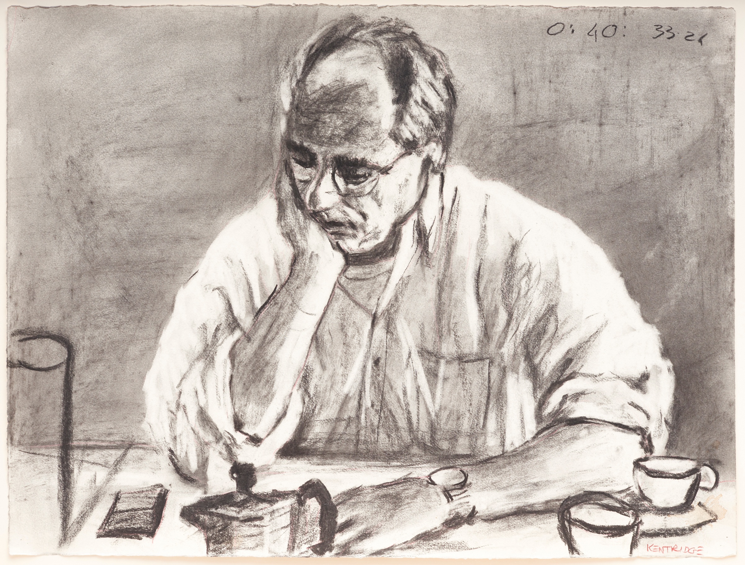 A homage to George Méliès’ Le Voyage dans la Lune (Voyage to the Moon) _(1902), Kentridge’s _Journey to the Moon (2003) – a black-and-white, seven-minute film – is a portrait of the artist’s interior life. Seen through the camera’s eye, the studio becomes a set, the artist an actor, an espresso cup a telescope, and a coffee pot a spaceship. Ants play the part of shooting stars, Kentridge’s wife an elusive muse. The protagonist paces back and forth, waiting for a peripheral image to catch his attention, for a proposition to present itself. The charcoal drawing – Self-portrait (from Journey to Moon) – appears in the background of one such scene, tacked to the studio wall. The film’s primary motifs, the cup and the coffee pot, appear again in the drawing, just as the artist does. The real and the represented reflect one another across their mediums; drawing, life and moving image.