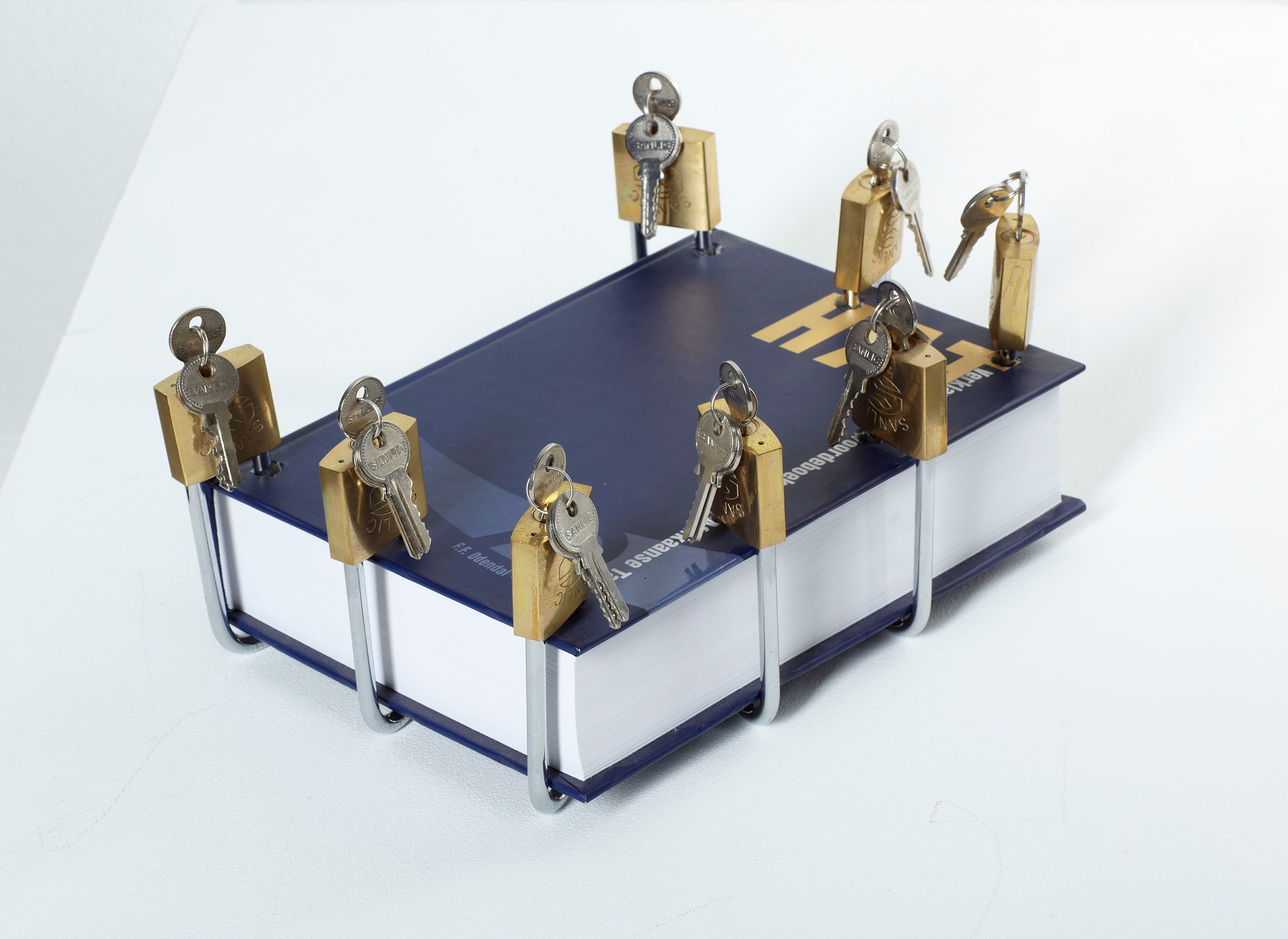 Artwork: Johan Thom, Verklarende Handwoordeboek van die Afrikaanse Taal (n.d.). Altered book, eight Sanlic padlocks (with triplicate keys). Artwork courtesy of Jack Ginsberg. Image © Sebastian Voigt.