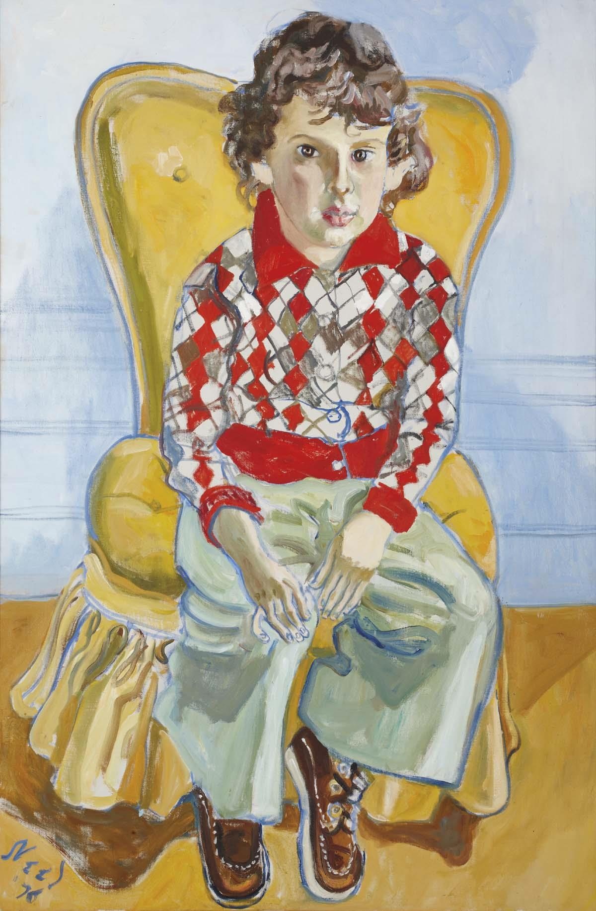 Neel’s painting of six-year-old Sabrina is alive with restless tension. The child – poised at the edge of her seat as if to stand, fingers fiddling, lips shaping a question – seems about to move. Even the skirt of the chair appears almost to shift in a passing draught. Painted in Neel’s home, Sabrina is a study of childlike vulnerability. To the artist, the work is not so much a portrait, a term she disliked for its formality, but rather one of her “pictures of people” – revealing, particular, curious for its idiosyncrasies. The neighbourhood girl, seen sitting on the mustard yellow chair in which several of the artist’s subjects appear, is not so much drawn in paint than drawn out by paint. The picture is less a likeness of Sabrina than the feeling of Sabrina: hesitant, uncertain, watchful. Such is Neel’s brush, which transcribes more than appearance, capturing momentary expressions and fleeting gestures.