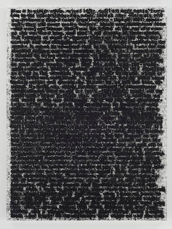 Working at the words of others, Ligon transforms seminal texts into paintings that hover at the edge of abstraction. The formal obfuscation that characterises his text-based works, which appear always under erasure – sous rature – obscures the found cultural artefacts he works with. Such is the Stranger series (1996 onwards) based on James Baldwin’s 1953 essay Stranger in the Village. Baldwin holds particular sway in Ligon’s works, not only because he, too, was black and queer, but because he understood the symbolic effect of language on its subject. “The root function of language,” Baldwin wrote, “is to control the universe by describing it.” Using black oil sticks and letter stencils, Ligon traces passages from Baldwin’s essay onto canvas, the oil smudging as he works, leaving the sentences largely illegible. “Literature,” the artist says by way of explanation, “has always been a treacherous site for black Americans because literary production has been so tied with the project of proving our humanity through the act of writing.”