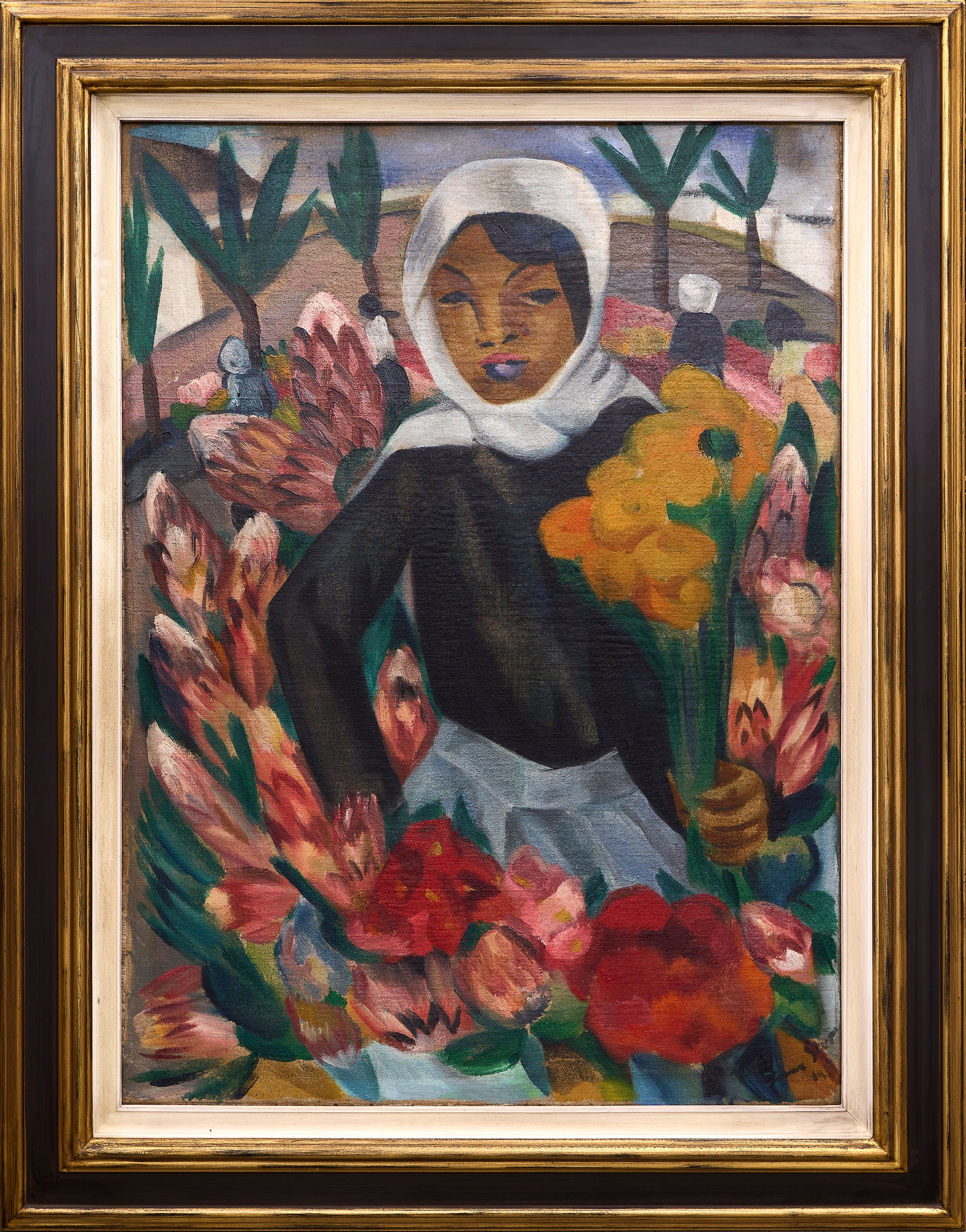 When Irma Stern returned to Cape Town from Berlin in 1920, she captured a moment in the city’s cultural history through a portrait of Armina Brenner, one of the matriarchs of Cape Town’s historic Adderley Street flower market. Armina was one of the five daughters of Hadira, who was recorded to be the first woman to sell flowers at the docks in Cape Town. The painting depicts Brenner holding indigenous flowers — a golden gerbera daisy and gladiolus stem — amidst a painterly thicket of proteas, all native to the Cape Floristic Region. The work reflects the artist's quest to reconnect with her African roots and her distinctive early style influenced by her Berlin mentor Max Pechstein, a renowned expressionist.