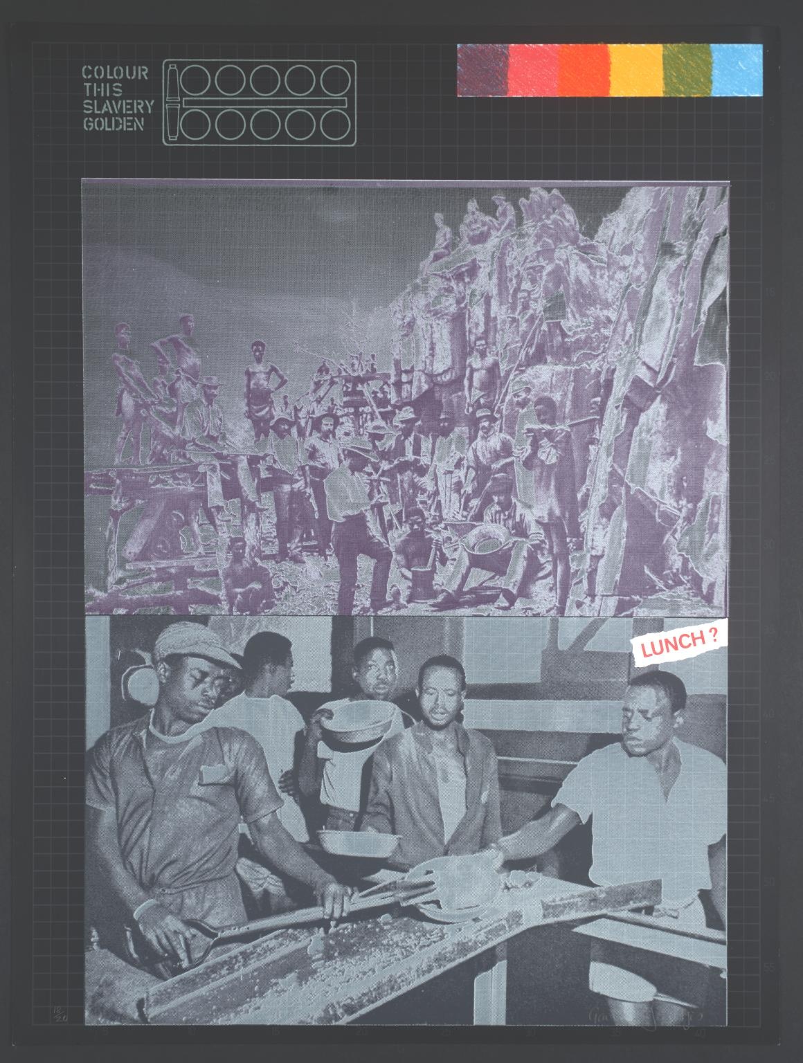 Artwork: Gavin Jantjes, Colour This Slavery Golden (A South African Colouring Book) (1974-5). Screenprint on card. 60.2 × 45.2 cm . Courtesy of Iziko South African National Gallery.