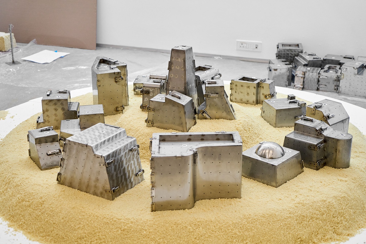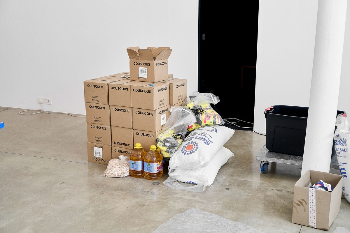 In (Untitled) Ghardaïa, Kader Attia considers the influence of Mozabite design on the modernist architects Le Corbusier and Fernand Pouillon. Recalling the Algerian town and mud architecture of Ghardaïa in a scale model made of couscous, Attia considers this aesthetic appropriation within a colonising mechanism. That the town’s Mozabite architecture informed Le Corbusier’s spatial design ethos is a fact unacknowledged yet patently apparent. In colonising the North African territory, the French may have transposed their European image on the subjugated land, but the image of Algeria was similarly transcribed onto colonial France. Pouillon’s social housing projects, built during the 1960s and 1970s on the outskirts of the French capital, is a particularly salient example. In Attia’s retelling, Pouillon made use of Algiers as an architectural testing ground in the 1950s, fashioning the structures that gathered Algerians en-masse into controlled urban centres. This ‘urban planning as control’ was then taken back, to be deployed in France following the withdrawal from its colonies. “Just as, historically, museums have accumulated objects in cabinets of curiosity,” critic Jane Ure-Smith offers as example, “post-colonial France now amasses the descendants of people from its former colonies in the ‘open-sky jails’ of the banlieues, north of Paris.” Shaped from the culinary staple of Algeria's Berber communities, Attia’s fragile construction evokes this confluence of influence. Accompanying the model are photocopied portraits of Le Corbusier and Pouillon, and the UNESCO certificate that declared Ghardaïa a World Heritage Site in 1982, two decades after the country gained independence.