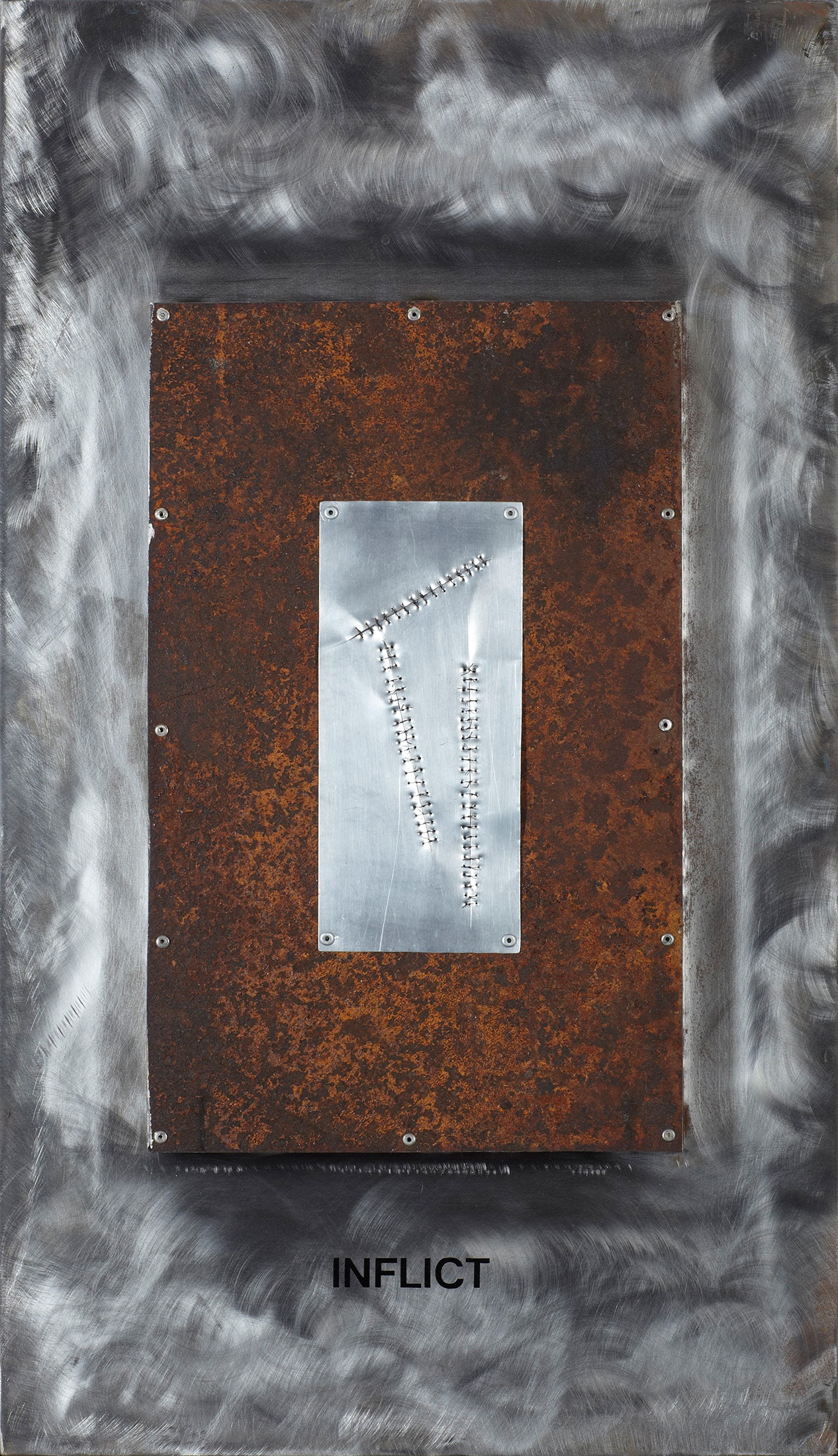 Artwork: Belinda Blignaut, Inflict (1993). Metal with sutures. 70 x 40 x 5 cm. Artwork courtesy of Jack Ginsberg. Image © Sebastian Voigt.
