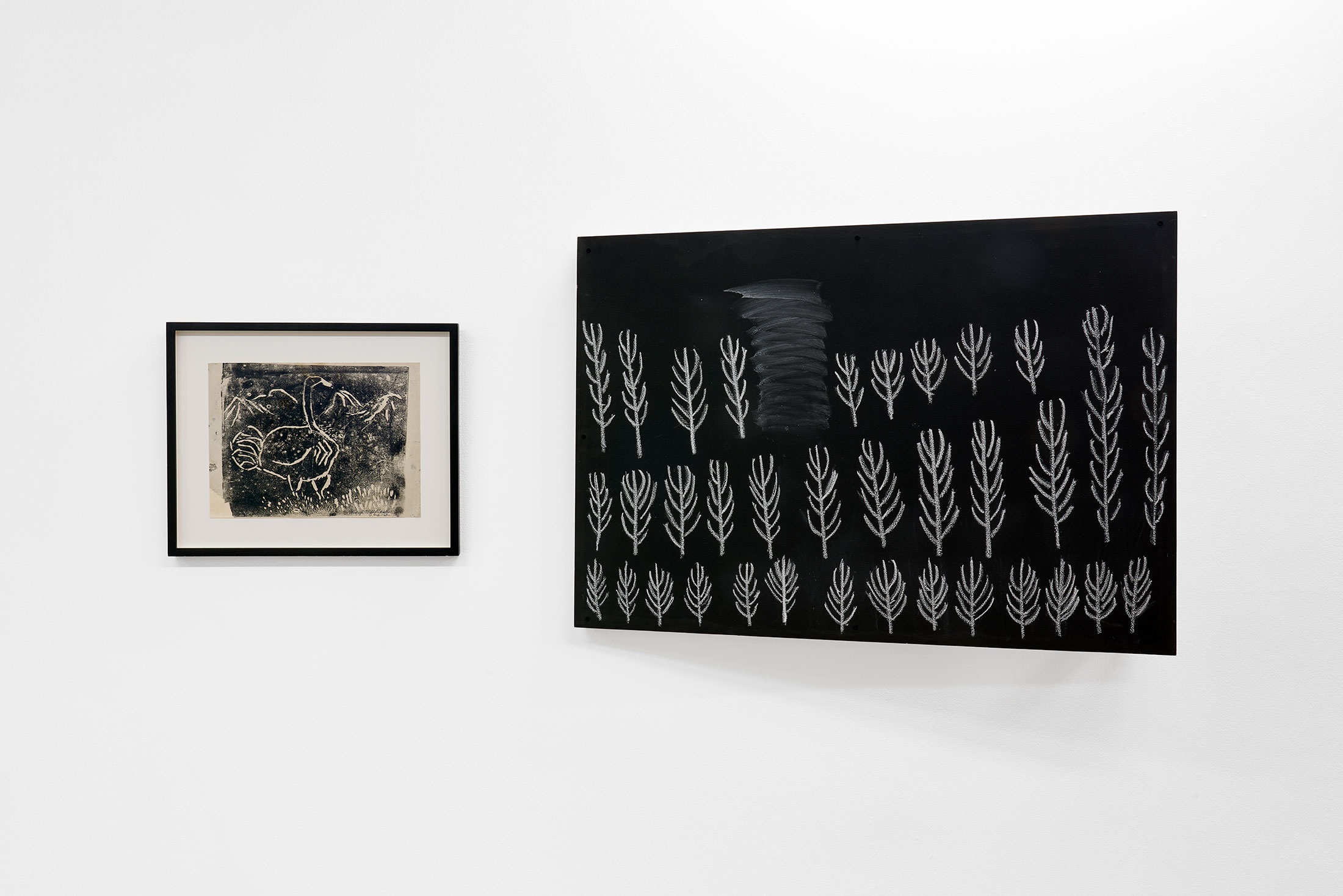 In this diptych, one from a series of similar stagings between chalk drawing and found artwork, Kemang Wa Lehulere pairs memory’s image against its near-likeness. This imperfect mirroring is a gesture of reclamation, where remembered impressions stand as testament in the absence of historical records. The project began with a chance encounter. While visiting his aunt, Sophia Lehulere, in Gugulethu, the township in which Wa Lehulere was raised, a neighbour dropped by with a copy of Elza Mile’s monograph NOMFANEKISO, who paints at night, the art of Gladys Mgudlandlu (2002). Sophia Lehulere recognised the paintings and told her nephew that she had met Mgudlandlu as a child in the early 1970s. As she recalled, the interior of the artist’s home was illuminated with murals. Wa Lehulere was unsure what to make of these remembered scenes, having no written or photographic record against which to test his aunt’s recollections. Sophia Lehulere had suffered a traumatic head injury during the student uprising in 1976, a subject on which she remained silent. Any mention of apartheid and its manifold violences was proscribed in her presence; a history muted by a gunshot wound. But she continued to describe the murals in intricate detail, remembering their colours first, their images second.