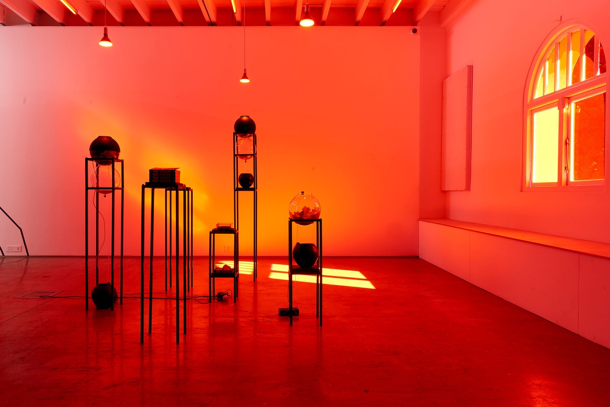 garden for fanon presents a complex bioactive system of metal stands, books, and glass globes, assembled to accelerate the activity of a community of earthworms. The protocols accompanying the installation have a two-fold effect: the carer is instructed to feed the worms and maintain a conducive environment, and the worms process copies of Pan-Africanist philosopher and psychologist Frantz Fanon’s The Wretched of the Earth, converting the fibre of the books into fertiliser. “The worms are making soil as they’re eating books – this is a game of meaning,” says Dennis. “There is something funny about having worms in a gallery, eating a book. What makes it funny is what gives it weight.” Fanon concludes The Wretched of the Earth by imploring the reader to flee from motionless movement. Dennis similarly states, “Routines or procedural structures contain action... They delineate the possible, and then produce reality through that delineation.” In garden for fanon, Dennis petitions his audience to enact a procedural care – to tend to the garden, to ensure the survival of the earthworms, to feed soil with knowledge – while digesting history’s complexities.