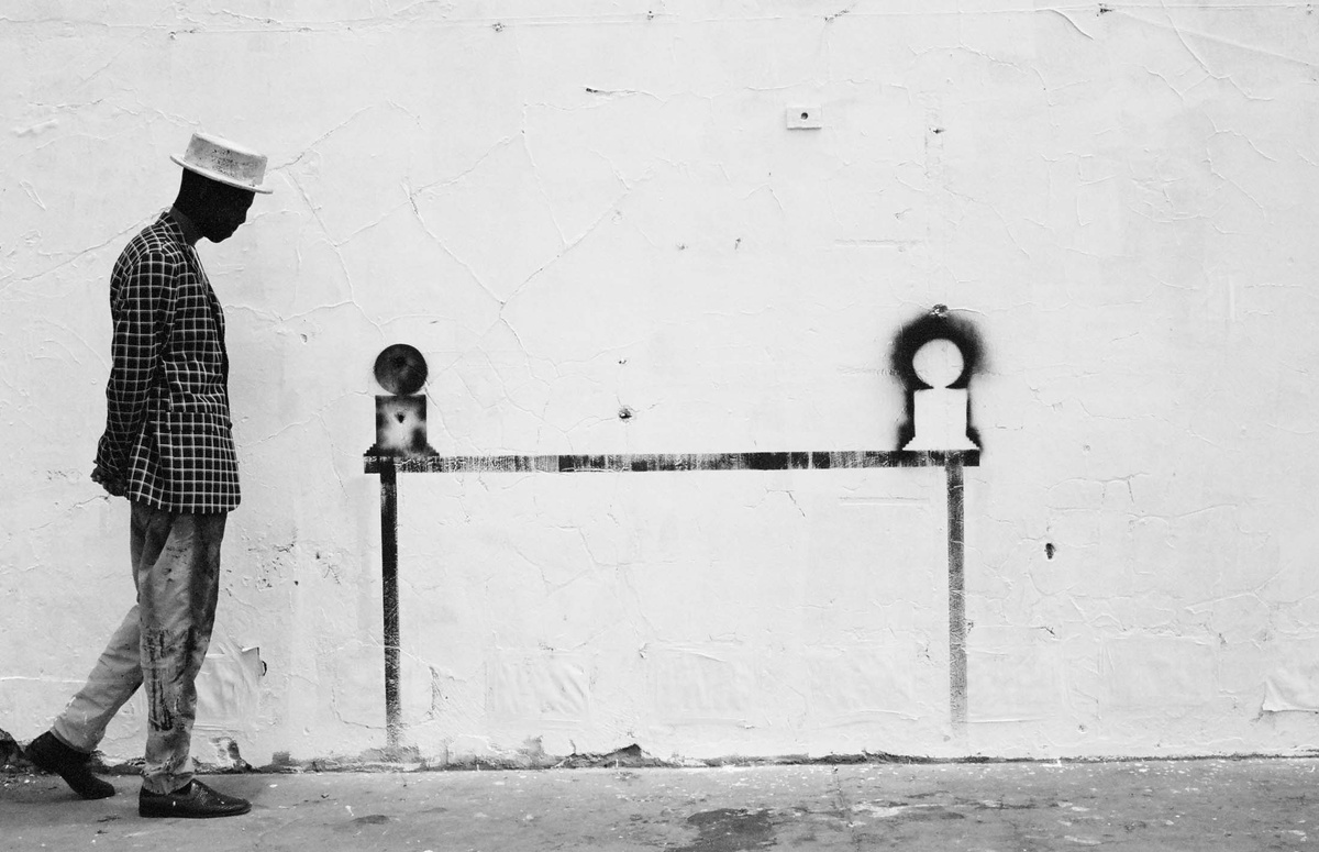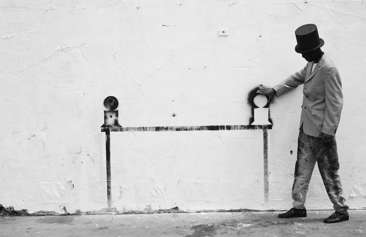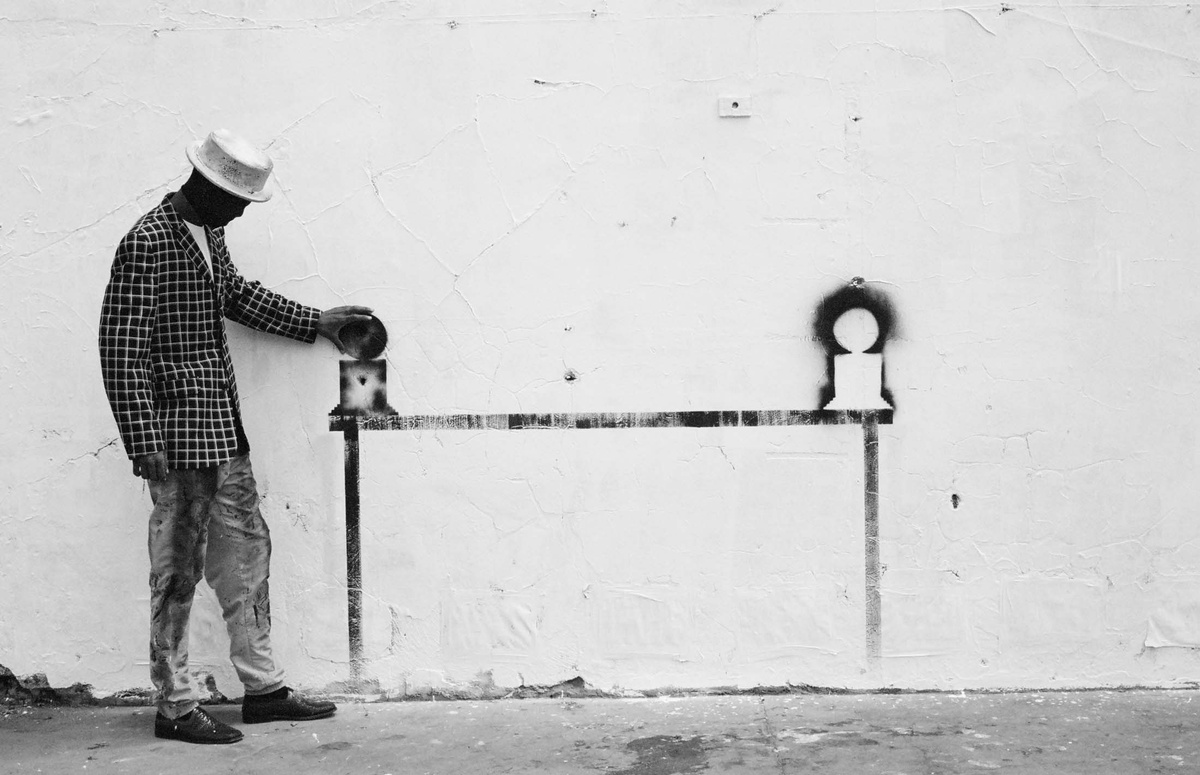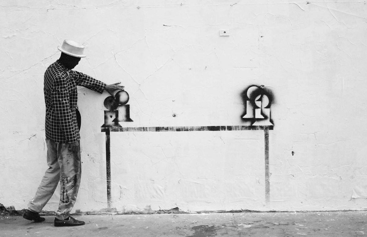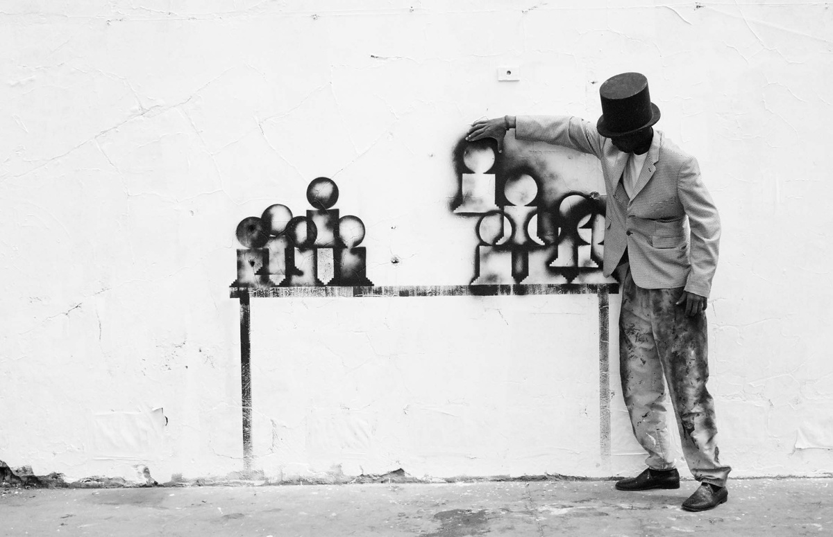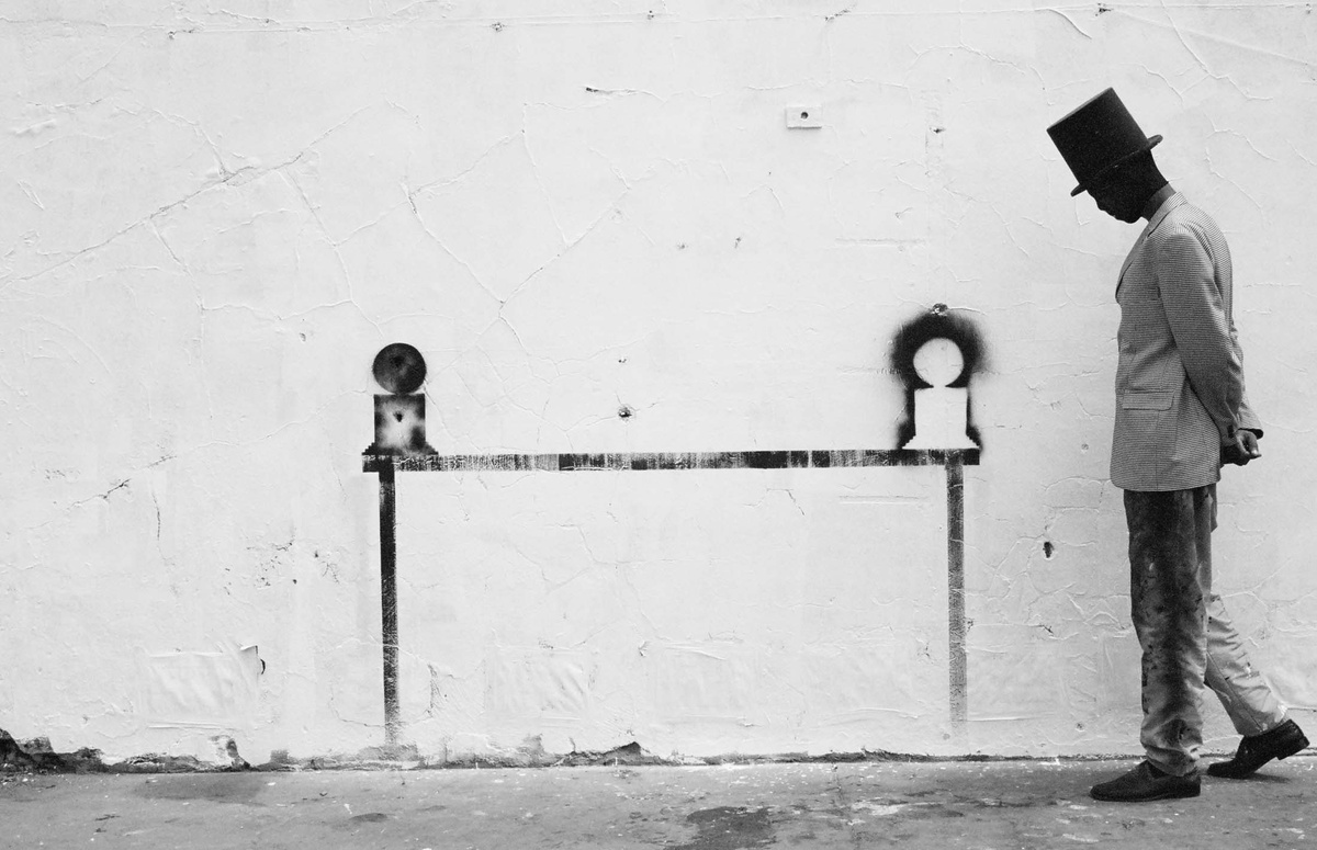 In all Robin Rhode’s work, line is primary – as formal device, as progression, as narrative structure. With the simplest propositions, he gives expression to imagined scenes. His work more often persists as document, the original offering only transitory. In charcoal, chalk and paint, Rhode creates sites of engagement within the city. The sidewalk becomes stage; an actor, always anonymous, appears. A series of photographs are taken, a stop-frame animation is made. Performance, drawing, photograph – the resulting works are all these mediums distilled to image, be it static or moving. The scene is later painted over; the actor departs; the set returns to inner-city wall. Largely produced in Rhode’s native Johannesburg, the works’ political implications are apparent, touching on such issues as urban poverty and violence, street culture and its aspirations. Rhode, however, considers himself more a formalist than social messenger, an artist concerned with mimesis – with art’s illusion – and the many tensions between image and object; the two-dimensional and the three-dimensional, represented and real. This is particularly true of his more recent work, which pairs both colour theory and geometry with the performing body.
